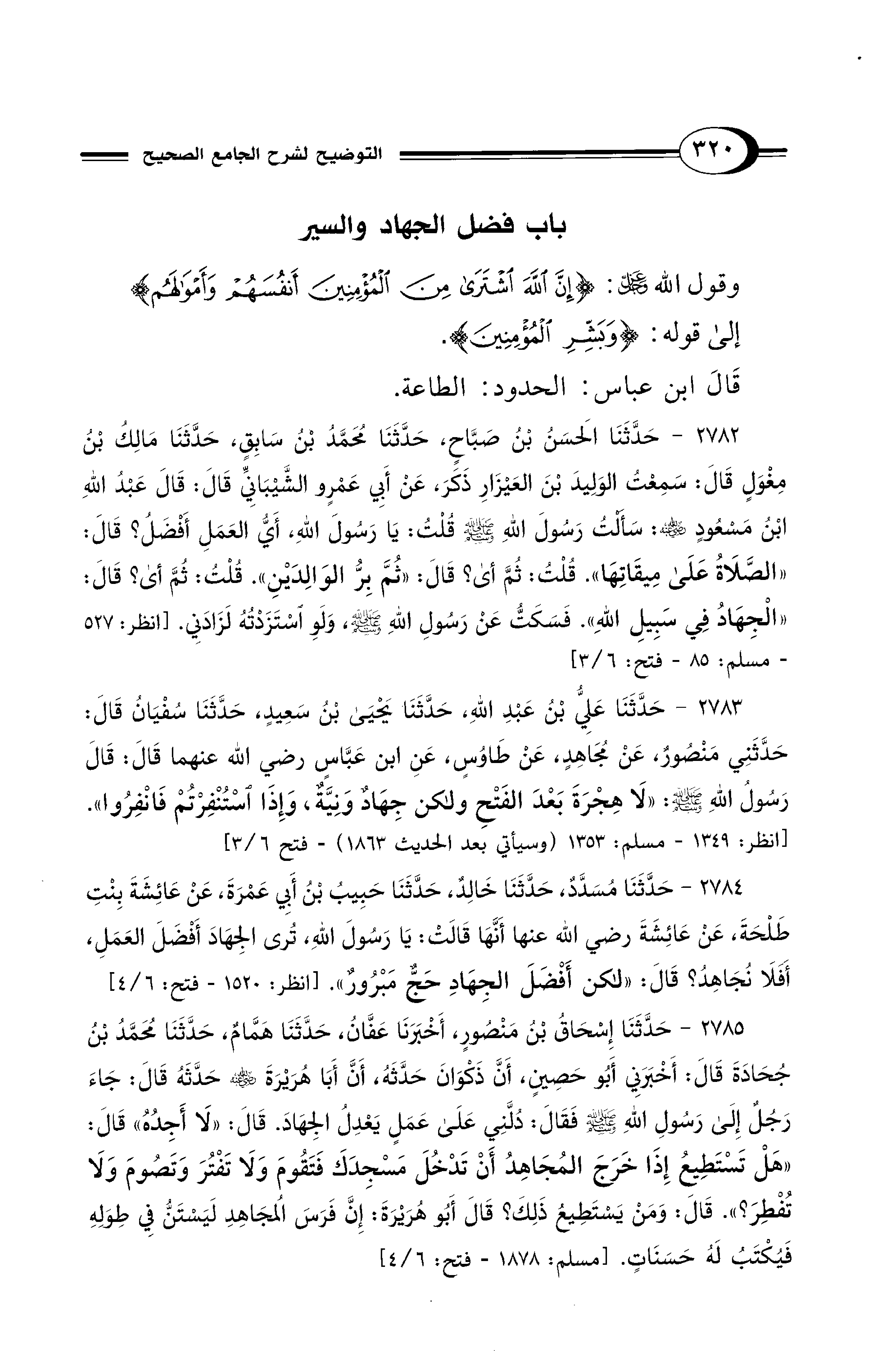 وَقَوْلُ اللهِ -عَزَّ وَجَلَّ-: {إِنَّ اللهَ اشْتَرَى مِنَ الْمُؤْمِنِينَ أَنْفُسَهُمْ وَأَمْوَالَهُمْ} إِلَى قَوْلِهِ {وَبَشِّرِ الْمُؤْمِنِينَ}. قَالَ ابن عباس الحدود: الطاعة.