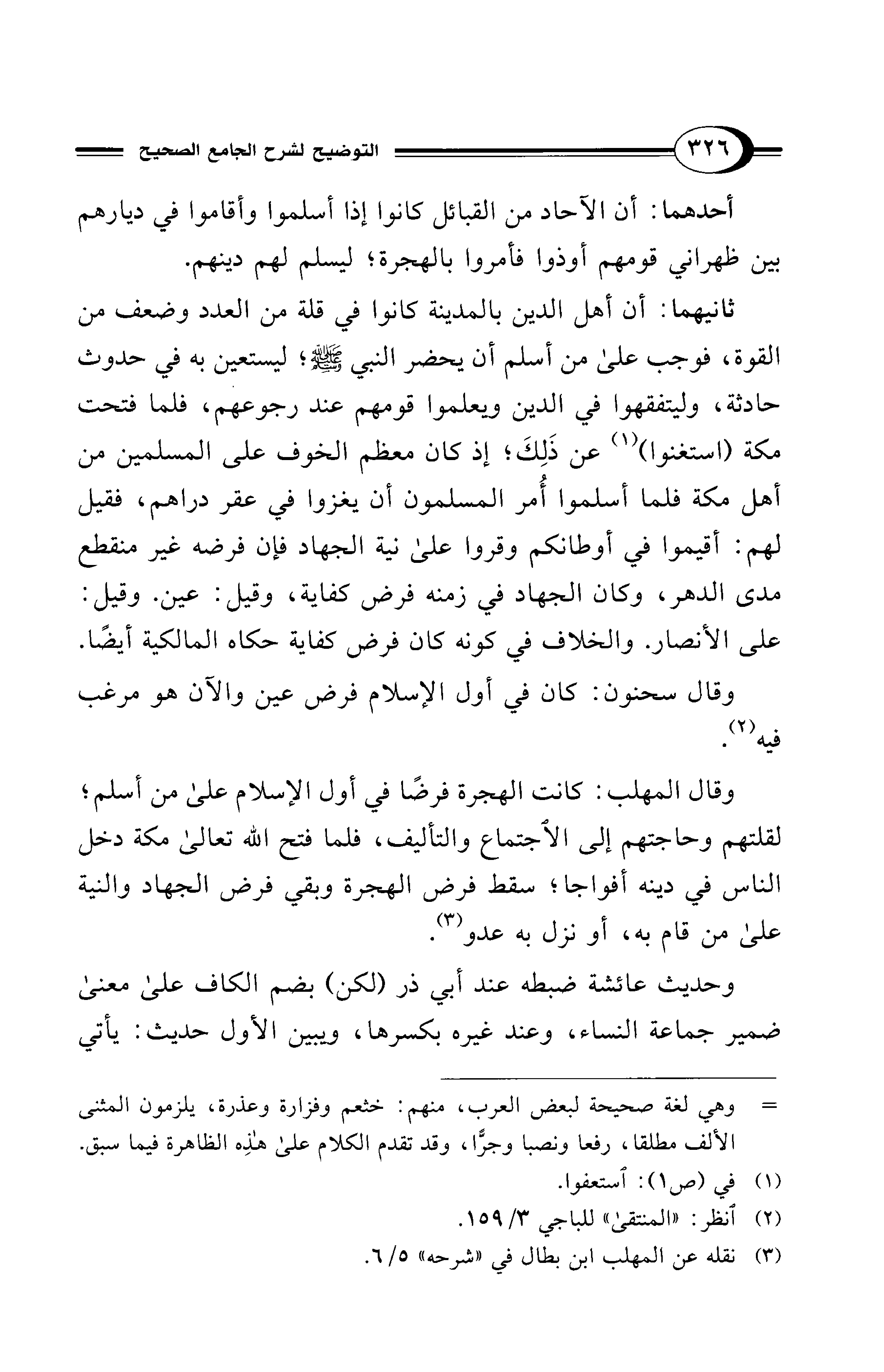 وقال المهلب: كانت الهجرة فرضًا في أول الإسلام على من أسلم؛ لقلتهم وحاجتهم إلى الاجتماع والتأليف، فلما فتح الله تعالى مكة دخل الناس في دينه أفواجا؛ سقط فرض الهجرة وبقي فرض الجهاد والنية على من قام به، أو نزل به عدو (¬3).