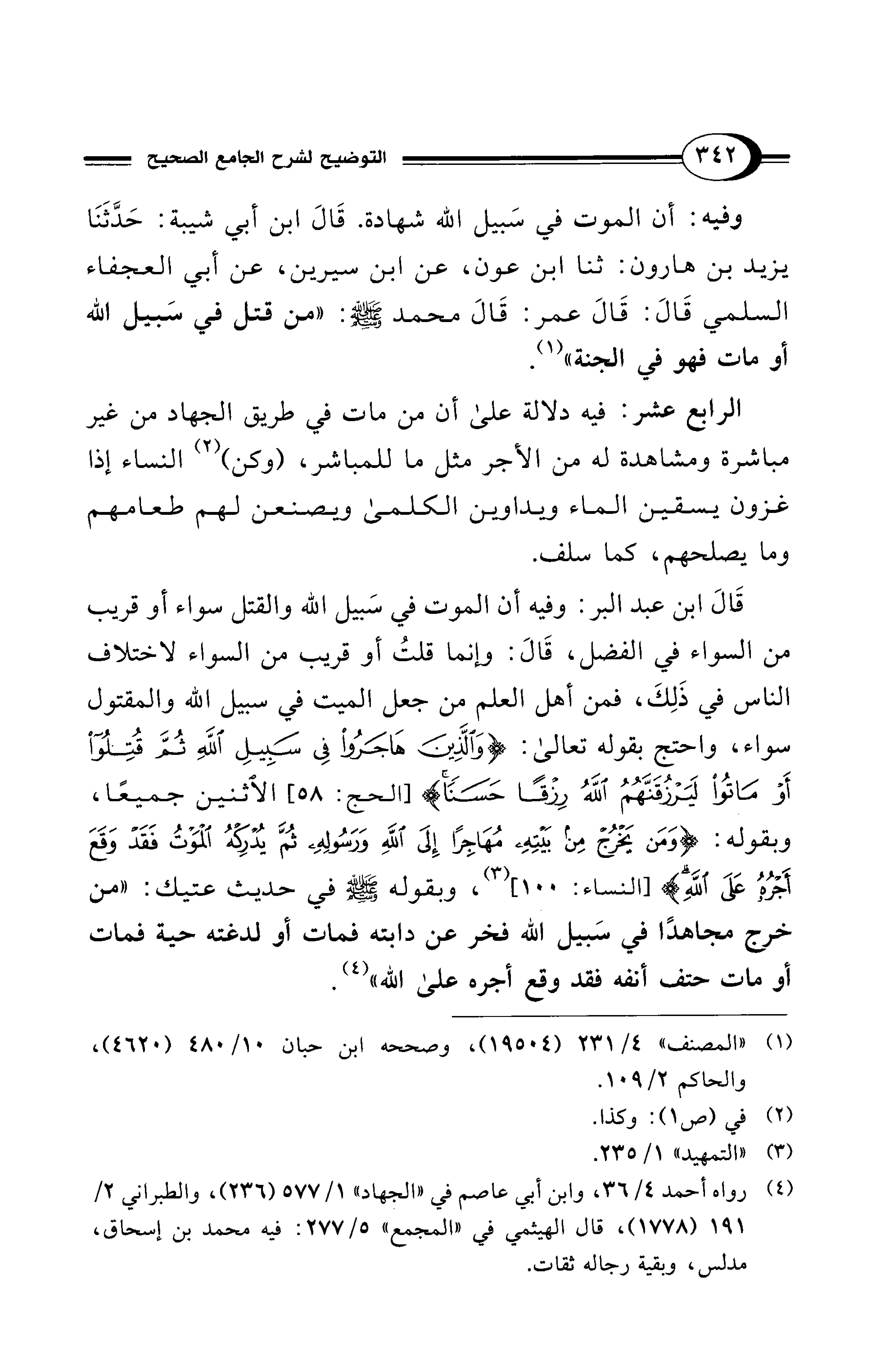 وفيه: أن الموت في سَبيل الله شهادة. قَالَ ابن أبي شيبة: حَدَّثَنَا يزيد بن هارون: ثنا ابن عون، عن ابن سيرين، عن أبي العجفاء السلمي قَالَ: قَالَ عمر: قَالَ محمد - صلى الله عليه وسلم -: "من قتل في سَبيل الله أو مات فهو في الجنة" (¬1).
