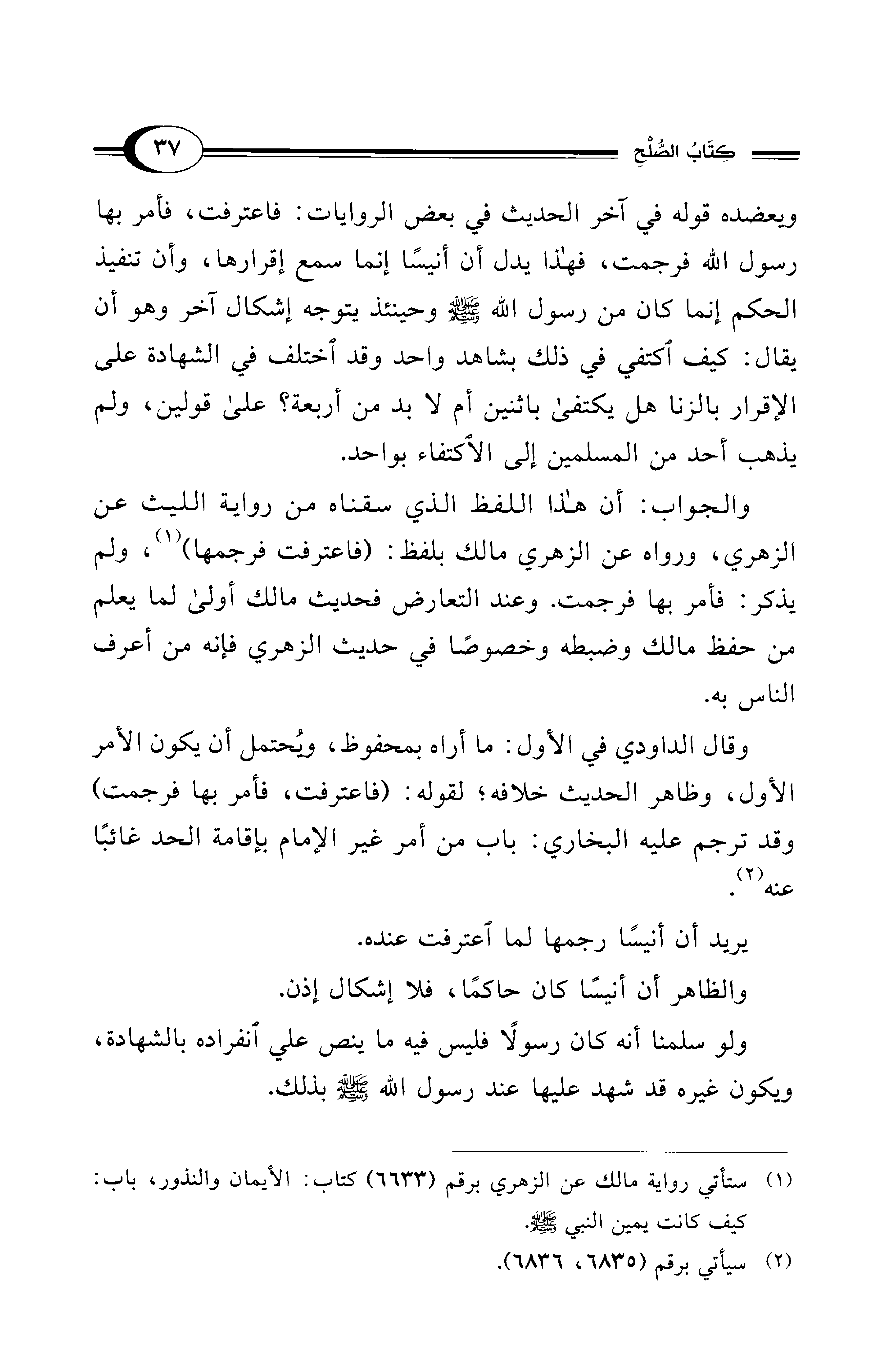 ويعضده قوله في آخر الحديث في بعض الروايات: فاعترفت، فأمر بها رسول الله فرجمت، فهذا يدل أن أنيسًا إنما سمع إقرارها، وأن تنفيذ الحكم إنما كان من رسول الله - صلى الله عليه وسلم - وحينئذ يتوجه إشكال آخر وهو أن يقال: كيف اكتفي في ذلك بشاهد واحد وقد اختلف في الشهادة على الإقرار بالزنا هل يكتفي باثنين أم لا بد من أربعة؟ على قولين، ولم يذهب أحد من المسلمين إلى الاكتفاء بواحد.
