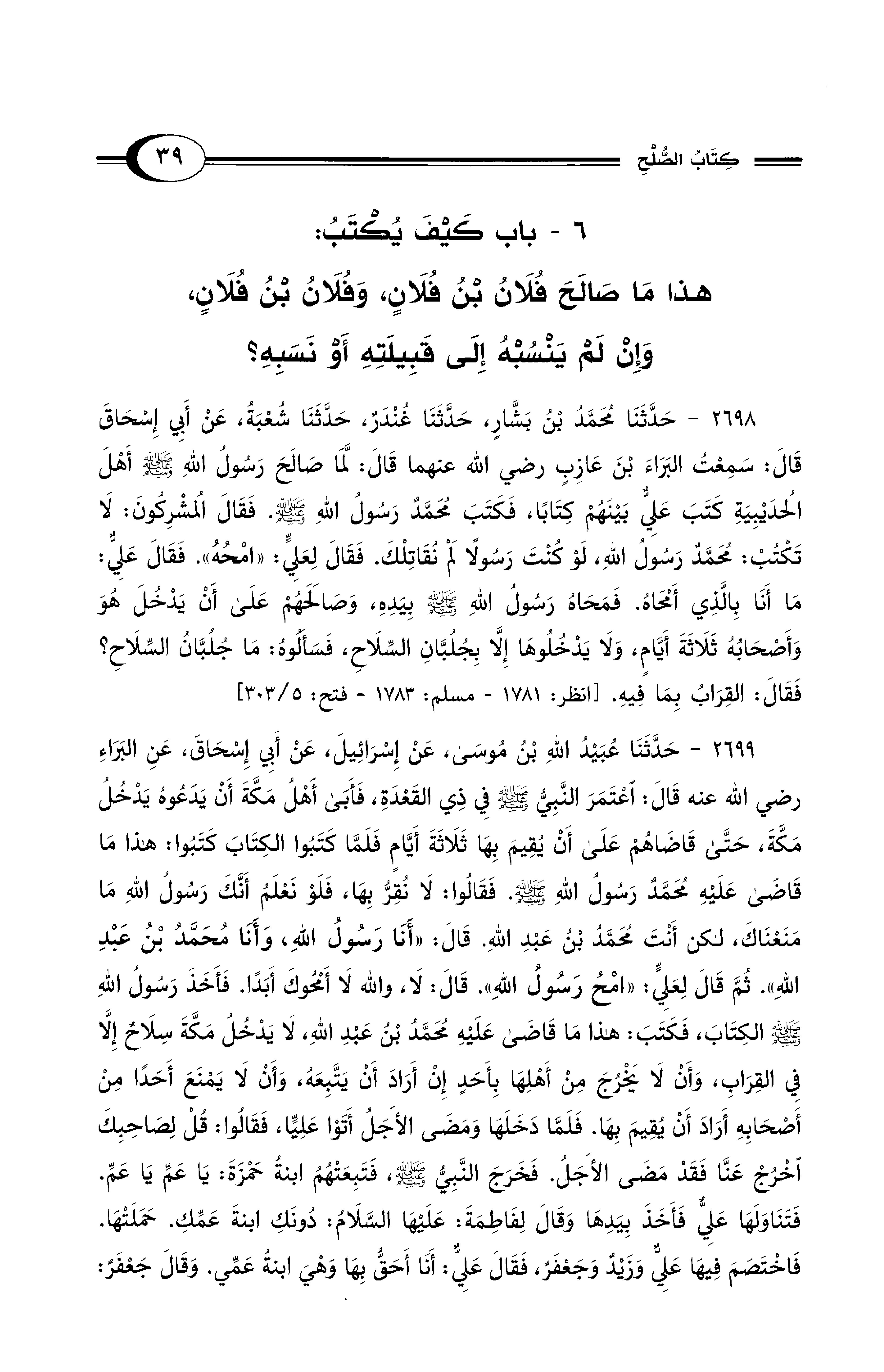 2698 - حَدَّثَنَا مُحَمَّدُ بْنُ بَشَّارٍ، حَدَّثَنَا غُنْدَرٌ، حَدَّثَنَا شُعْبَةُ، عَنْ أَبِي إِسْحَاقَ قَالَ: سَمِعْتُ البَرَاءَ بْنَ عَازِبٍ رضي الله عنهما قَالَ: لَمَّا صَالَحَ رَسُولُ اللهِ - صلى الله عليه وسلم - أَهْلَ الحُدَيْبِيَةِ كَتَبَ عَلِيٌّ بَيْنَهُمْ كِتَابًا، فَكَتَبَ مُحَمَّدٌ رَسُولُ اللهِ - صلى الله عليه وسلم -. فَقَالَ المُشْرِكُونَ: لَا تَكْتُبْ مُحَمَّدٌ رَسُولُ اللهِ، لَوْ كُنْتَ رَسُولًا لَمْ نُقَاتِلْكَ. فَقَالَ لِعَلِيٍّ: "امْحُهُ". فَقَالَ عَلِيٌّ: مَا أَنَا بِالذِي أَمْحَاهُ. فَمَحَاهُ رَسُولُ اللهِ - صلى الله عليه وسلم - بِيَدِهِ، وَصَالَحَهُمْ عَلَى أَنْ يَدْخُلَ هُوَ وَأَصْحَابُهُ ثَلاَثَةَ أَيَّامٍ، وَلَا يَدْخُلُوهَا إِلَّا بِجُلُبَّانِ السِّلاَحِ، فَسَأَلُوهُ: مَا جُلُبَّانُ السِّلاَحِ؟ فَقَالَ: القِرَابُ بِمَا فِيهِ. [انظر: 1781 - مسلم: 1783 - فتح: 5/ 303]