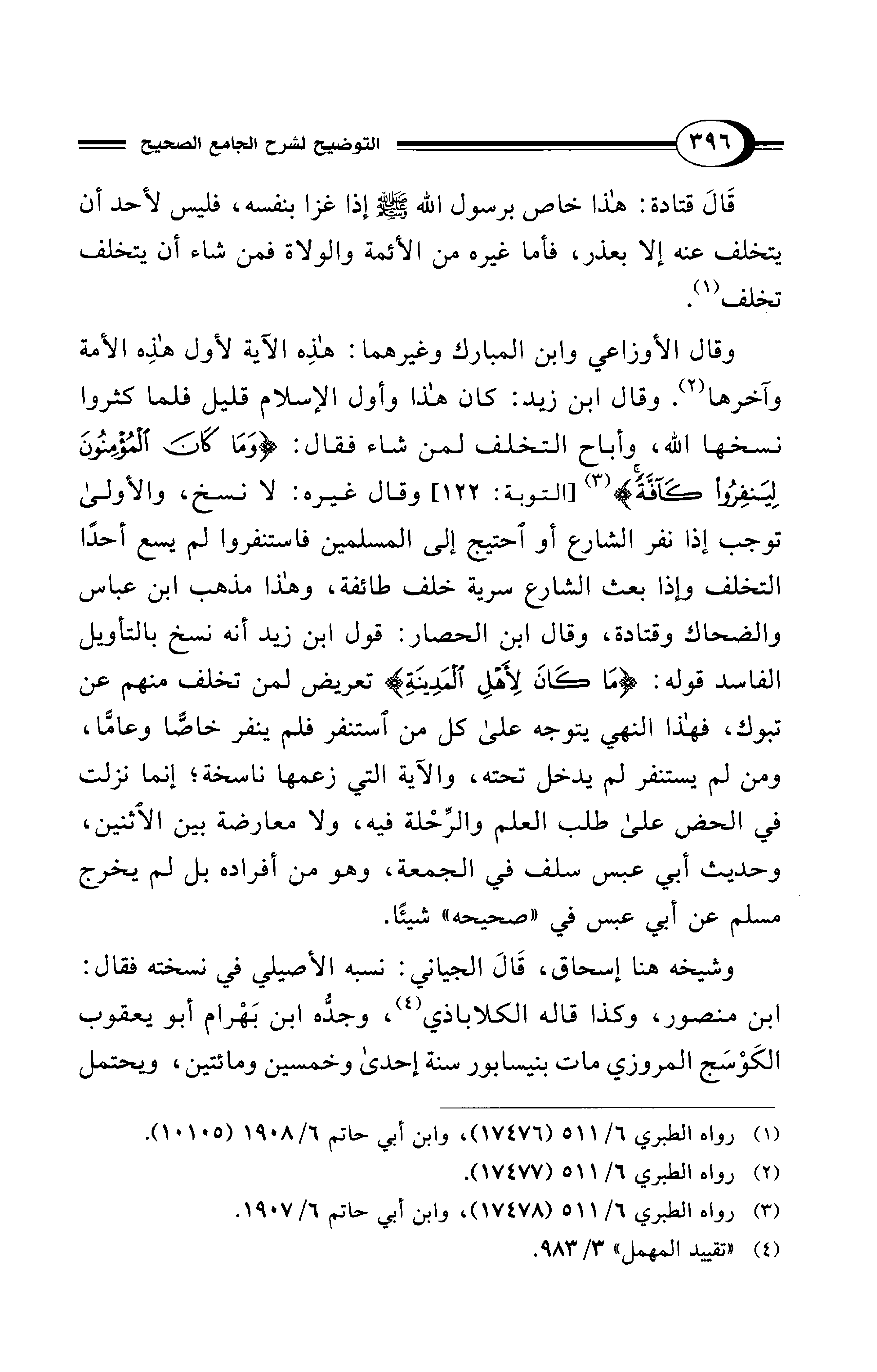 وقال الأوزاعي وابن المبارك وغيرهما: هذِه الآية لأول هذِه الأمة وآخرها (¬2). وقال ابن زيد: كان هذا وأول الإسلام قليل فلما كثروا نسخها الله، وأباح التخلف لمن شاء فقال: {وَمَا كَانَ الْمُؤْمِنُونَ لِيَنْفِرُوا كَافَّةً} (¬3) [التوبة: 122] وقال غيره: لا نسخ، والأولى توجب إذا نفر الشارع أو احتيج إلى المسلمين فاستنفروا لم يسع أحدًا التخلف وإذا بعث الشارع سرية خلف طائفة، وهذا مذهب ابن عباس والضحاك وقتادة، وقال ابن الحصار: قول ابن زيد أنه نسخ بالتأويل الفاسد قوله: {مَا كَانَ لِأَهْلِ الْمَدِينَةِ} تعريض لمن تخلف منهم عن تبوك، فهذا النهي يتوجه على كل من استنفر فلم ينفر خاصًّا وعامًّا، ومن لم يستنفر لم يدخل تحته، والآية التي زعمها ناسخة؛ إنما نزلت في الحض على طلب العلم والرِّحْلة فيه، ولا معارضة بين الاثنين، وحديث أبي عبس سلف في الجمعة، وهو من أفراده بل لم يخرج مسلم عن أبي عبس في "صحيحه" شيئًا.