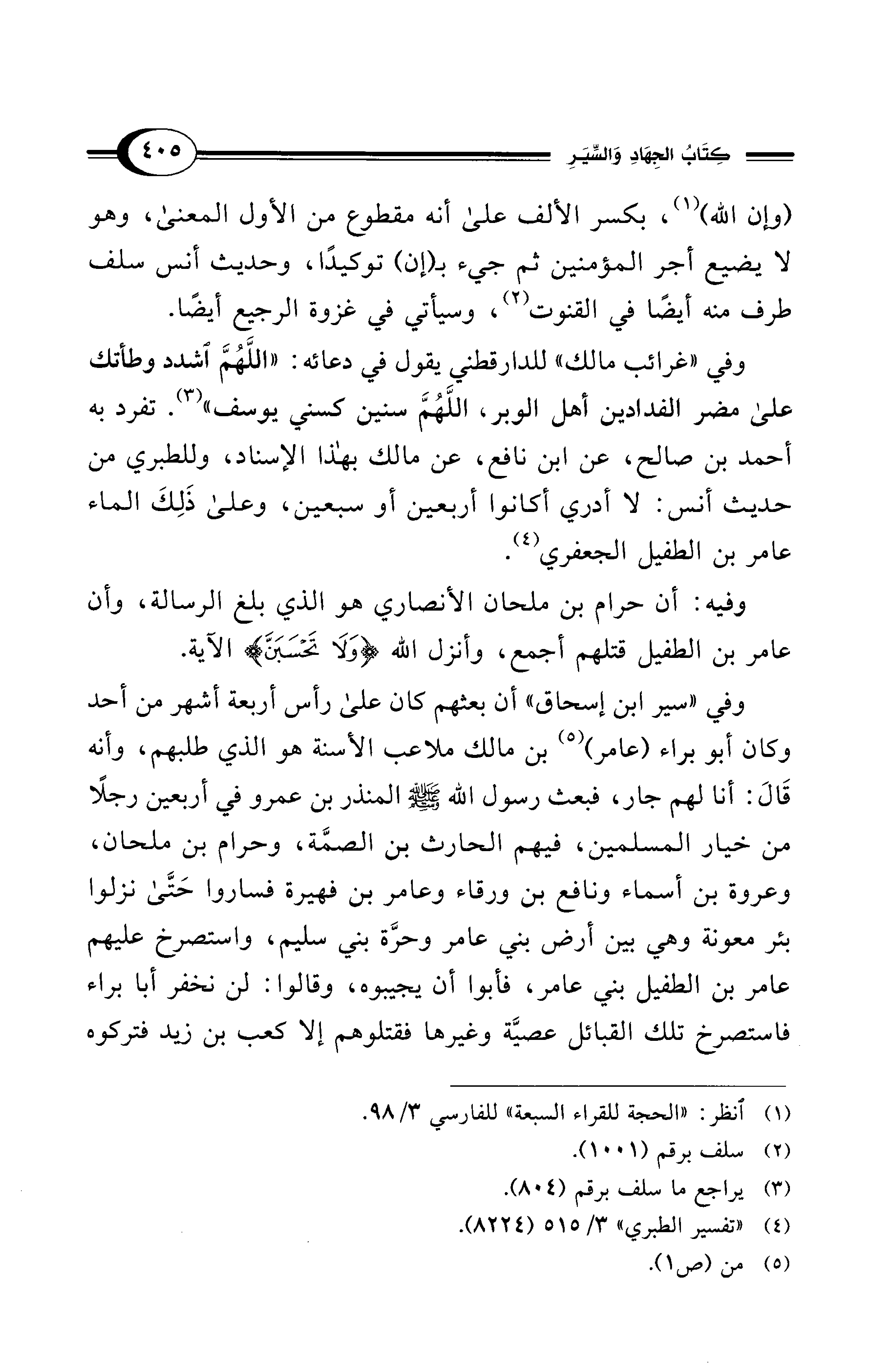 وفي "غرائب مالك" للدارقطني يقول في دعائه: "اللَّهُمَّ اشدد وطأتك على مضر الفدادين أهل الوبر، اللَّهُمَّ سنين كسني يوسف" (¬3). تفرد به أحمد بن صالح، عن ابن نافع، عن مالك بهذا الإسناد، وللطبري من حديث أنس: لا أدري أكانوا أربعين أو سبعين، وعلى ذَلِكَ الماء عامر بن الطفيل الجعفري (¬4).