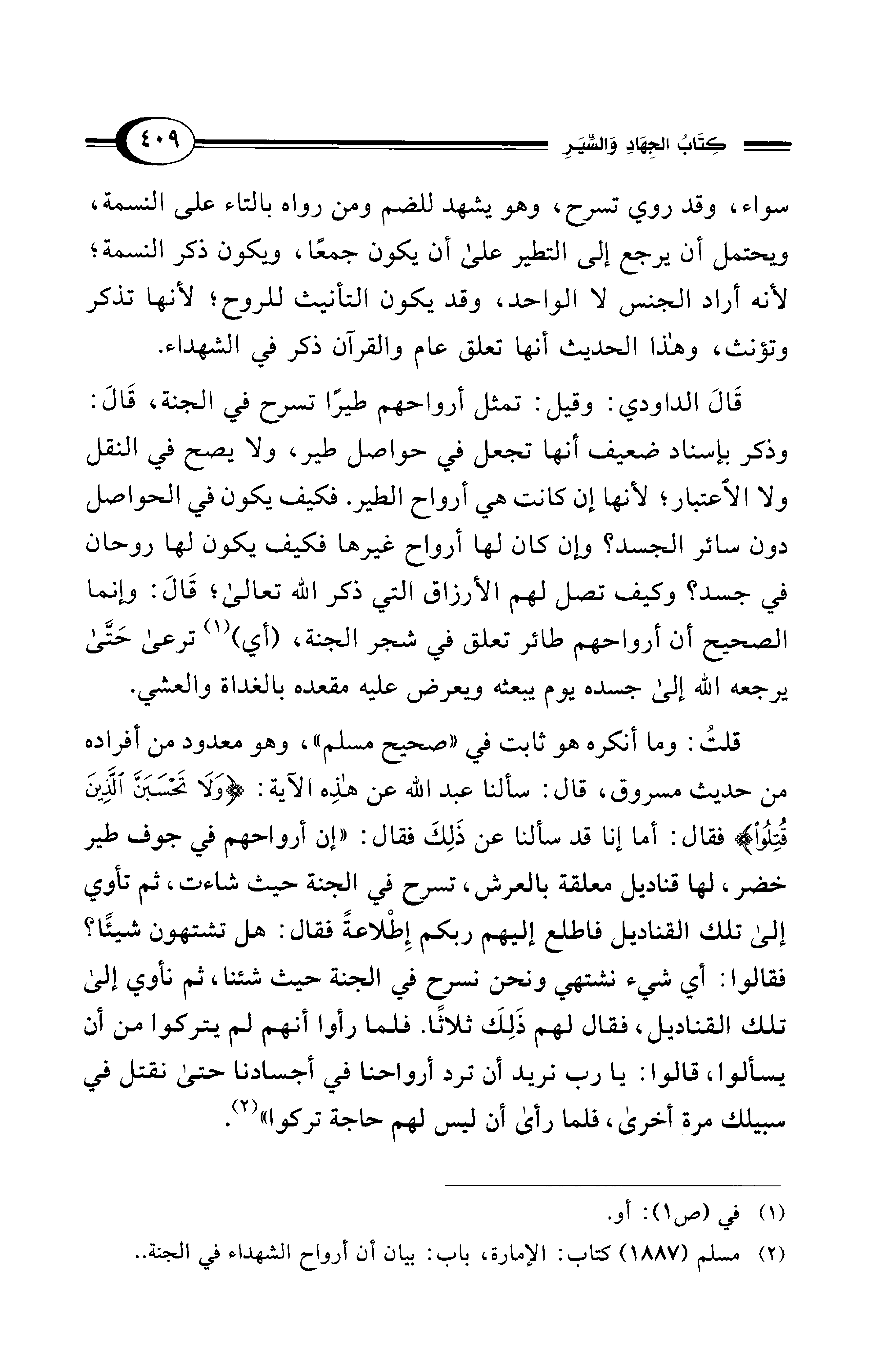 قلتُ: وما أنكره هو ثابت في "صحيح مسلم"، وهو معدود من أفراده من حديث مسروق، قال: سألنا عبد الله عن هذِه الآية: {وَلَا تَحْسَبَنَّ الَّذِينَ قُتِلُوا} فقال: أما إنا قد سألنا عن ذَلِكَ فقال: "إن أرواحهم في جوف طير خضر، لها قناديل معلقة بالعرش، تسرح في الجنة حيث شاءت، ثم تأوي إلى تلك القناديل فاطلع إليهم ربكم إِطْلاعةً فقال: هل تشتهون شيئًا؟ فقالوا: أي شيء نشتهي ونحن نسرحِ في الجنة حيث شئنا، ثم نأوي إلى تلك القناديل، فقال لهم ذَلِكَ ثلاثًا. فلما رأوا أنهم لم يتركوا من أن يسألوا، قالوا: يا رب نريد أن ترد أرواحنا في أجسادنا حتى نقتل في سبيلك مرة أخرى، فلما رأى أن ليس لهم حاجة تركوا" (¬2).