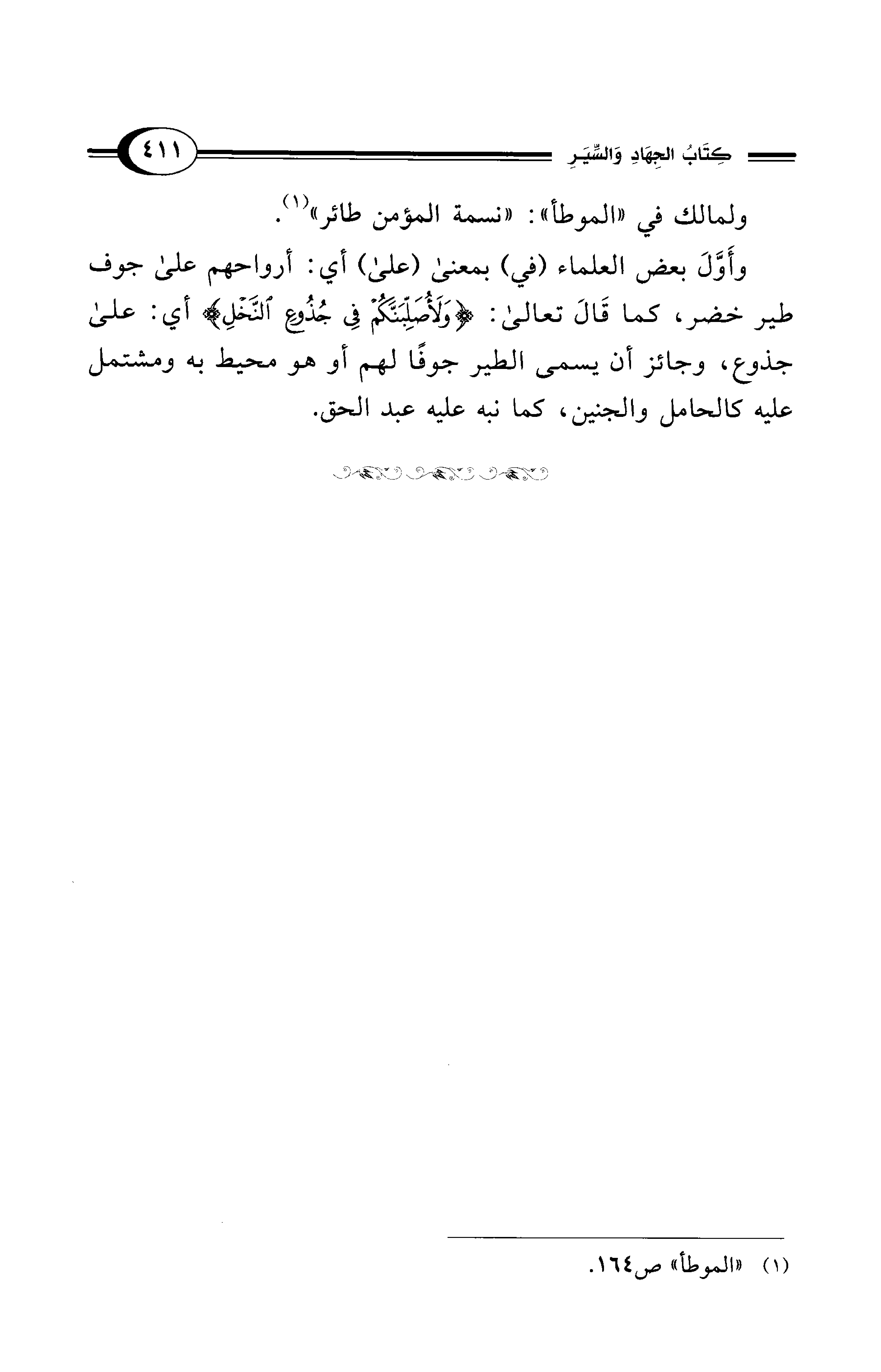 وأَوَّلَ بعض العلماء (في) بمعنى (على) أي: أرواحهم على جوف طير خضر، كما قَالَ تعالى: {وَلَأُصَلِّبَنَّكُمْ فِي جُذُوعِ النَّخْلِ} أي: على جذوع، وجائز أن يسمى الطير جوفًا لهم أو هو محيط به ومشتمل عليه كالحامل والجنين، كما نبه عليه عبد الحق.