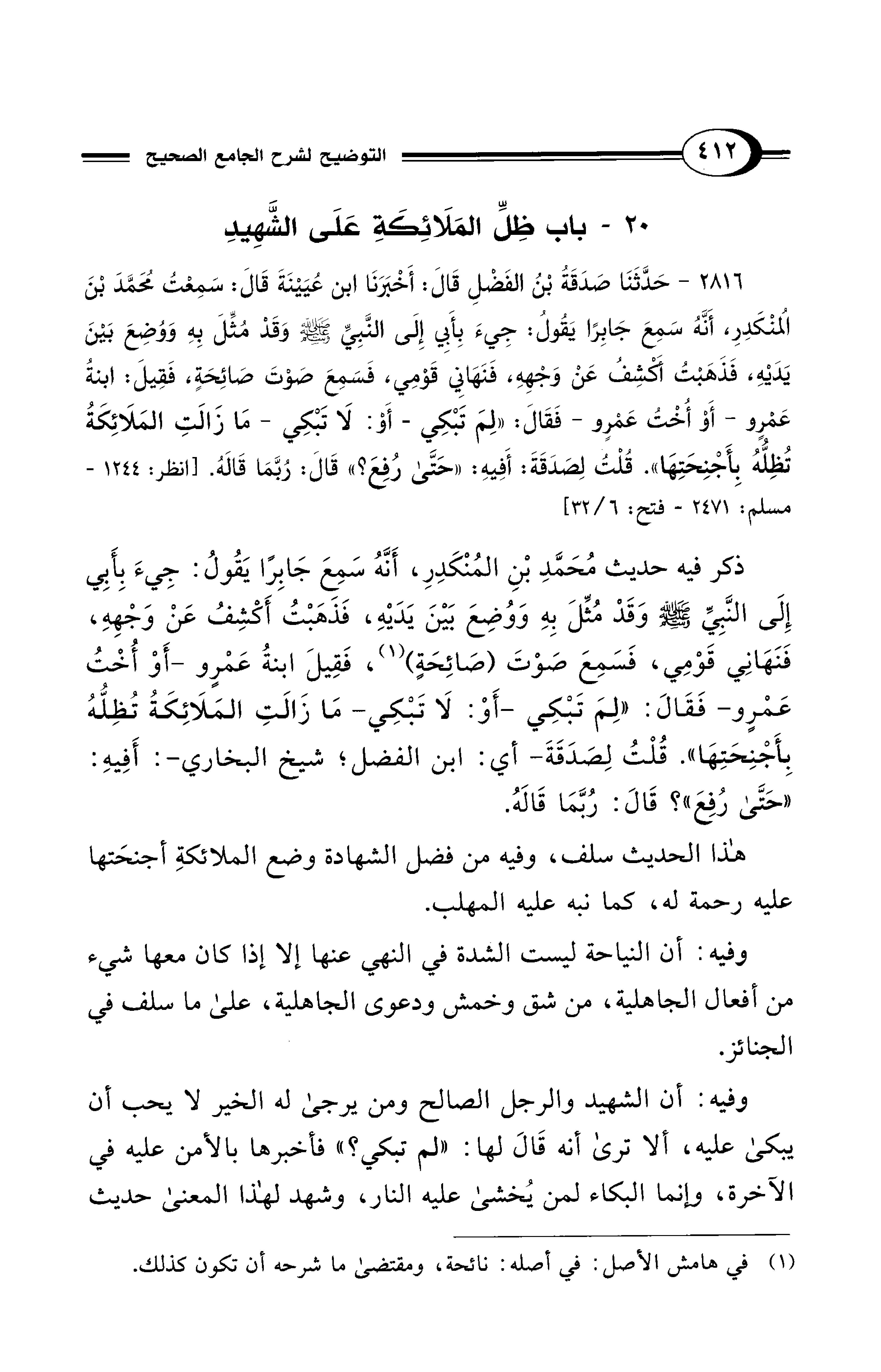 ذكر فيه حديث مُحَمَّدِ بْنِ المُنْكَدِرِ، أَنَّهُ سَمِعَ جَابِرًا يَقُولُ: جِيءَ بِأَبِي إِلَى النَّبِيِّ - صلى الله عليه وسلم - وَقَدْ مُثِّلَ بِهِ وَوُضِعَ بَيْنَ يَدَيْهِ، فَذهَبْتُ أَكْشِفُ عَنْ وَجْهِهِ، فَنَهَانِي قَوْمِي، فَسَمِعَ صوْتَ (صَائِحَةٍ) (¬1)، فَقِيلَ ابنةُ عَمْرٍو -أَوْ أُخْتُ عَمْرٍو- فَقَالَ: "لِمَ تَبْكِي -أَوْ: لَا تَبْكِي- مَا زَالَتِ المَلَائِكَةُ تُظِلُّهُ بِأَجْنِحَتِهَا". قُلْتُ لِصَدَقَةَ -أي: ابن الفضل؛ شيخ البخاري-: أَفِيهِ: "حَتى رُفِعَ"؟ قَالَ: رُبَّمَا قَالَهُ.