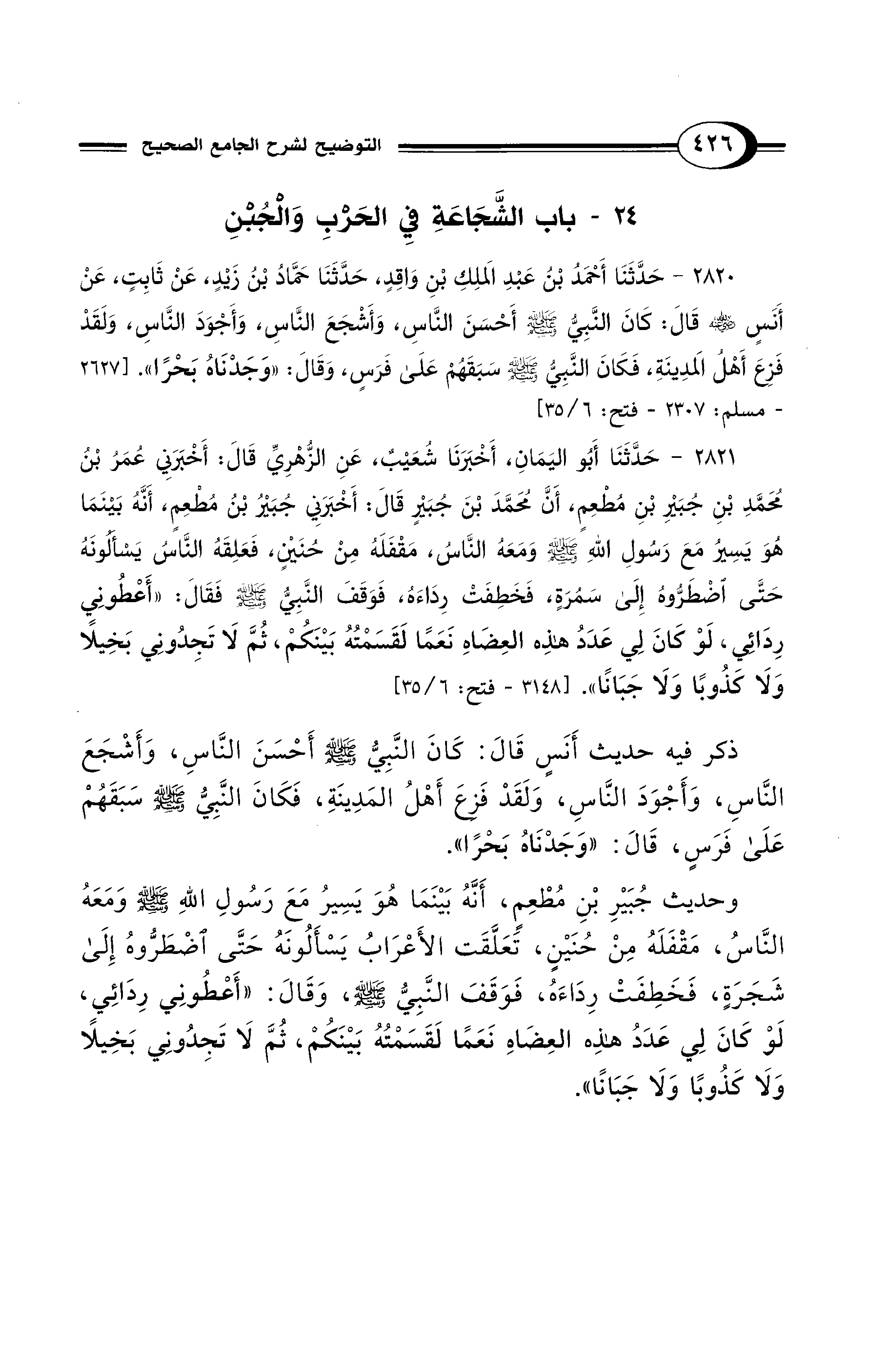 2821 - حَدَّثَنَا أَبُو اليَمَانِ، أَخْبَرَنَا شُعَيْبٌ، عَنِ الزُّهْرِيِّ قَالَ: أَخْبَرَنِي عُمَرُ بْنُ مُحَمَّدِ بْنِ جُبَيْرِ بْنِ مُطْعِمٍ، أَنَّ مُحَمَّدَ بْنَ جُبَيْرٍ قَالَ: أَخْبَرَنِي جُبَيْرُ بْنُ مُطْعِمٍ، أَنَّهُ بَيْنَمَا هُوَ يَسِيرُ مَعَ رَسُولِ اللهِ - صلى الله عليه وسلم - وَمَعَهُ النَّاسُ، مَقْفَلَهُ مِنْ حُنَيْنٍ، فَعَلِقَهُ النَّاسُ يَسْأَلُونَهُ حَتَّى اضْطَرُّوهُ إِلَى سَمُرَةٍ، فَخَطِفَتْ رِدَاءَهُ، فَوَقَفَ النَّبِيُّ - صلى الله عليه وسلم - فَقَالَ: " أَعْطُونِي رِدَائِي، لَوْ كَانَ لِي عَدَدُ هَذِهِ العِضَاهِ نَعَمًا لَقَسَمْتُهُ بَيْنَكُمْ، ثُمَّ لاَ تَجِدُونِي بَخِيلاً وَلاَ كَذُوبًا وَلاَ جَبَانًا". [3148 - فتح: 6/ 35]
