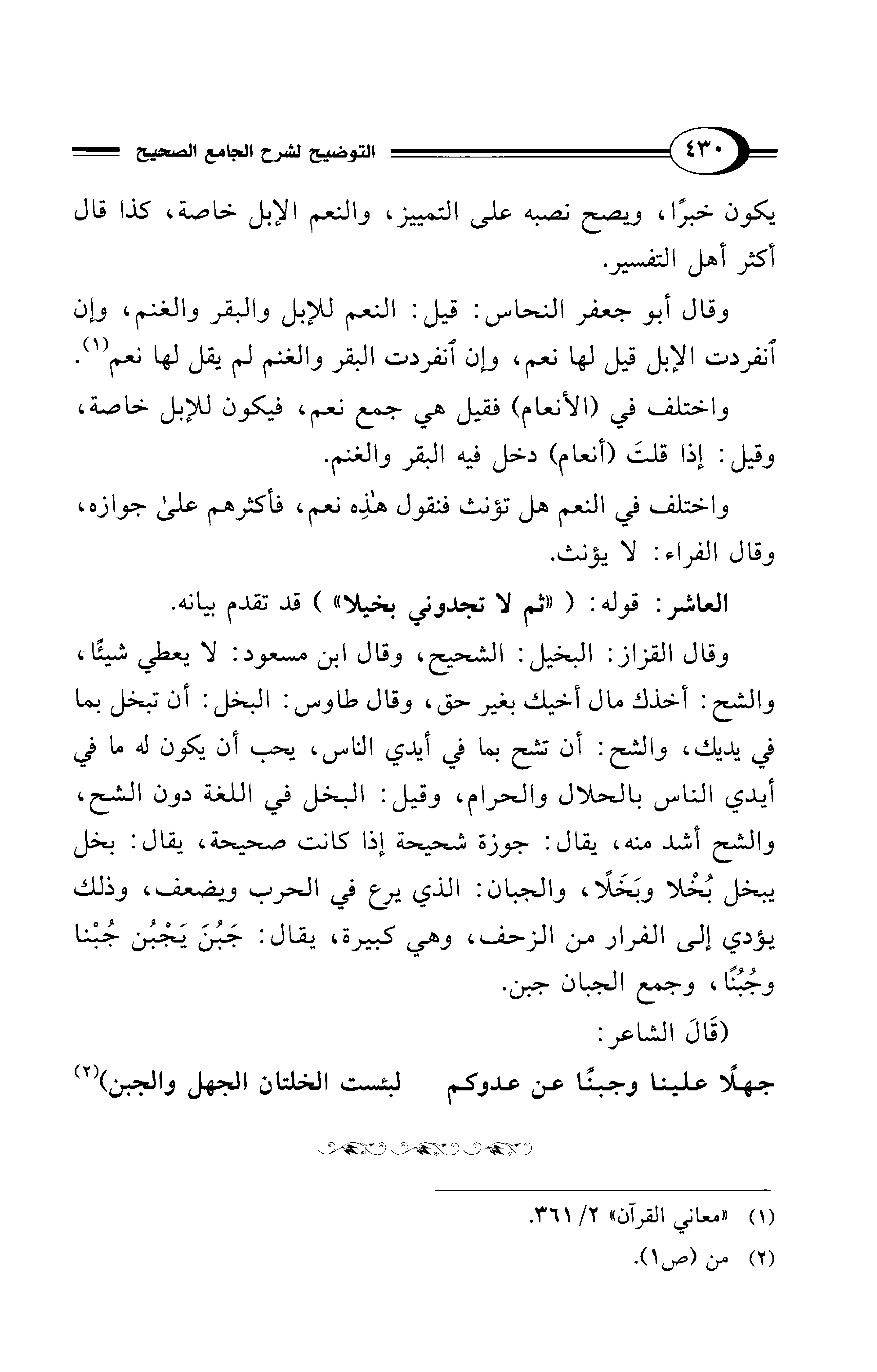 وقال القزاز: البخيل: الشحيح، وقال ابن مسعود: لا يعطي شيئًا، والشح: أخذك مال أخيك بغير حق، وقال طاوس: البخل: أن تبخل مما في يديك، والشح: أن تشح مما في أيدي الناس، يحب أن يكون له ما في أيدي الناس بالحلال والحرام، وقيل: البخل في اللغة دون الشح، والشح أشد منه، يقال: جوزة شحيحة إذا كانت صحيحة، يقال: بخل يبخل بُخْلا وبَخَلاً، والجبان: الذي يرع في الحرب ويضعف، وذلك يؤدي إلى الفرار من الزحف، وهي كبيرة، يقال: جَبُنَ يَجْبُن جُبْنا وجُبُنًا، وجمع الجبان جبن.