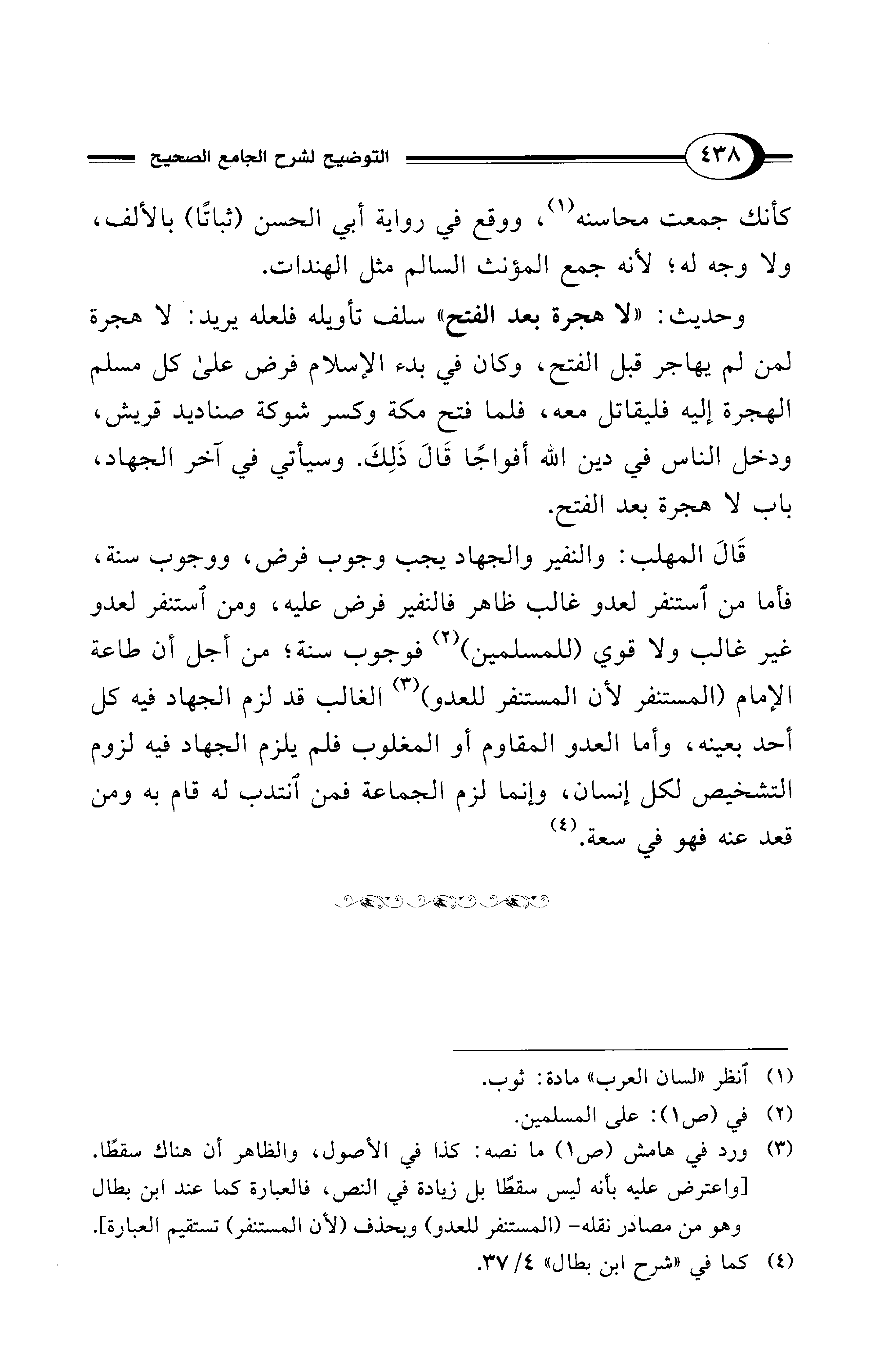 (¬3) ورد في هامش (ص1) ما نصه: كذا في الأصول، والظاهر أن هناك سقطًا. [واعترض عليه بأنه ليس سقطًا بل زيادة في النص، فالعبارة كما عند ابن بطال وهو من مصادر نقله- (المستنفر للعدو) وبحذف (لآن المستنفر) تستقيم العبارة].