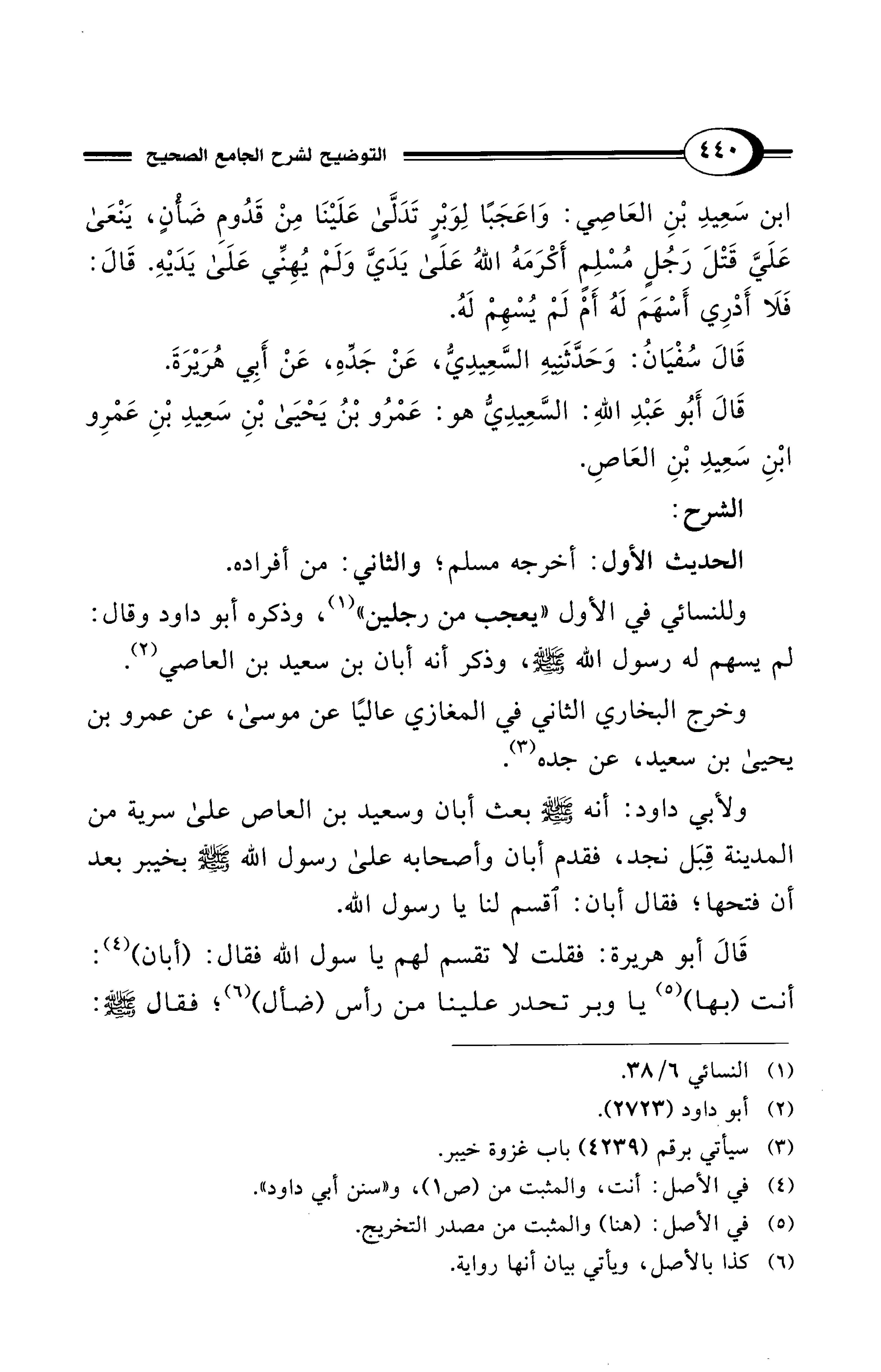 ولأبي داود: أنه - صلى الله عليه وسلم - بعث أبان وسعيد بن العاص على سرية من المدينة قِبَل نجد، فقدم أبان وأصحابه على رسول الله - صلي الله عليه وسلم - بخيبر بعد أن فتحها؛ فقال أبان: اقسم لنا يا رسول الله.