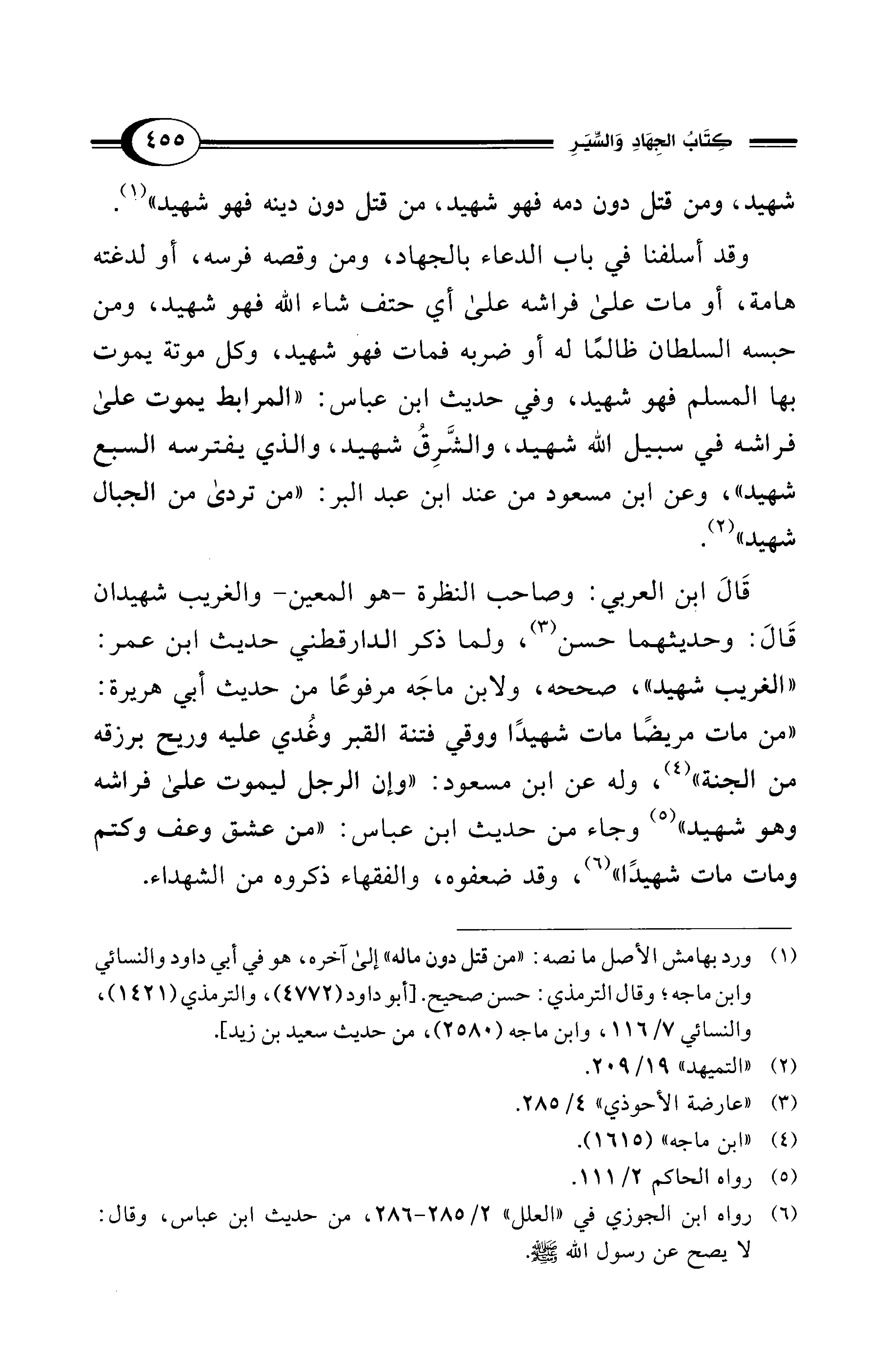 (¬1) ورد بهامش الأصل ما نصه: "من قتل دون ماله" إلى آخره، هو في أبي داود والنسائي وابن ماجه؛ وقال الترمذي: حسن صحيح. [أبو داود (4772)، والترمذي (1421)، والنسائي 7/ 116، وابن ماجه (2580)، من حديث سعيد بن زيد].