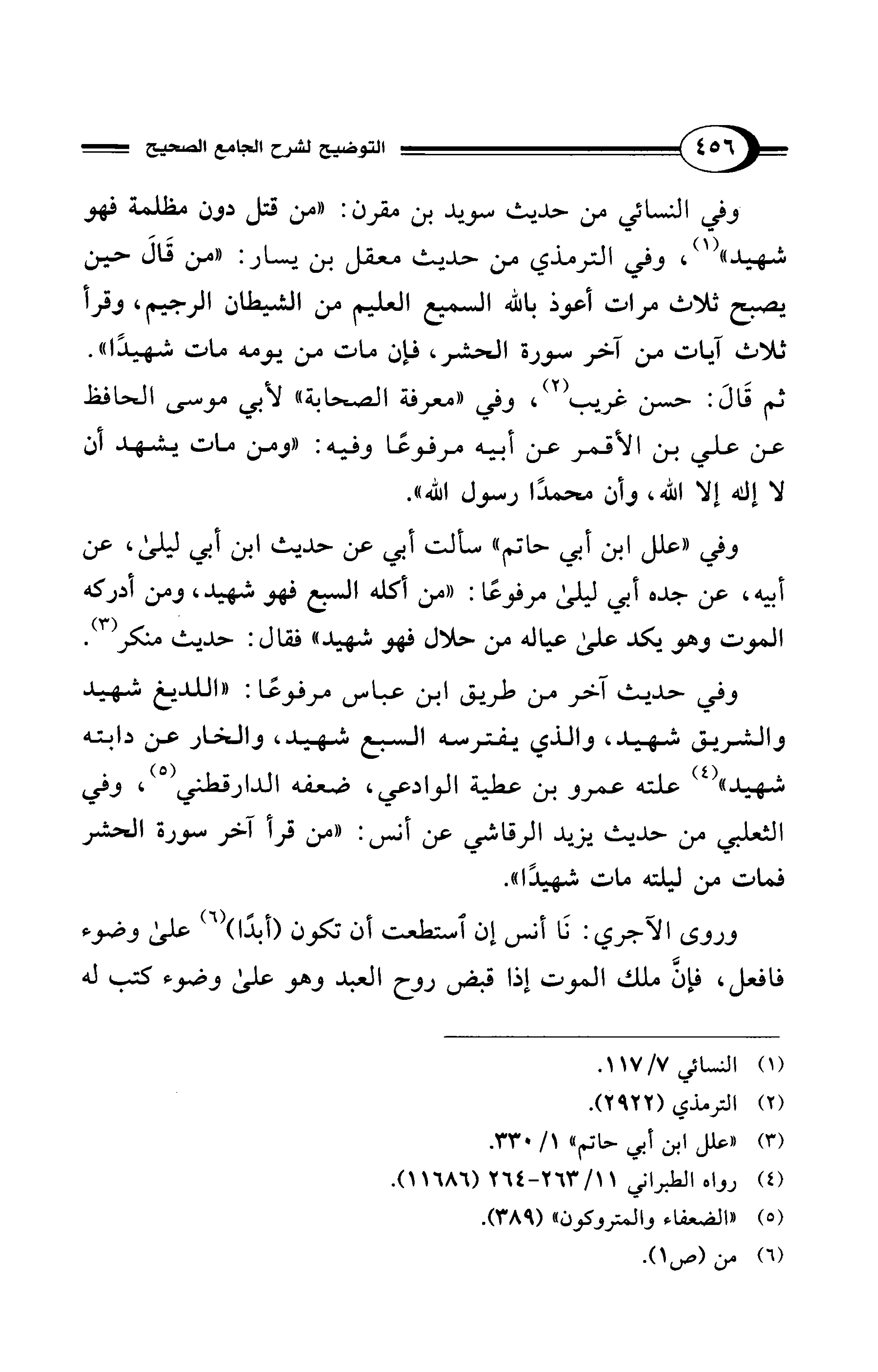 وفي النسائي من حديث سويد بن مقرن: "من قتل دون مظلمة فهو شهيد" (¬1)، وفي الترمذي من حديث معقل بن يسار: "من قَالَ حين يصبح ثلاث مرات أعوذ بالله السميع العلم من الشيطان الرجيم، وقرأ ثلاث آيات من آخر سورة الحشر، فإن مات من يومه مات شهيدًا".