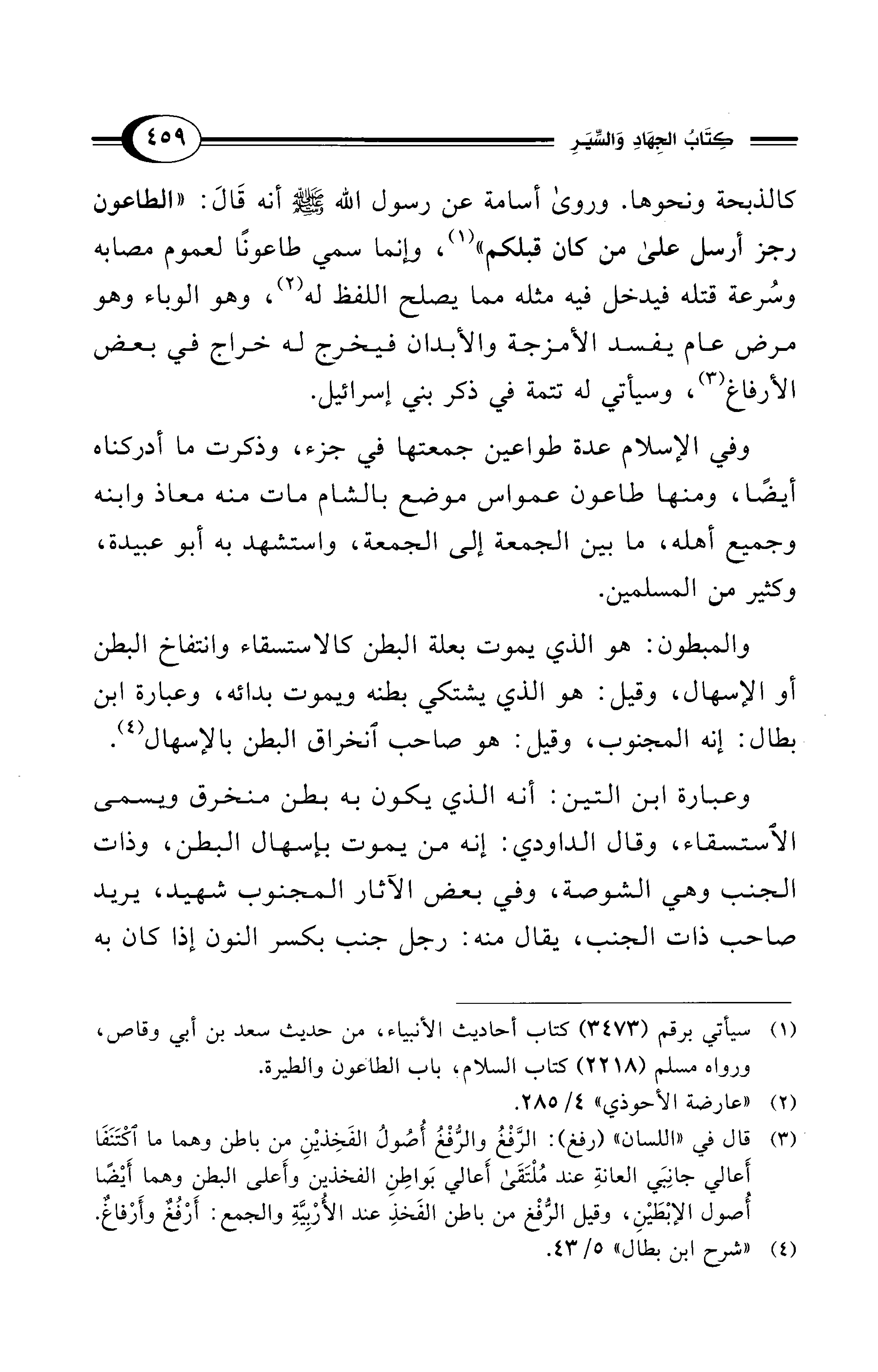 كالذبحة ونحوها. وروى أسامة عن رسول الله - صلي الله عليه وسلم - أنه قَالَ: "الطاعون رجز أرسل على من كان قبلكم" (¬1)، وإنما سمي طاعونًا لعموم مصابه وسُرعة قتله فيدخل فيه مثله مما يصلح اللفقاله (¬2)، وهو الوباء وهو مرض عام يفسد الأمزجة والأبدان فيخرج له خراج في بعض الأرفاغ (¬3)، وسيأتي له تتمة في ذكر بني إسرائيل.