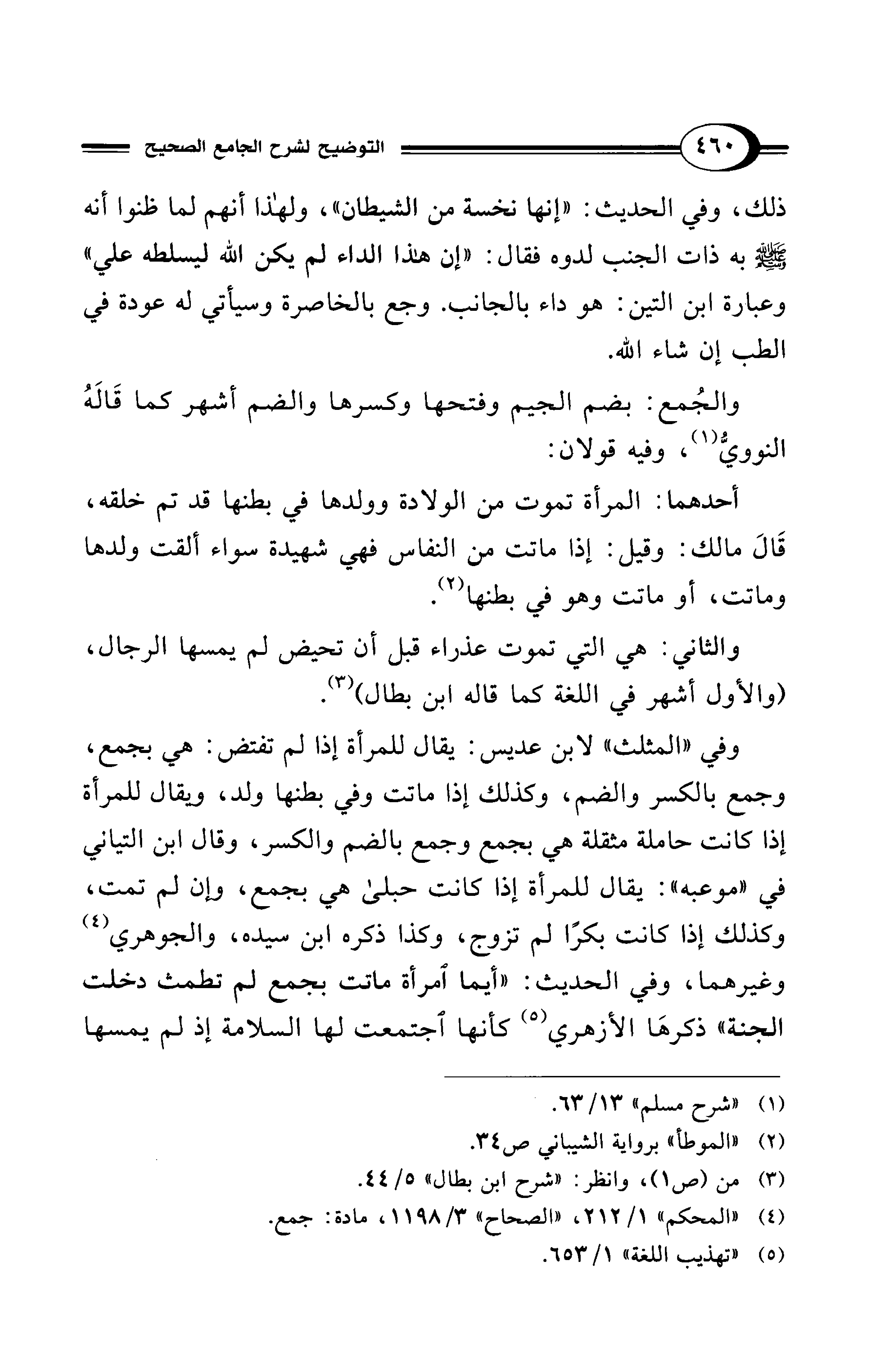 وفي "المثلث" لابن عديس: يقال للمرأة إذا لم تفتض: هي بجمع، وجمع بالكسر والضم، وكذلك إذا ماتت وفي بطنها ولد، ويقال للمرأة إذا كانت حاملة مثقلة هي بجمع وجمع بالضم والكسر، وقال ابن التياني في "موعبه": يقال للمرأة إذا كانت حبلى هي بجمع، وإن لم تمت، وكذلك إذا كانت بكرًا لم تزوج، وكذا ذكره ابن سيده، والجوهري (¬4) وغيرهما، وفي الحديث: "أيما امرأة ماتت بجمع لم تطمث دخلت الجنة" ذكرهَا الأزهري (¬5) كأنها اجتمعت لها السلامة إذ لم يمسها