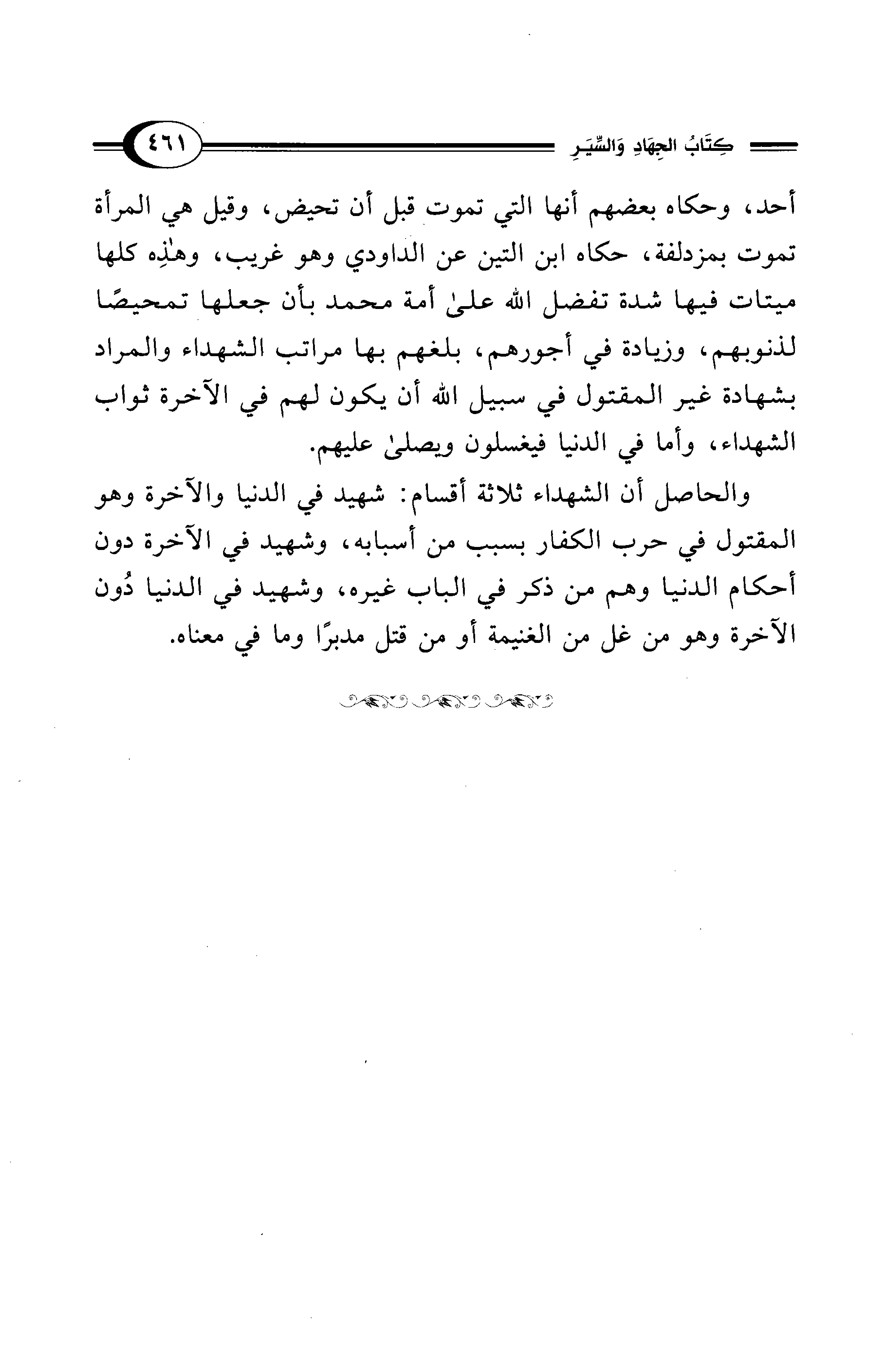 والحاصل أن الشهداء ثلاثة أقسام: شهيد في الدنيا والآخرة وهو المقتول في حرب الكفار بسبب من أسبابه، وشهيد في الآخرة دون أحكام الدنيا وهم من ذكر في الباب غيره، وشهيد في الدنيا دُون الآخرة وهو من غل من الغنيمة أو من قتل مدبرًا وما في معناه.