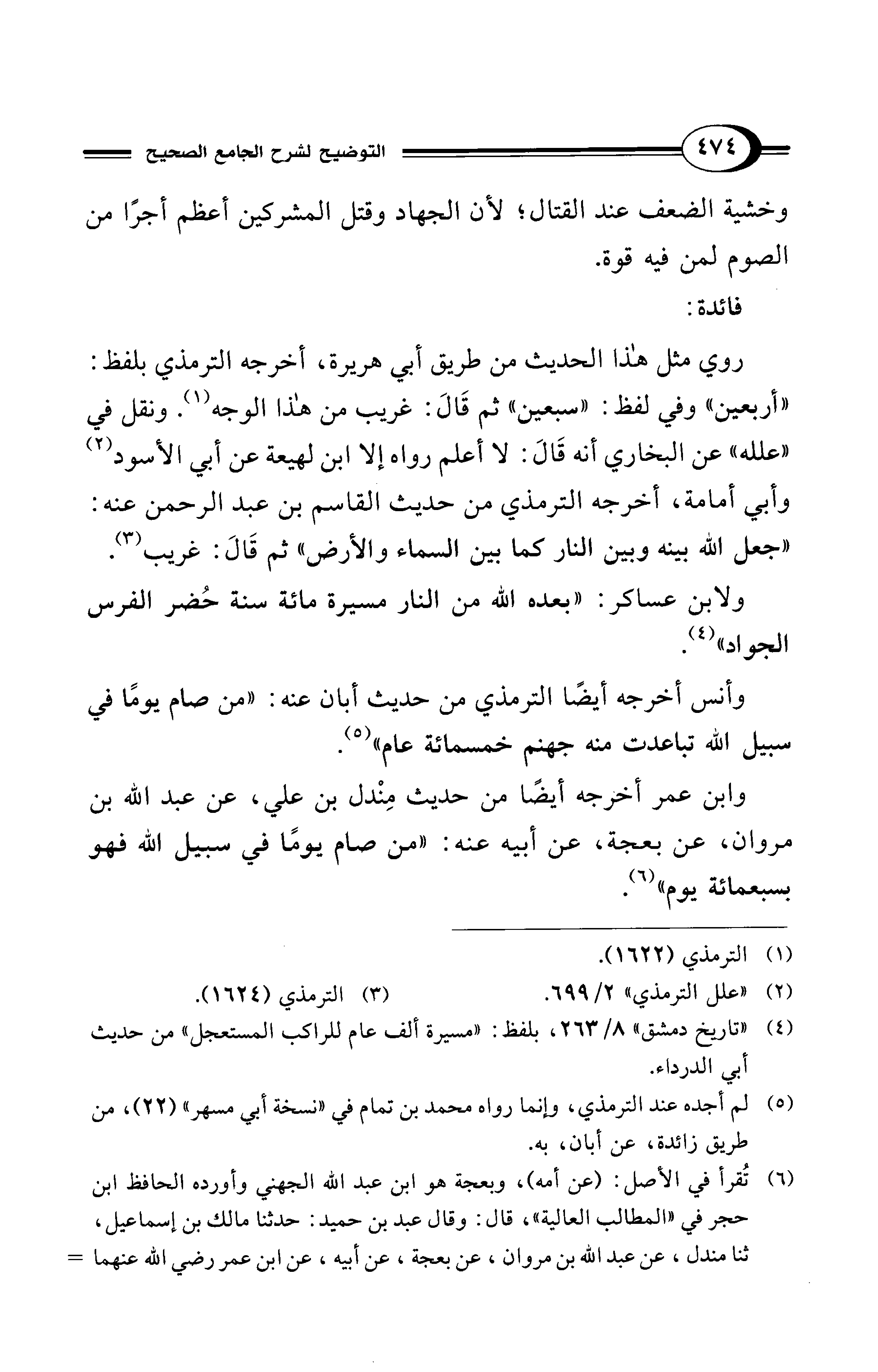 وابن عمر أخرجه أيضًا من حديث مِنْدل بن علي، عن عبد الله بن مروان، عن بعجة، عن أبيه عنه: "من صام يومًا في سبيل الله فهو بسبعمائة يوم" (¬6).