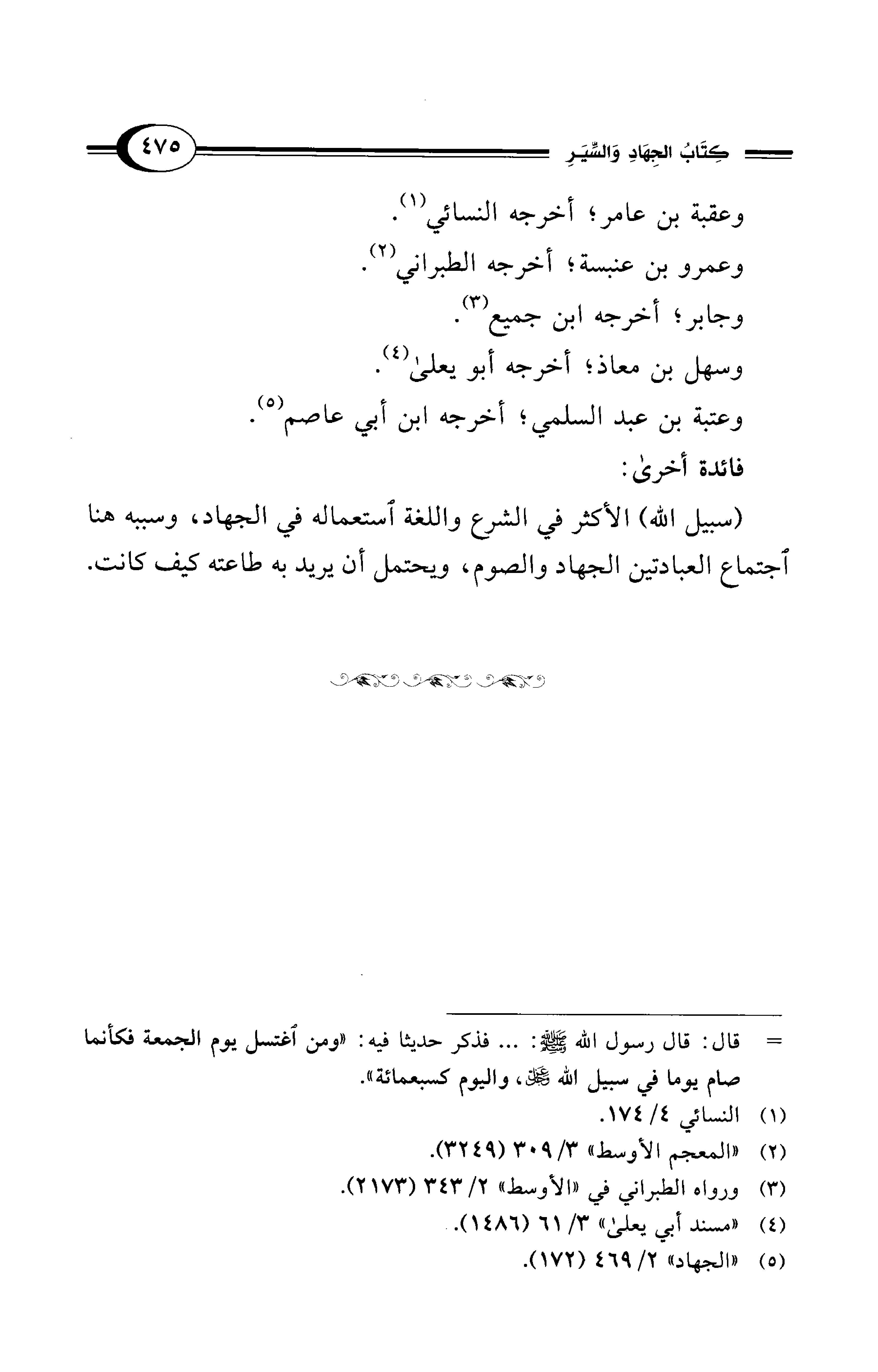 قال: قال رسول الله - صلي الله عليه وسلم -: ... فذكر حديثا فيه: "ومن اغتسل يوم الجمعة فكأنما صام يوما في سبيل الله -عَزَّ وَجَلَّ-، واليوم كسبعمائة".