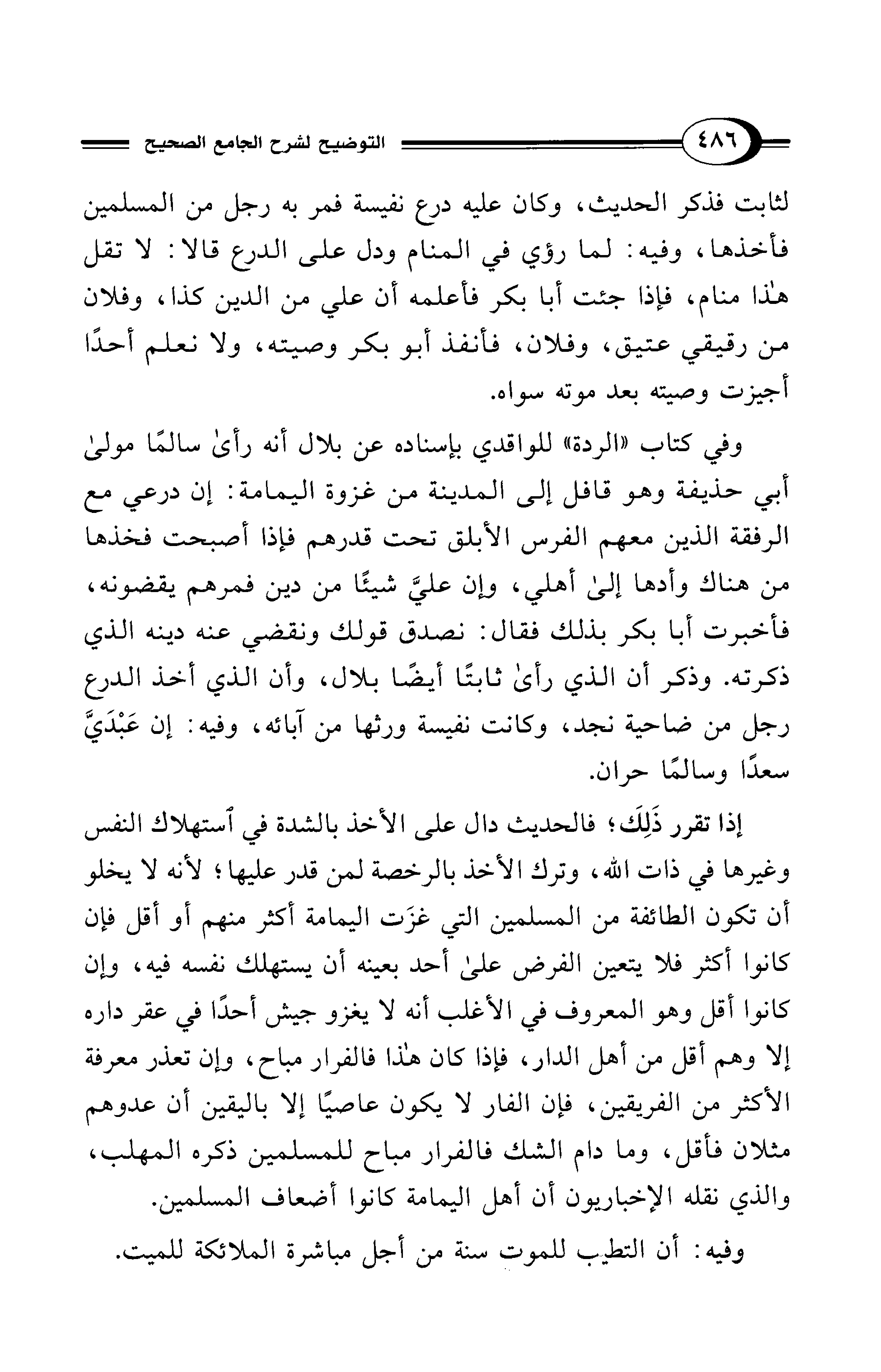 إذا تقرر ذَلِكَ؛ فالحديث دال على الأخذ بالشدة في استهلاك النفس وغيرها في ذات الله، وترك الأخذ بالرخصة لمن قدر عليها؛ لأنه لا يخلو أن تكون الطائفة من المسلمين التي غزَت اليمامة أكثر منهم أو أقل فإن كانوا أكثر فلا يتعين الفرض على أحد بعينه أن يستهلك نفسه فيه، وإن كانوا أقل وهو المعروف في الأغلب أنه لا يغزو جيش أحدًا في عقر داره إلا وهم أقل من أهل الدار، فإذا كان هذا فالفرار مباح، وإن تعذر معرفة الأكثر من الفريقين، فإن الفار لا يكون عاصيًا إلا باليقين أن عدوهم