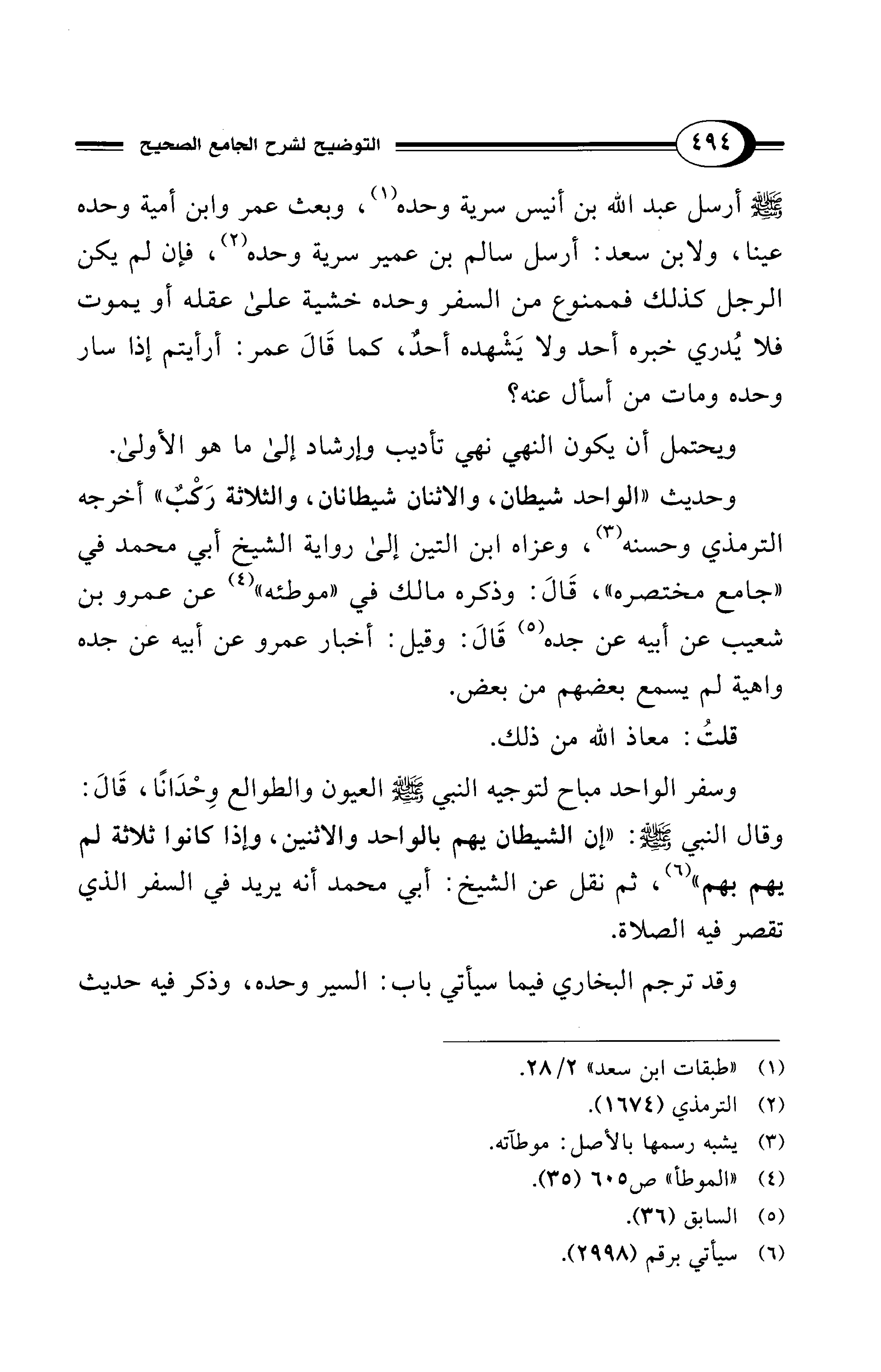 وحديث "الواحد شيطان، والاثنان شيطانان، والثلاثة رَكْبٌ" أخرجه الترمذي وحسنه (¬3)، وعزاه ابن التين إلى رواية الشيخ أبي محمد في "جامع مختصره"، قَالَ: وذكره مالك في "موطئه" (¬4) عن عمرو بن شعيب عن أبيه عن جده (¬5) قَالَ: وقيل: أخبار عمرو عن أبيه عن جده واهية لم يسمع بعضهم من بعض.