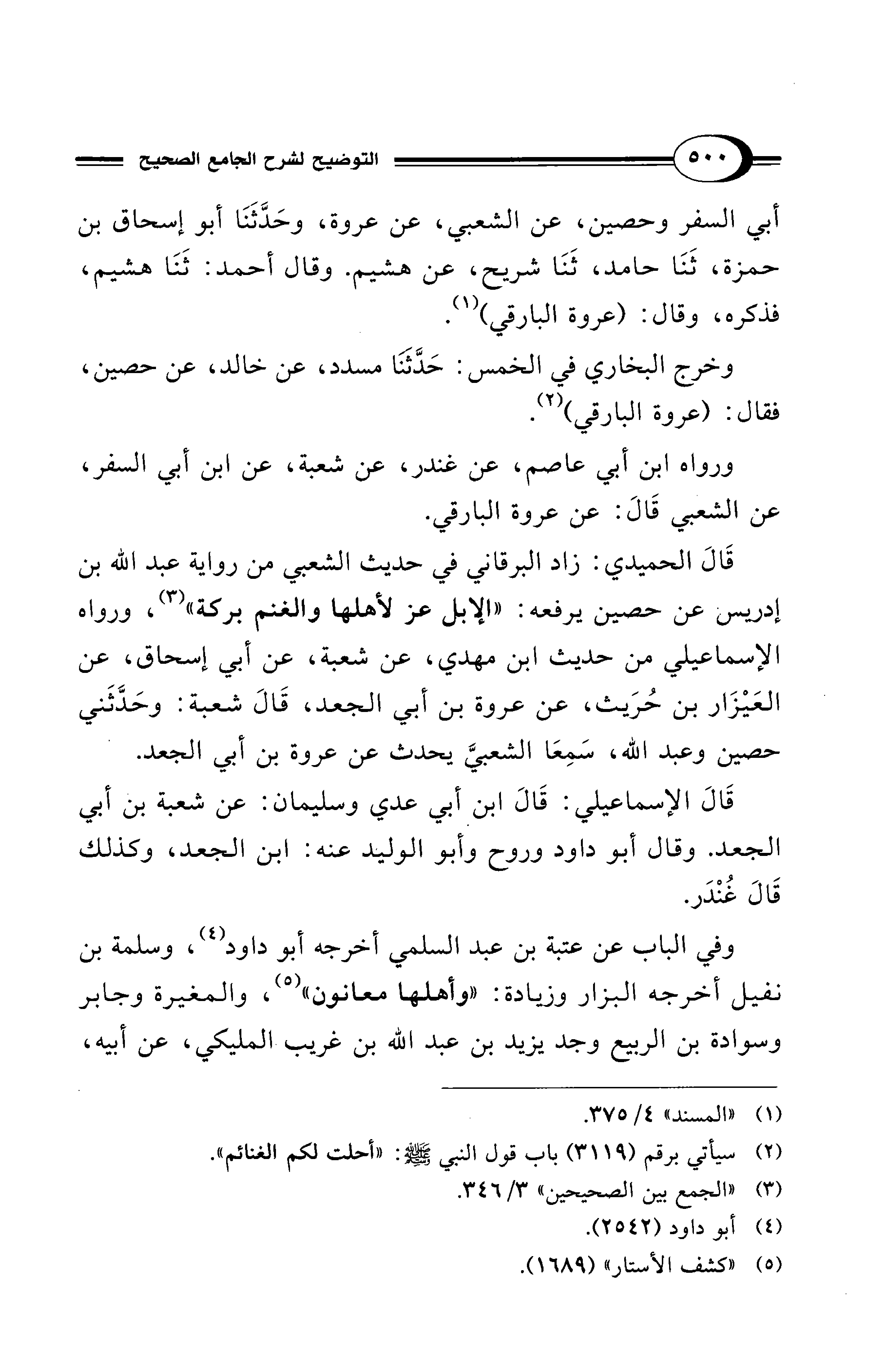 أبي السفر وحصين، عن الشعبي، عن عروة، وحَدَّثَنَا أبو إسحاق بن حمزة، ثَنَا حامد، ثَنَا شريح، عن هشيم. وقال أحمد: ثَنَا هشيم، فذكره، وقال: (عروة البارقي) (¬1).