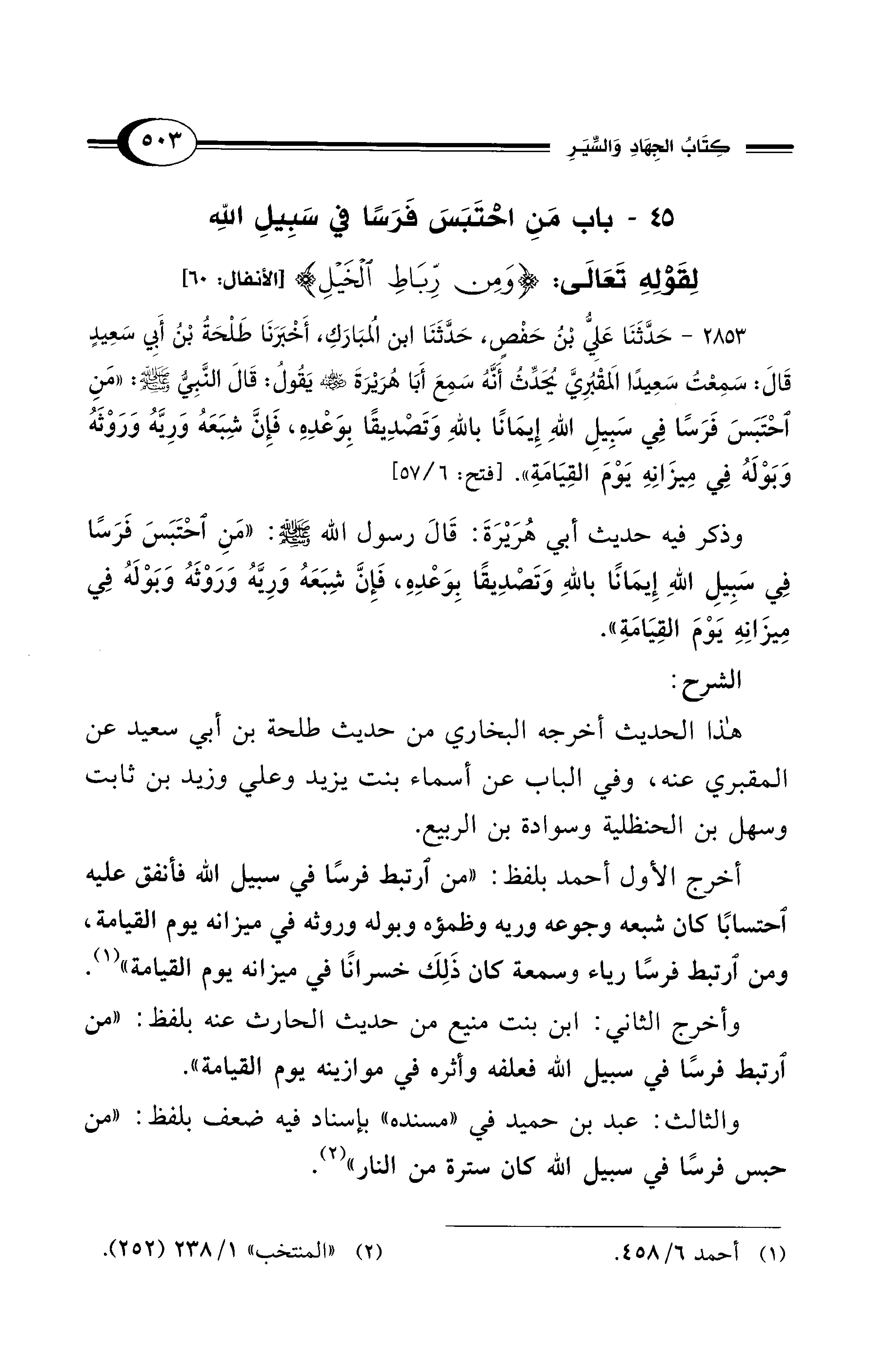 وذكر فيه حديث أبي هُرَيْرَةَ: قَالَ رسول الله - صلى الله عليه وسلم -: "مَنِ احْتَبَسَ فَرَسًا فِي سَبِيلِ اللهِ إِيمَانًا باللهِ وَتَصْدِيقًا بِوَعْدِهِ، فَإِنَّ شِبَعَهُ وَرِيَّهُ وَرَوْثَهُ وَبَوْلَهُ فِي مِيزَانِهِ يَوْمَ القِيَامَةِ".