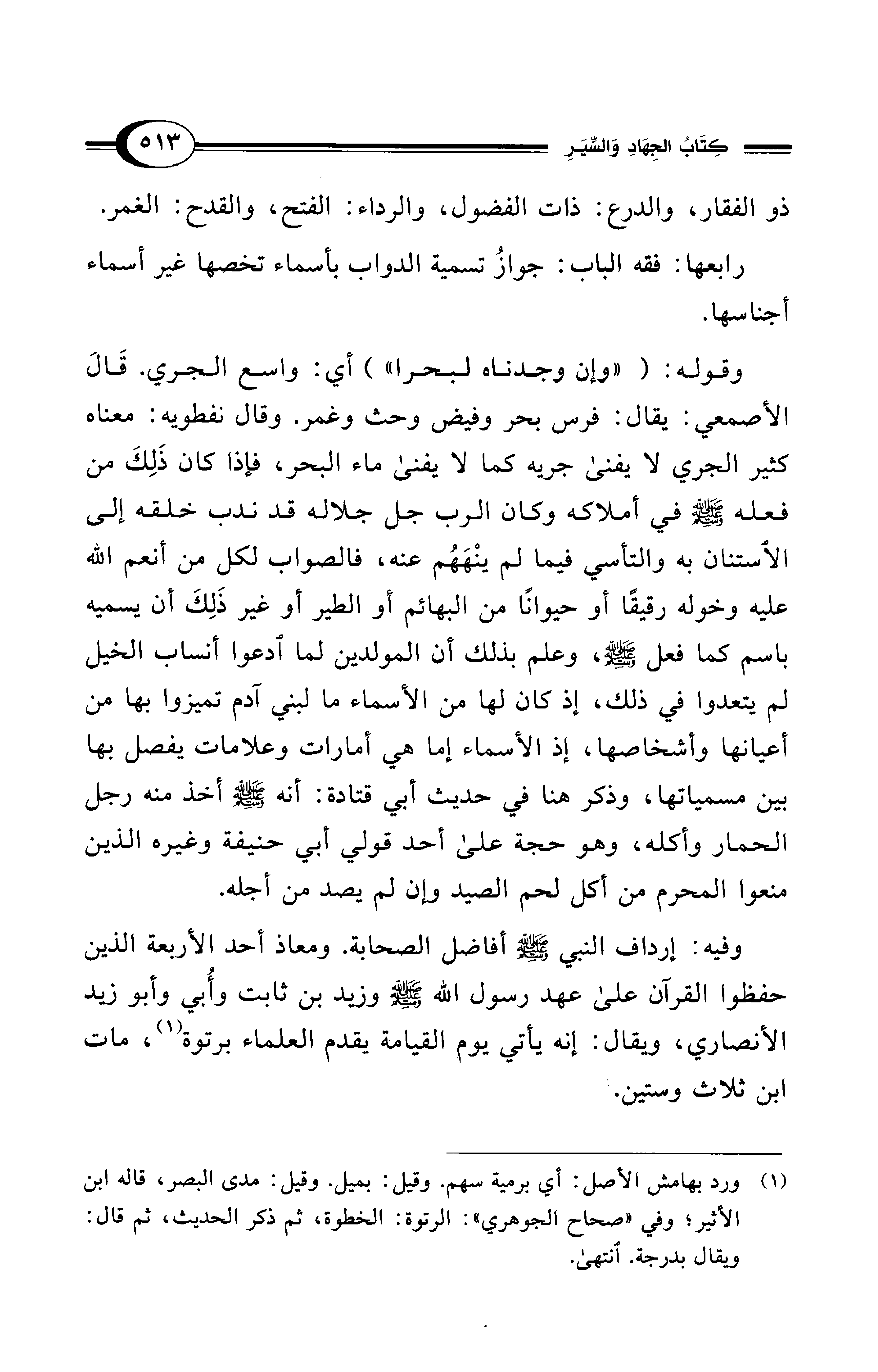 وقوله: ("وإن وجدناه لبحرا") أي: واسع الجري. قَالَ الأصمعي: يقال: فرس بحر وفيض وحث وغمر. وقال نفطويه: معناه كثير الجري لا يفنى جريه كما لا يفنى ماء البحر، فإذا كان ذَلِكَ من فعله - صلى الله عليه وسلم - في أملاكه وكان الرب -جل جلاله- قد ندب خلقه إلى الاستنان به والتأسي فيما لم ينْهَهُم عنه، فالصواب لكل من أنعم الله عليه وخوله رقيقًا أو حيوانًا من البهائم أو الطير أو غير ذَلِكَ أن يسميه باسم كما فعل - صلى الله عليه وسلم -، وعلم بذلك أن المولدين لما ادعوا أنساب الخيل لم يتعدوا في ذلك، إذ كان لها من الأسماء ما لبني آدم تميزوا بها من أعيانها وأشخاصها، إذ الأسماء إما هي أمارات وعلامات يفصل بها بين مسمياتها، وذكر هنا في حديث أبي قتادة: أنه - صلى الله عليه وسلم - أخذ منه رجل الحمار وأكله، وهو حجة على أحد قولي أبي حنيفة وغيره الذين منعوا المحرم من أكل لحم الصيد وإن لم يصد من أجله.