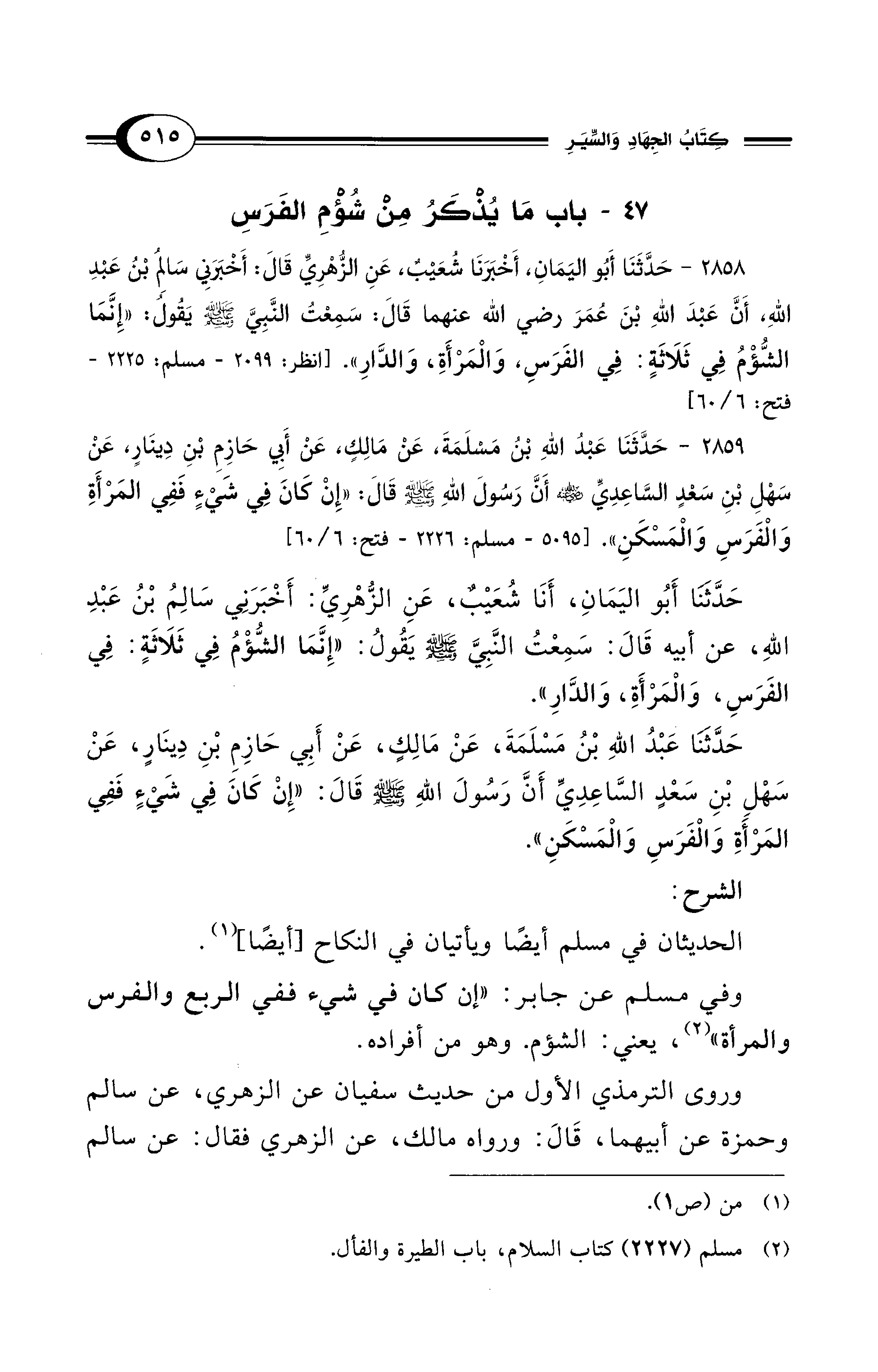 2858 - حَدَّثَنَا أَبُو اليَمَانِ، أَخْبَرَنَا شُعَيْبٌ، عَنِ الزُّهْرِيِّ قَالَ: أَخْبَرَنِي سَالِمُ بْنُ عَبْدِ اللهِ، أَنَّ عَبْدَ اللهِ بْنَ عُمَرَ - رضي الله عنهما - قَالَ: سَمِعْتُ النَّبِيَّ - صلى الله عليه وسلم - يَقُولُ: "إِنَّمَا الشُّؤْمُ فِي ثَلاَثَةٍ: في الفَرَسِ، وَالْمَرْأَةِ، وَالدَّارِ". [انظر: 2099 - مسلم: 2225 - فتح: 6/ 60]