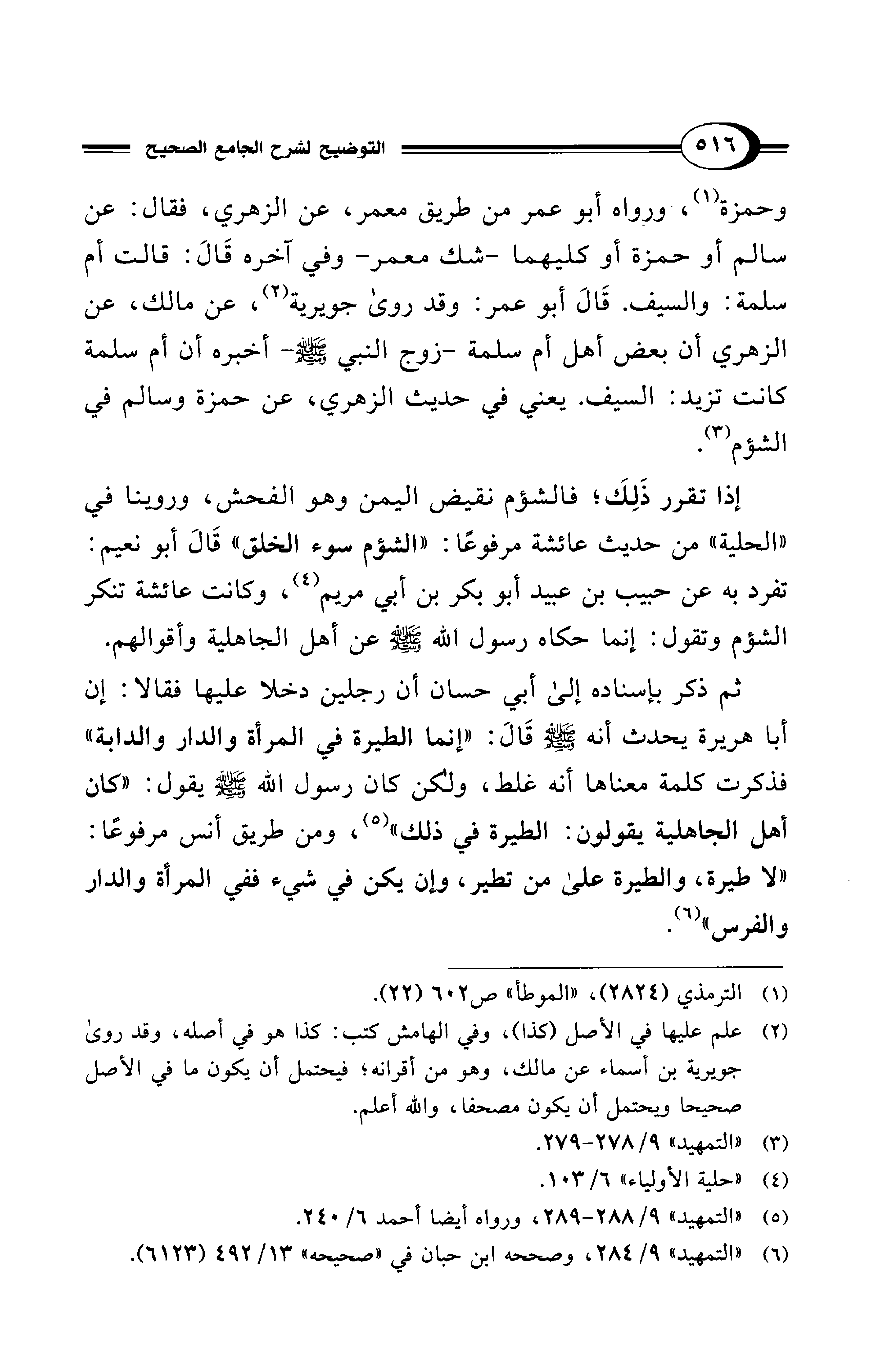 وحمزة (¬1)، ورواه أبو عمر من طريق معمر، عن الزهري، فقال: عن سالم أو حمزة أو كليهما -شك معمر- وفي آخره قَالَ: قالت أم سلمة: والسيف. قَالَ أبو عمر: وقد روى جويرية (¬2)، عن مالك، عن الزهري أن بعض أهل أم سلمة -زوج النبي - صلى الله عليه وسلم - أخبره أن أم سلمة كانت تزيد: السيف. يعني في حديث الزهري، عن حمزة وسالم في الشؤم (¬3).