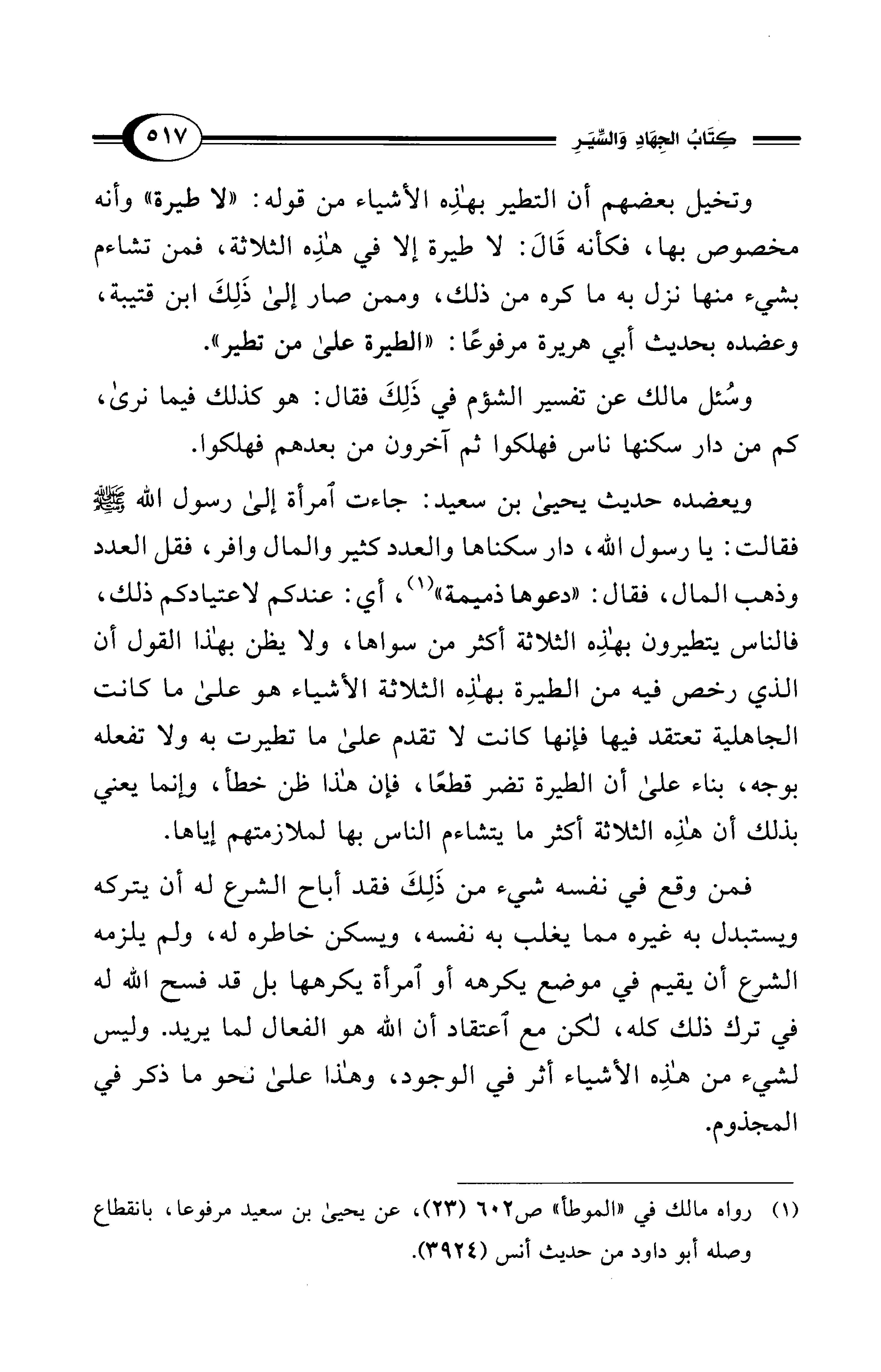 ويعضده حديث يحيى بن سعيد: جاءت امرأة إلى رسول الله - صلي الله عليه وسلم - فقالت: يا رسول الله، دار سكناها والعدد كثير والمال وافر، فقل العدد وذهب المال، فقال: "دعوها ذميمة" (¬1)، أي: عندكم لاعتيادكم ذلك، فالناس يتطيرون بهذِه الثلاثة أكثر من سواها, ولا يظن بهذا القول أن الذي رخص فيه من الطيرة بهذِه الثلاثة الأشياء هو على ما كانت الجاهلية تعتقد فيها فإنها كانت لا تقدم على ما تطيرت به ولا تفعله بوجه، بناء على أن الطيرة تضر قطعًا، فإن هذا ظن خطأ، وإنما يعني بذلك أن هذِه الثلاثة أكثر ما يتشاءم الناس بها لملازمتهم إياها.