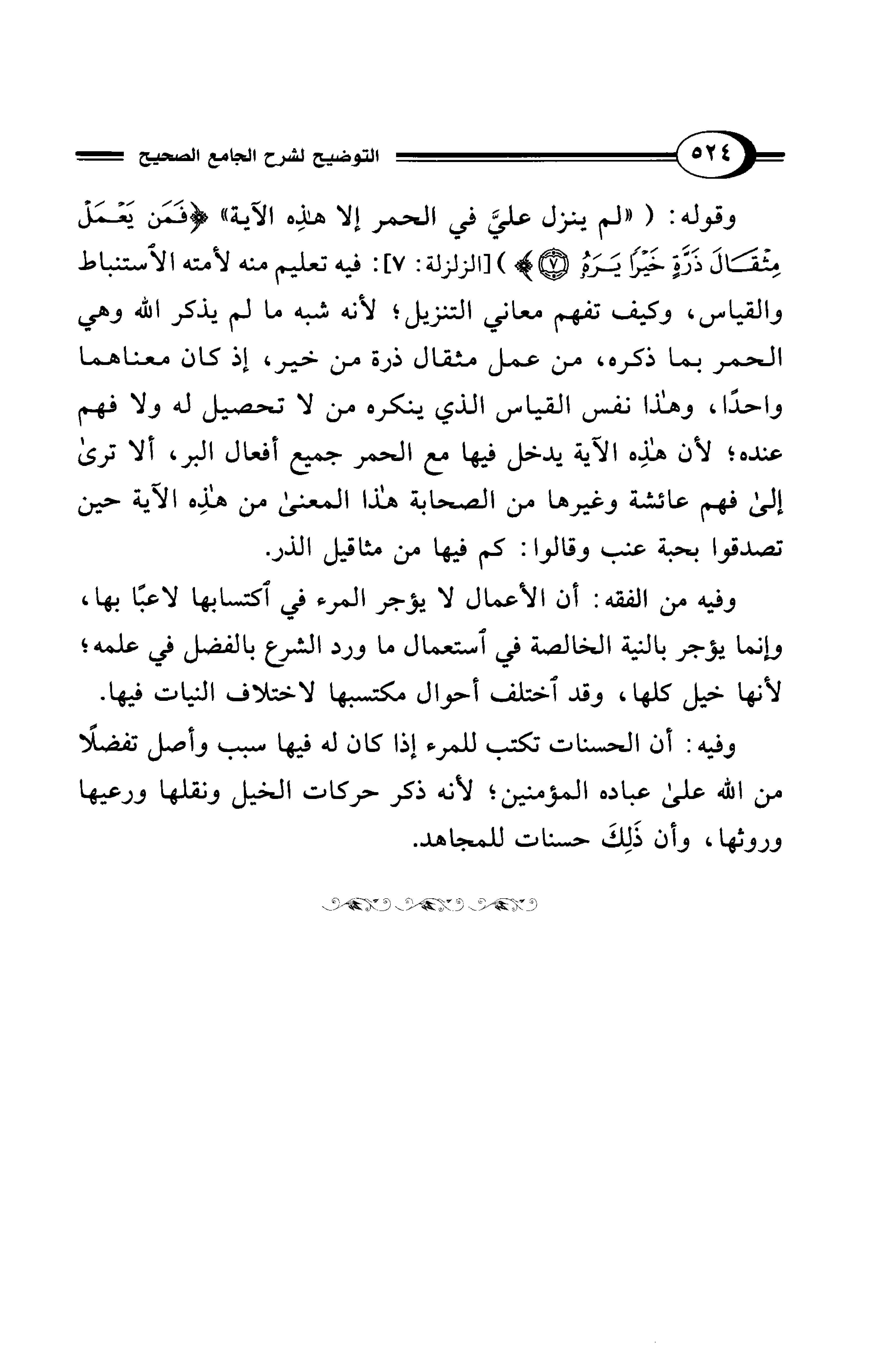 وقوله: ("لم ينزل عليَّ في الحمر إلا هذِه الآية" {فَمَنْ يَعْمَلْ مِثْقَالَ ذَرَّةٍ خَيْرًا يَرَهُ (7)} [الزلزلة: 7]: فيه تعليم منه لأمته الاستنباط والقياس، وكيف تفهم معاني التنزيل؛ لأنه شبه ما لم يذكر الله وهي الحمر مما ذكره، من عمل مثقال ذرة من خير، إذ كان معناهما واحدًا، وهذا نفس القياس الذي ينكره من لا تحصيل له ولا فهم عنده؛ لأن هذِه الآية يدخل فيها مع الحمر جميع أفعال البر، ألا ترى إلى فهم عائشة وغيرها من الصحابة هذا المعنى من هذِه الآية حين تصدقوا بحبة عنب وقالوا: كم فيها من مثاقيل الذر.