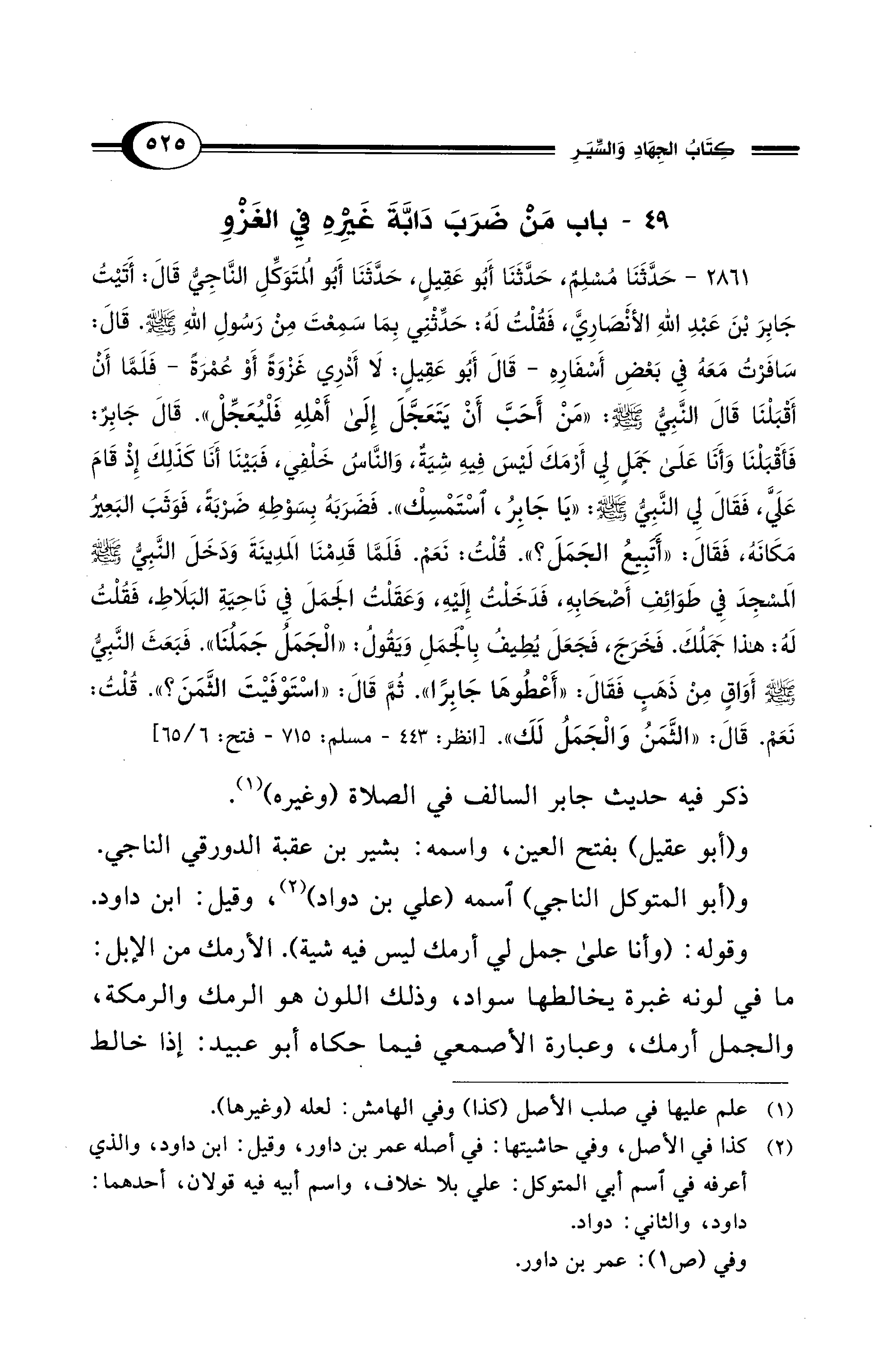 2861 - حَدَّثَنَا مُسْلِمٌ، حَدَّثَنَا أَبُو عَقِيلٍ، حَدَّثَنَا أَبُو الْمُتَوَكِّلِ النَّاجِيُّ قَالَ: أَتَيْتُ جَابِرَ بْنَ عَبْدِ اللهِ الأَنْصَارِيَّ، فَقُلْتُ لَهُ: حَدِّثْنِي بِمَا سَمِعْتَ مِنْ رَسُولِ اللهِ - صلى الله عليه وسلم - قَالَ: سَافَرْتُ مَعَهُ في بَعْضِ أَسْفَارِهِ -قَالَ أَبُو عَقِيلٍ: لاَ أَدْرِي غَزْوَةً أَوْ عُمْرَةً- فَلَمَّا أَنْ أَقْبَلْنَا قَالَ النَّبِيُّ - صلى الله عليه وسلم -: "مَنْ أَحَبَّ أَنْ يَتَعَجَّلَ إِلَى أَهْلِهِ فَلْيُعَجِّلْ". قَالَ جَابِرٌ: فَأَقْبَلْنَا وَأَنَا عَلَى جَمَلٍ لِي أَرْمَكَ لَيْسَ فِيهِ شِيَةٌ، وَالنَّاسُ خَلْفِي، فَبَيْنَا أَنَا كَذَلِكَ إِذْ قَامَ عَلَيَّ، فَقَالَ لِي النَّبِيُّ - صلى الله عليه وسلم -: "يَا جَابِرُ اسْتَمْسِكْ". فَضَرَبَهُ بِسَوْطِهِ ضَرْبَةً، فَوَثَبَ البَعِيرُ مَكَانَهُ، فَقَالَ: "أَتَبِيعُ الجَمَلَ". قُلْتُ نَعَمْ. فَلَمَّا قَدِمْنَا الْمَدِينَةَ وَدَخَلَ النَّبِيُّ - صلى الله عليه وسلم - المَسْجِدَ في طَوَائِفِ أَصْحَابِهِ، فَدَخَلْتُ إِلَيْهِ، وَعَقَلْتُ الْجَمَلَ فِي نَاحِيَةِ الْبَلاَطِ. فَقُلْتُ لَهُ هَذَا جَمَلُكَ. فَخَرَجَ، فَجَعَلَ يُطِيفُ بِالْجَمَلِ وَيَقُولُ: "الْجَمَلُ جَمَلُنَا". فَبَعَثَ النَّبِيُّ - صلى الله عليه وسلم - أَوَاقٍ مِنْ ذَهَبٍ فَقَالَ: "أَعْطُوهَا جَابِرًا". ثُمَّ قَالَ: "اسْتَوْفَيْتَ الثَّمَنَ". قُلْتُ نَعَمْ. قَالَ: "الثَّمَنُ وَالْجَمَلُ لَكَ". [انظر: 443 - مسلم: 715 - فتح: 6/ 65]