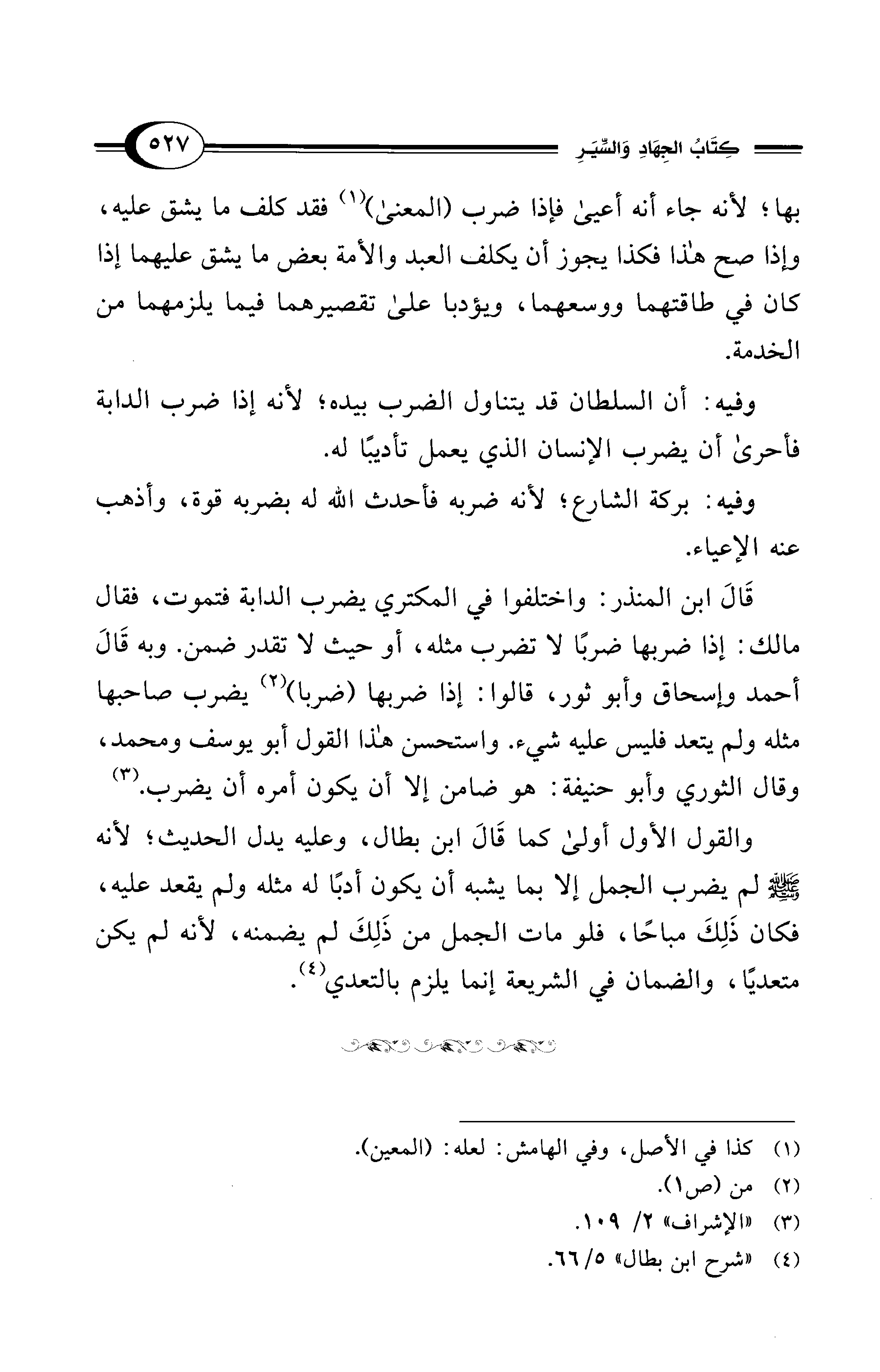 والقول الأول أولى كما قَالَ ابن بطال، وعليه يدل الحديث؛ لأنه - صلى الله عليه وسلم - لم يضرب الجمل إلا مما يشبه أن يكون أدبًا له مثله ولم يقعد عليه، فكان ذَلِكَ مباحًا، فلو مات الجمل من ذَلِكَ لم يضمنه؛ لأنه لم يكن متعديًا، والضمان في الشريعة إنما يلزم بالتعدي (¬4).
