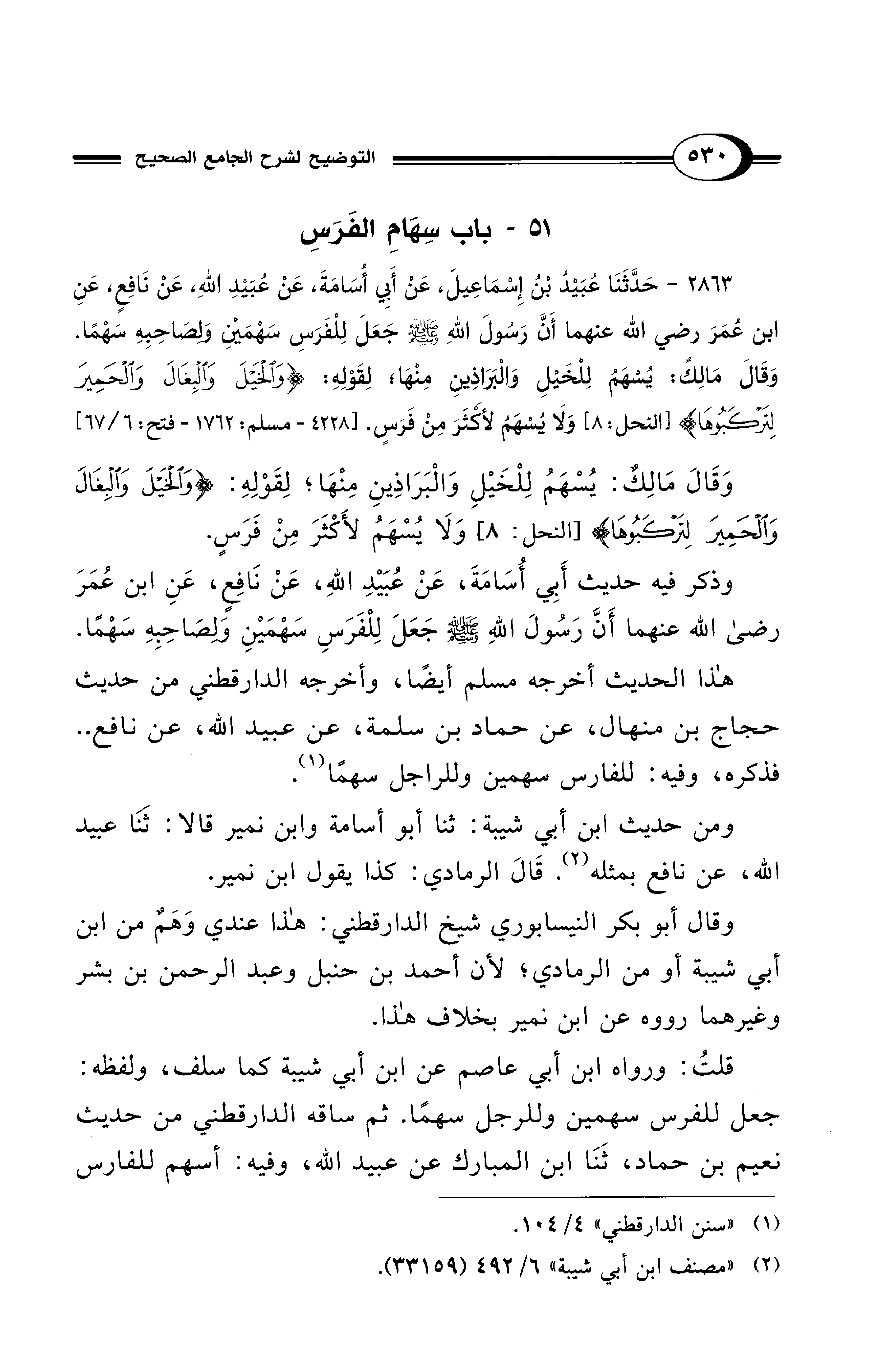 وذكر فيه حديث أَبِي أُسَامَةَ، عَنْ عُبَيْدِ اللهِ، عَنْ نَافِعٍ، عَنِ ابن عُمَرَ - رضي الله عنهما - أَنَّ رَسُولَ اللهِ - صلى الله عليه وسلم - جَعَلَ لِلْفَرَسِ سَهْمَيْنِ وَلِصَاحِبِهِ سَهْمًا.