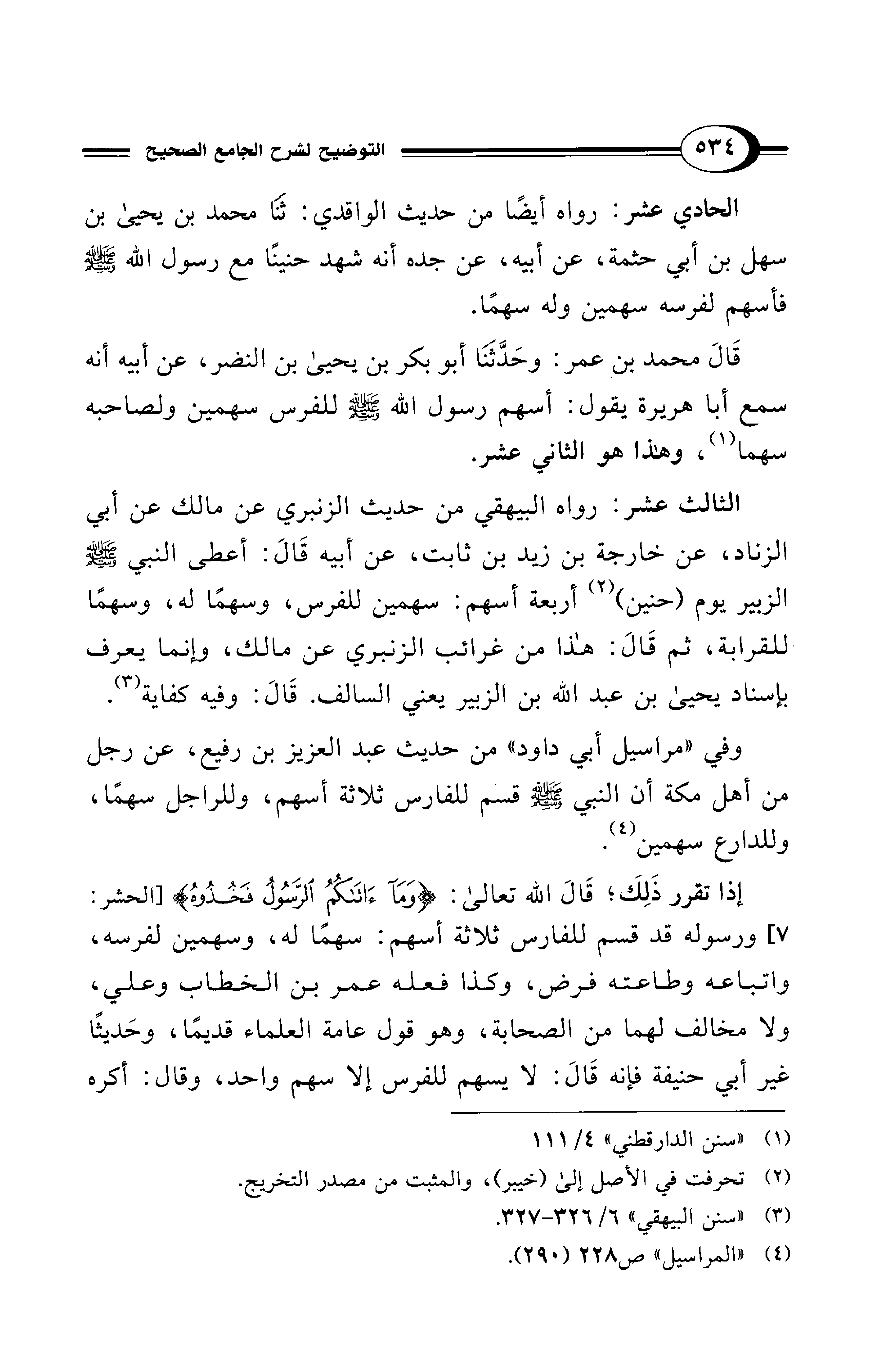 الحادي عشر: رواه أيضًا من حديث الواقدي: ثنا محمد بن يحيى بن سهل بن أبي حثمة، عن أبيه، عن جده أنه شهد حنينًا مع رسول الله - صلي الله عليه وسلم - فأسهم لفرسه سهمين وله سهمًا.