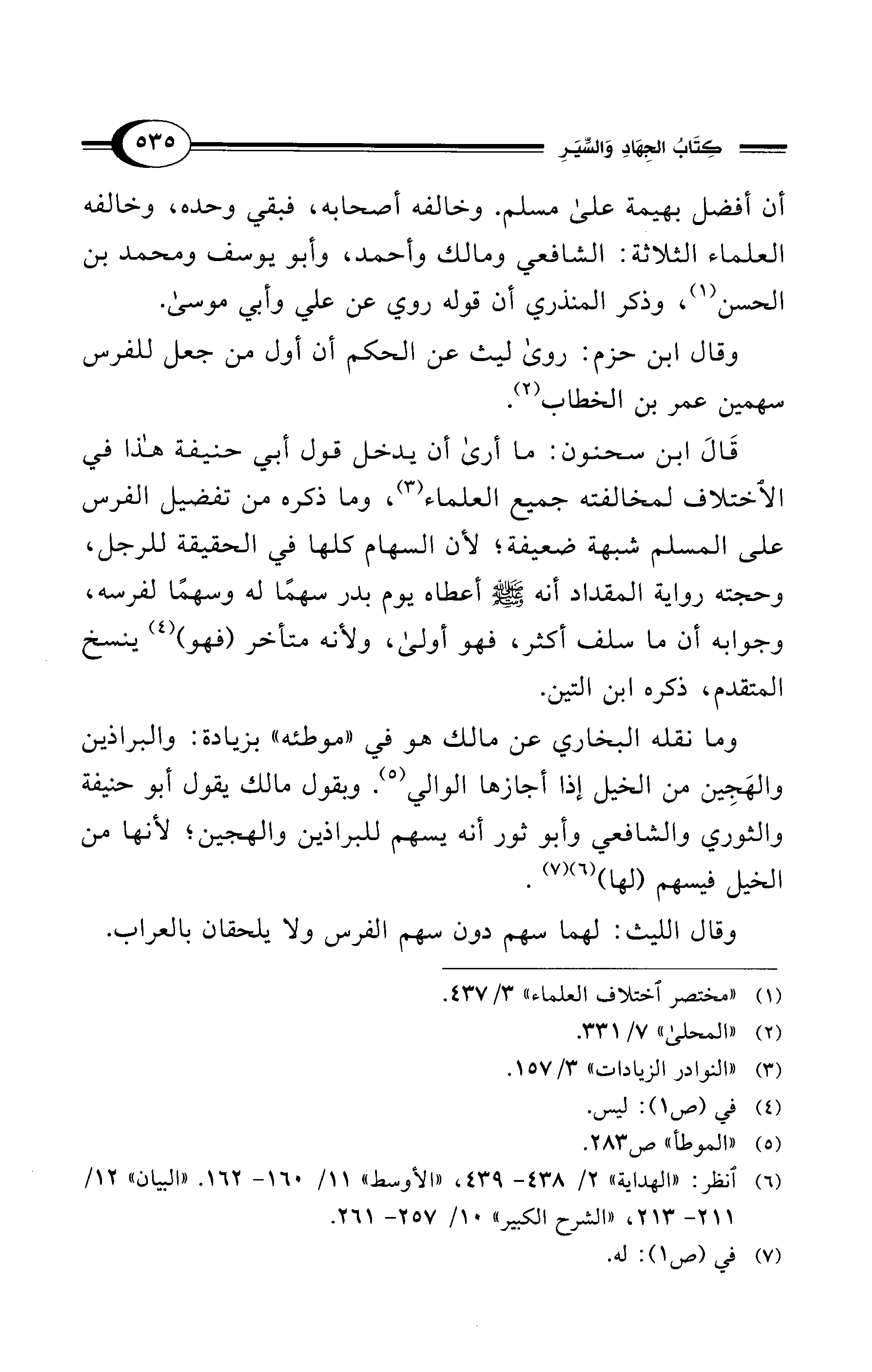 قَالَ ابن سحنون: ما أرى أن يدخل قول أبي حنيفة هذا في الاختلاف لمخالفته جميع العلماء (¬3)، وما ذكره من تفضيل الفرس على المسلم شبهة ضعيفة؛ لأن السهام كلها في الحقيقة للرجل، وحجته رواية المقداد أنه - صلى الله عليه وسلم - أعطاه يوم بدر سهمًا له وسهمًا لفرسه، وجوابه أن ما سلف أكثر، فهو أولى، ولأنه متأخر (فهو) (¬4) ينسخ المتقدم، ذكره ابن التين.