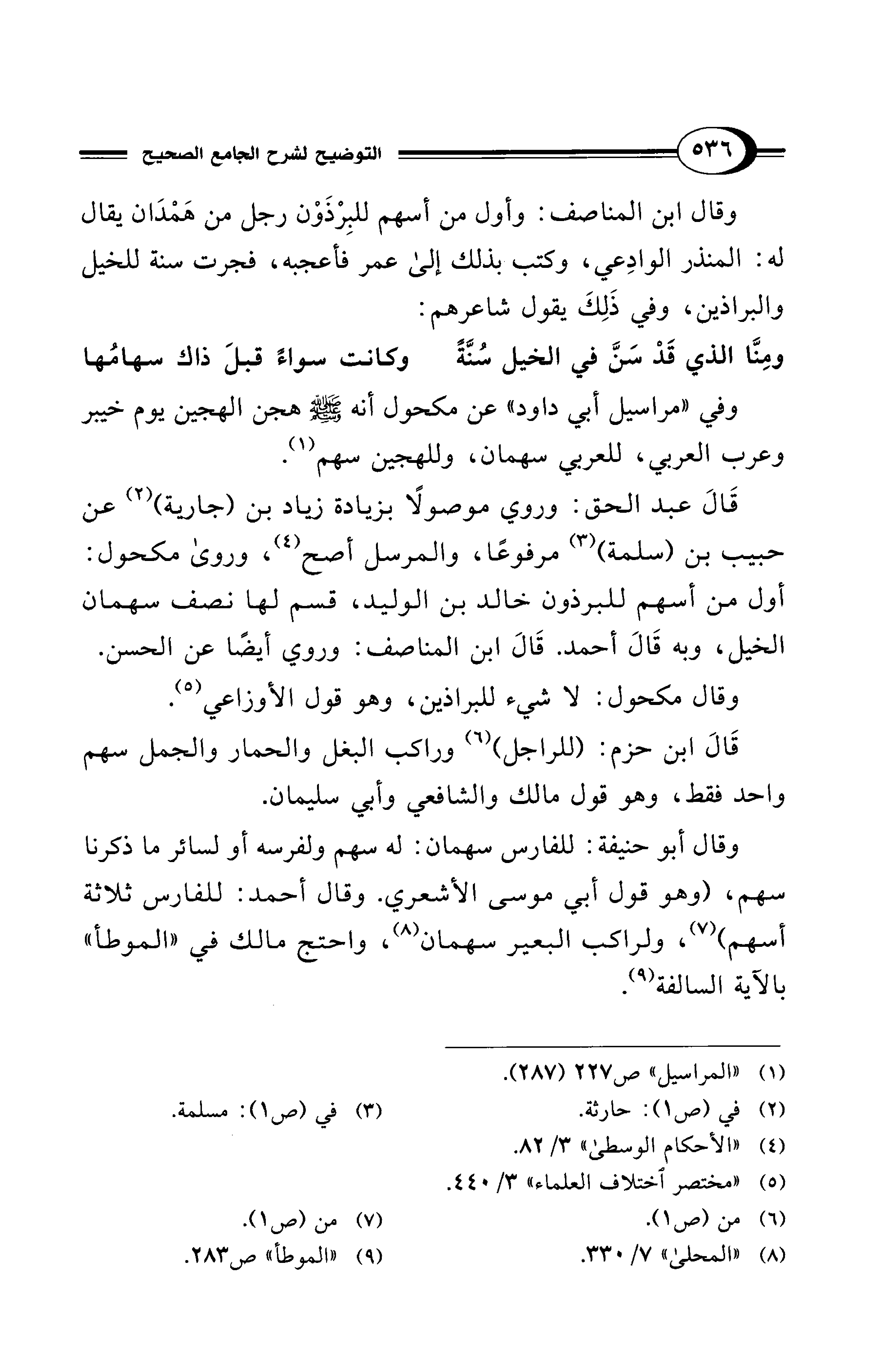 وقال ابن المناصف: وأول من أسهم للبِرْذَوْن رجل من هَمْدَان يقال له: المنذر الوادِعي، وكتب بذلك إلى عمر فأعجبه، فجرت سنة للخيل والبراذين، وفي ذَلِكَ يقول شاعرهم:
