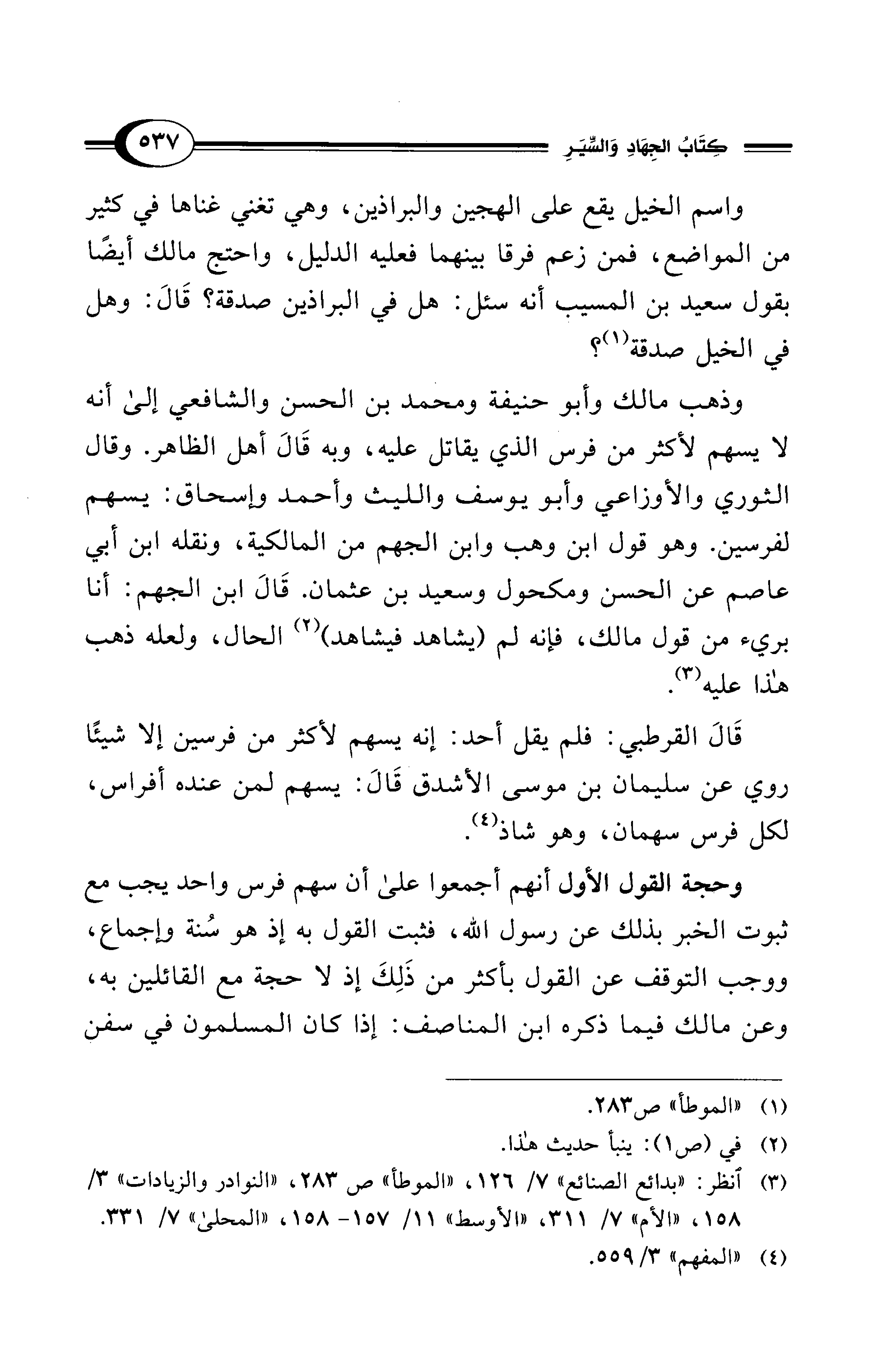 وذهب مالك وأبو حنيفة ومحمد بن الحسن والشافعي إلى أنه لا يسهم لأكثر من فرس الذي يقاتل عليه، وبه قَالَ أهل الظاهر. وقال الثوري والأوزاعي وأبو يوسف والليث وأحمد وإسحاق: يسهم لفرسين. وهو قول ابن وهب وابن الجهم من المالكية، ونقله ابن أبي عاصم عن الحسن ومكحول وسعيد بن عثمان. قَالَ ابن الجهم: أنا بريء من قول مالك، فإنه لم (يشاهد فيشاهد) (¬2) الحال، ولعله ذهب هذا عليه (¬3).