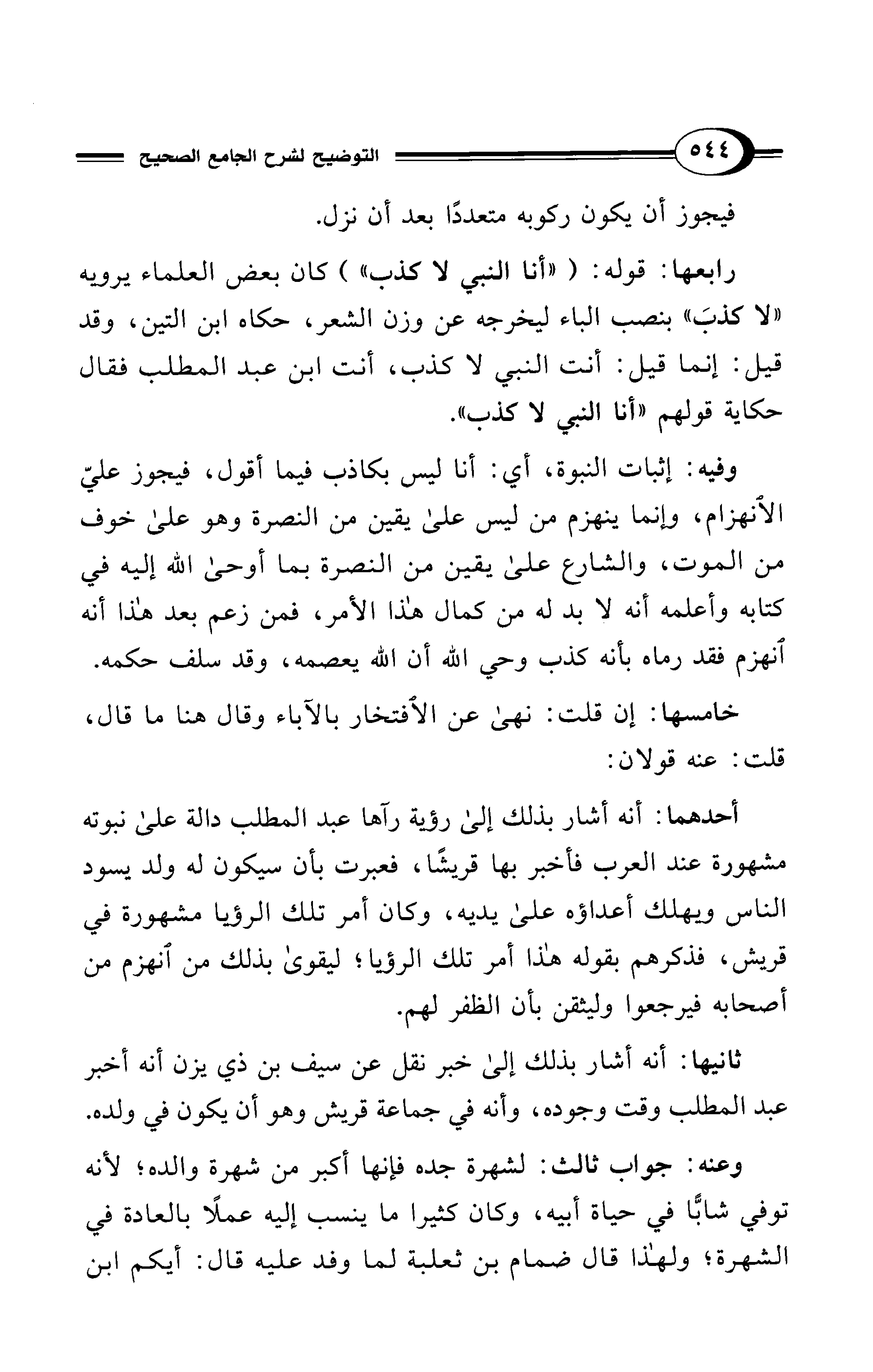 رابعها: قوله: ("أنا النبي لا كذب") كان بعض العلماء يرويه "لا كذبَ" بنصب الباء ليخرجه عن وزن الشعر، حكاه ابن التين، وقد قيل: إنما قيل: أنت النبي لا كذب، أنت ابن عبد المطلب فقال حكايته قولهم "أنا النبي لا كذب".
