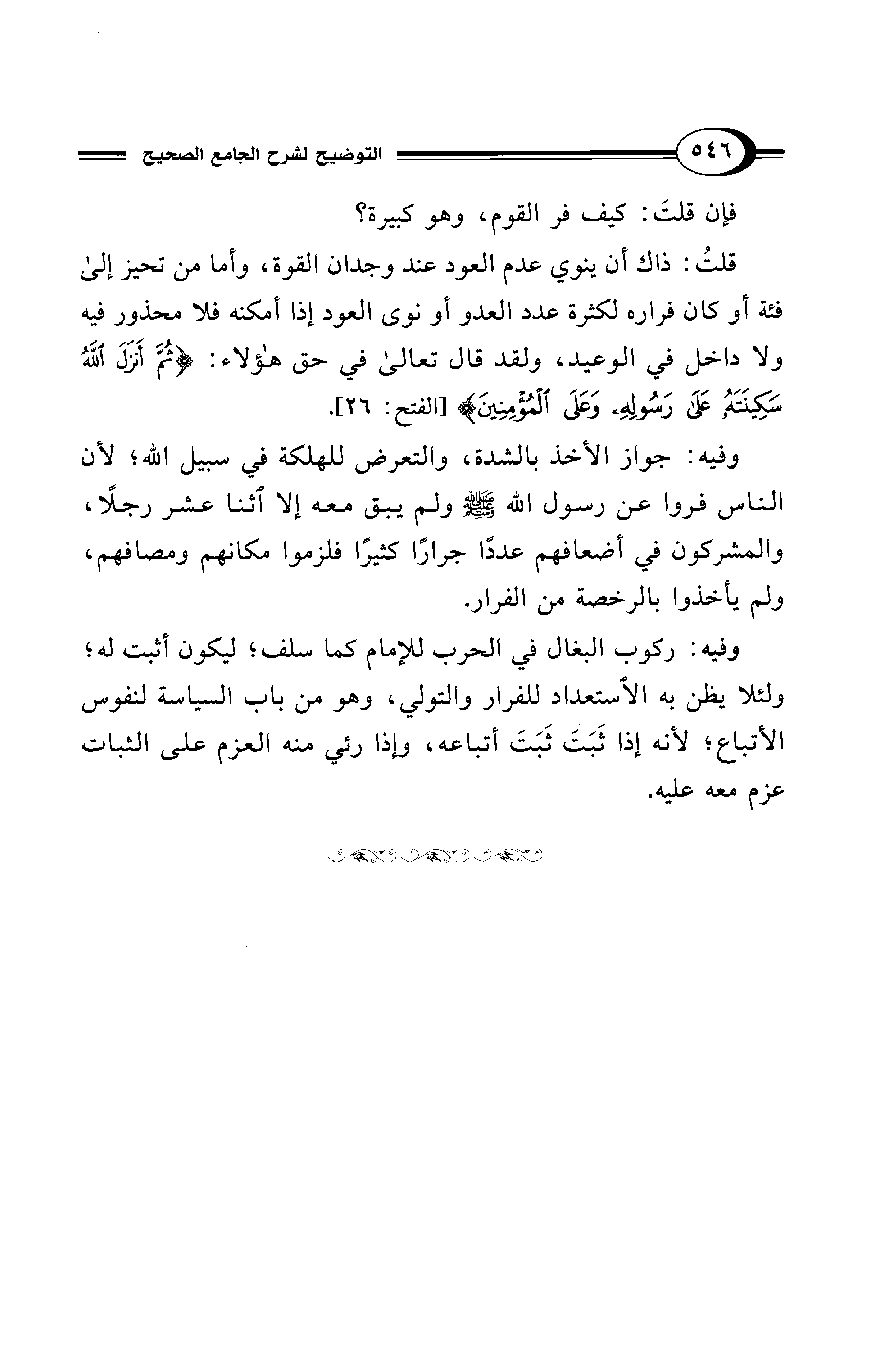 قلتُ: ذاك أن ينوي عدم العود عند وجدان القوة، وأما من تحيز إلى فئة أو كان فراره لكثرة عدد العدو أو نوى العود إذا أمكنه فلا محذور فيه ولا داخل في الوعيد، ولقد قال تعالى في حق هؤلاء: {ثُمَّ أَنْزَلَ الله سَكِينَتَهُ عَلَى رَسُولِهِ وَعَلَى الْمُؤْمِنِينَ} [الفتح: 26].