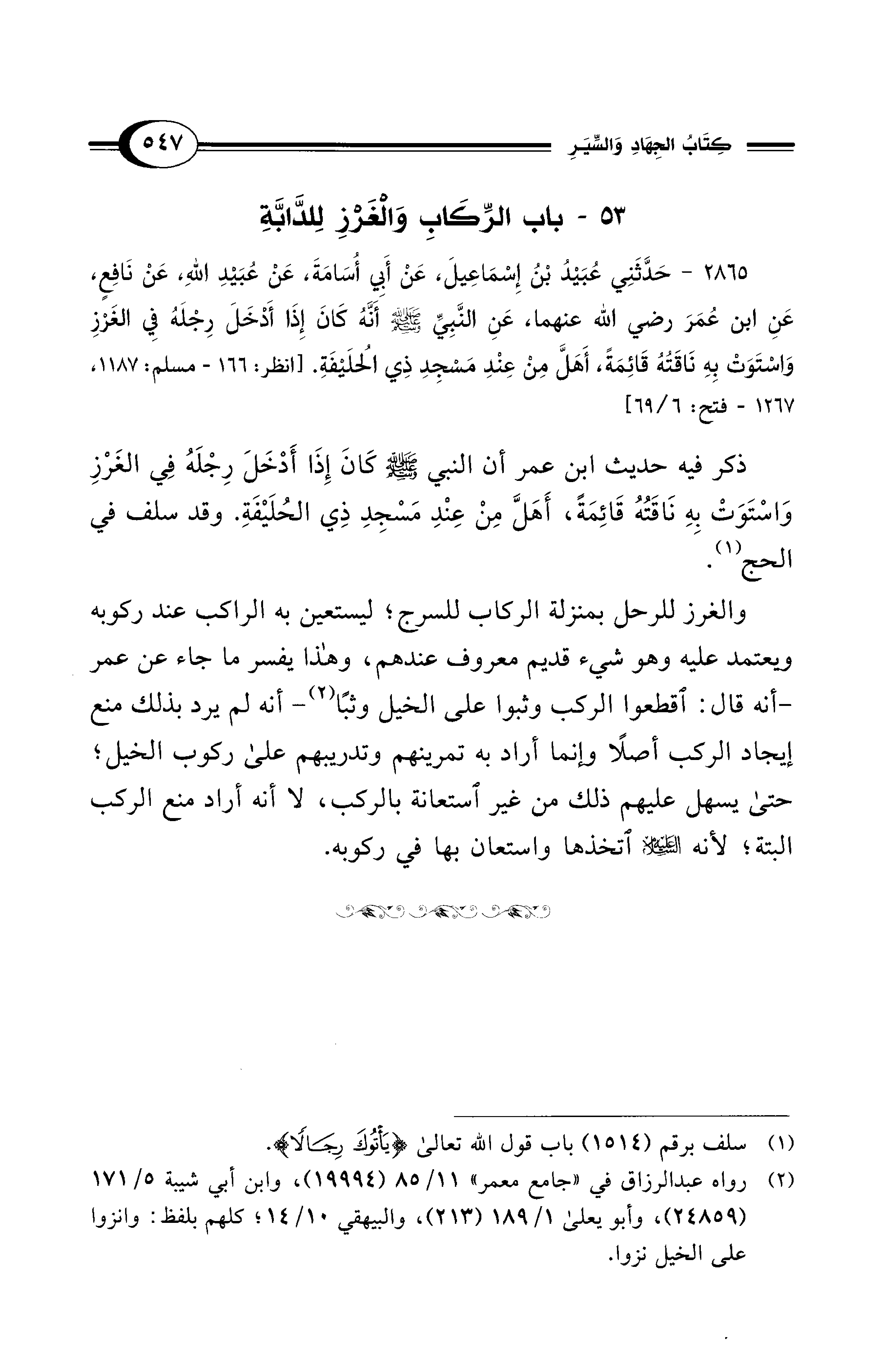 2865 - حَدَّثَنِي عُبَيْدُ بْنُ إِسْمَاعِيلَ، عَنْ أَبِي أُسَامَةَ، عَنْ عُبَيْدِ اللهِ، عَنْ نَافِعٍ، عَنِ ابْنِ عُمَرَ - رضي الله عنهما - عَنِ النَّبِيِّ - صلى الله عليه وسلم - أَنَّهُ كَانَ إِذَا أَدْخَلَ رِجْلَهُ فِي الغَرْزِ وَاسْتَوَتْ بِهِ نَاقَتُهُ قَائِمَةً، أَهَلَّ مِنْ عِنْدِ مَسْجِدِ ذِي الحُلَيْفَةِ. [انظر: 166 - مسلم: 1187، 1267 - فتح: 6/ 69]