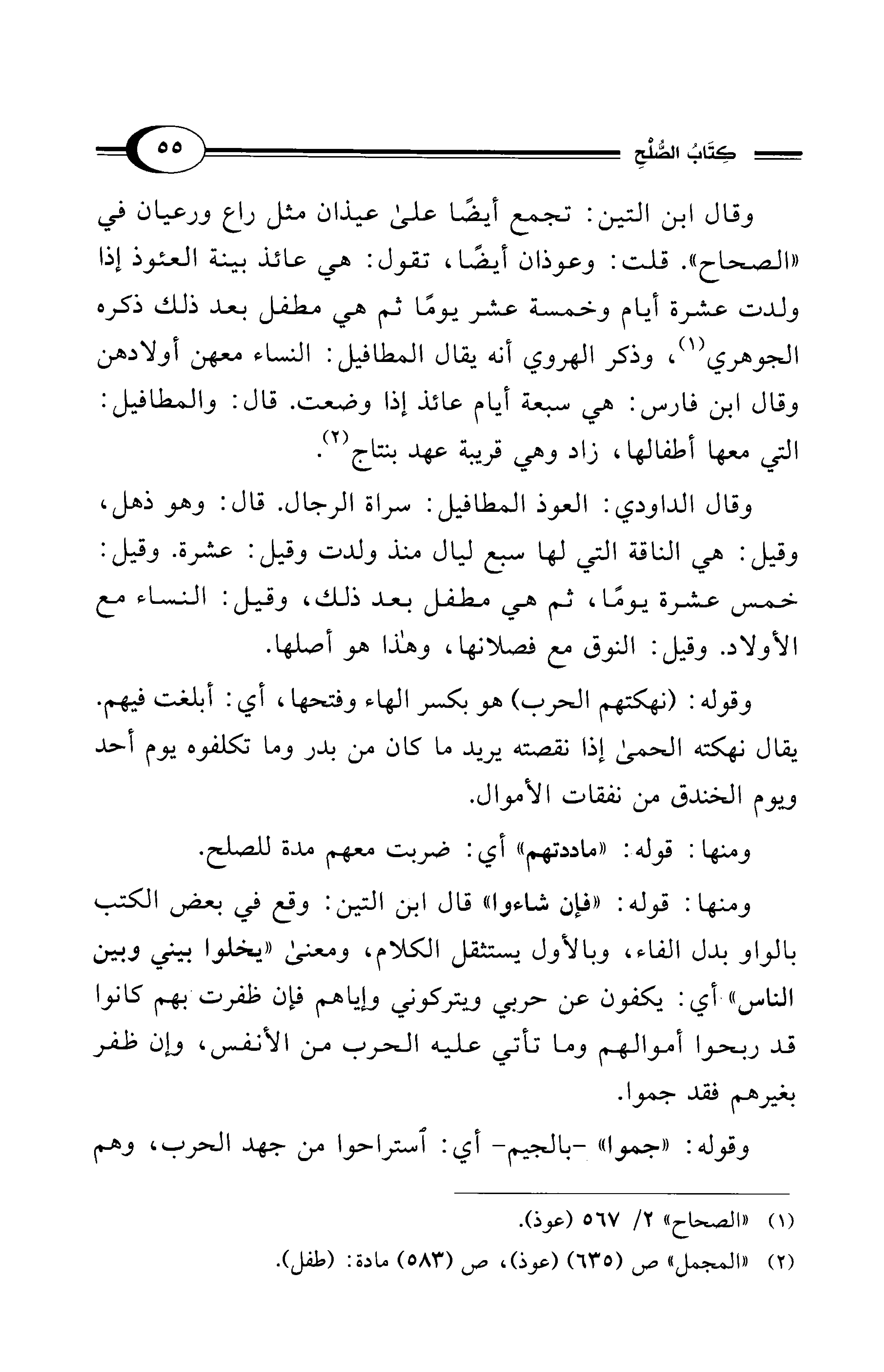 وقال الداودي: العوذ المطافيل: سراة الرجال. قال: وهو ذهل، وقيل: هي الناقة التي لها سبع ليال منذ ولدت وقيل: عشرة. وقيل: خمس عشرة يومًا، ثم هي مطفل بعد ذلك، وقيل: النساء مع الأولاد. وقيل: النوق مع فصلانها، وهذا هو أصلها.