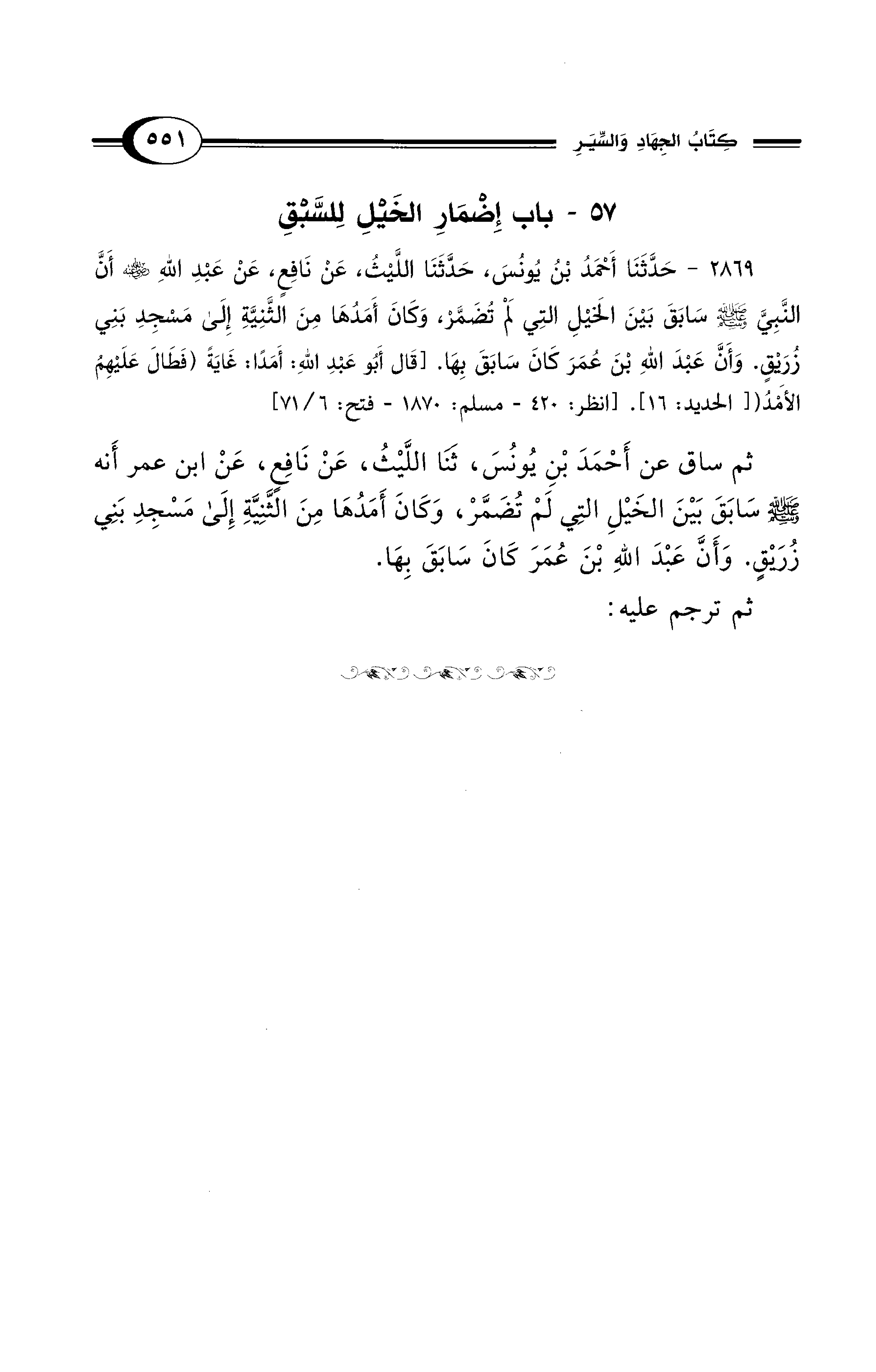 2869 - حَدَّثَنَا أَحْمَدُ بْنُ يُونُسَ، حَدَّثَنَا اللَّيْثُ، عَنْ نَافِعٍ، عَنْ عَبْدِ اللهِ -رضي الله عنه - أَنَّ النَّبِيَّ - صلى الله عليه وسلم - سَابَقَ بَيْنَ الخَيْلِ الَّتِي لَمْ تُضَمَّرْ، وَكَانَ أَمَدُهَا مِنَ الثَّنِيَّةِ إِلَى مَسْجِدِ بَنِي زُرَيْقٍ. وَأَنَّ عَبْدَ اللهِ بْنَ عُمَرَ كَانَ سَابَقَ بِهَا. [قَال أَبُو عَبْد اللهِ: أَمَدًا: غَايَةً {فَطَالَ عَلَيْهِمْ الأمْدُ} [الحديد: 16]. [انظر: 420 - مسلم: 1870 - فتح: 6/ 71]