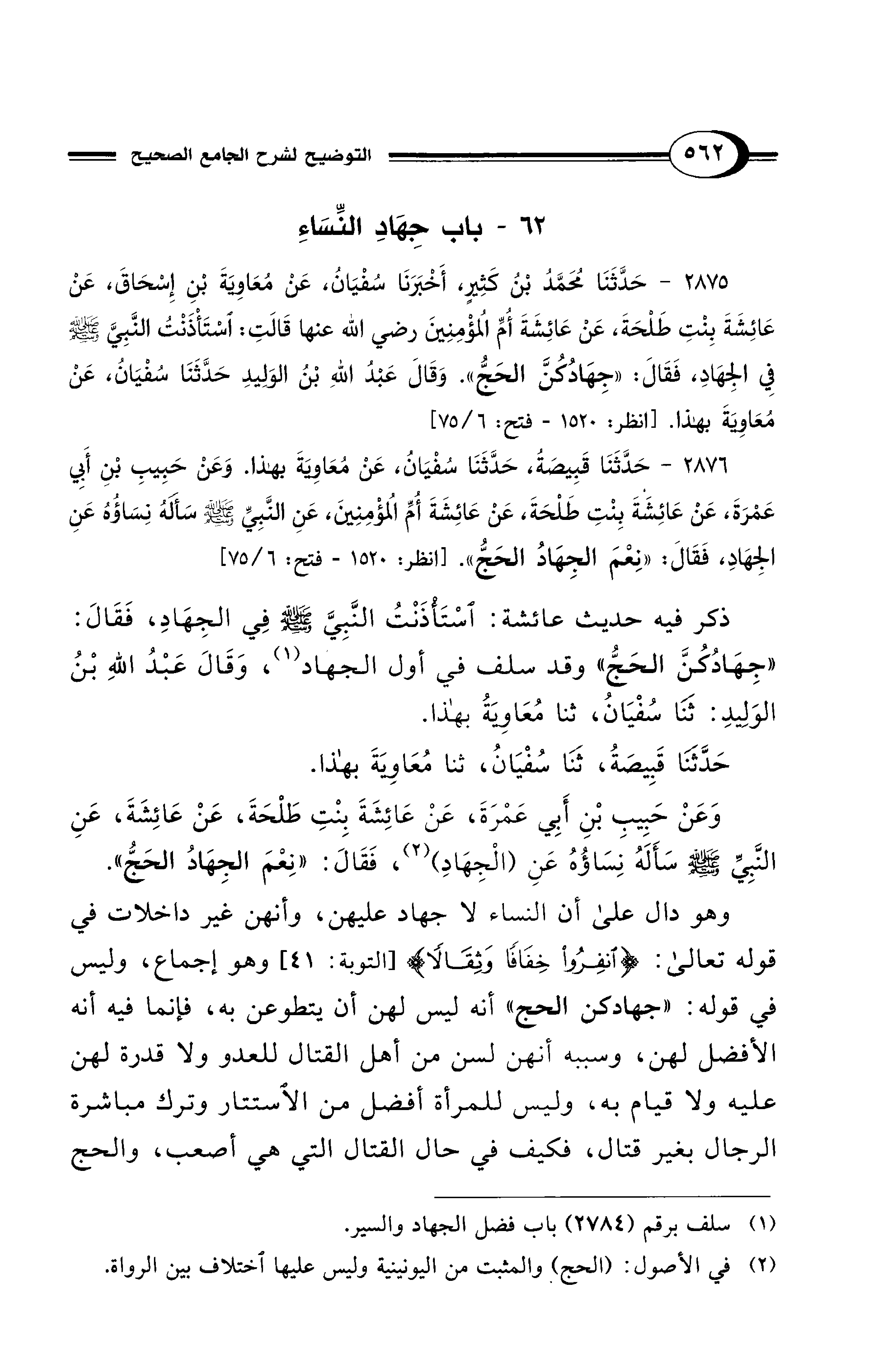 2876 - حَدَّثَنَا قَبِيصَةُ، حَدَّثَنَا سُفْيَانُ، عَنْ مُعَاوِيَةَ بِهَذَا. وَعَنْ حَبِيبِ بْنِ أَبِي عَمْرَةَ، عَنْ عَائِشَةَ بِنْتِ طَلْحَةَ، عَنْ عَائِشَةَ أُمِّ الْمُؤْمِنِينَ، عَنِ النَّبِيِّ - صلى الله عليه وسلم - سَأَلَهُ نِسَاؤُهُ عَنِ الجِهَادِ فَقَالَ: "نِعْمَ الْجِهَادُ الْحَجُّ". [انظر: 1520 - فتح: 6/ 75]
