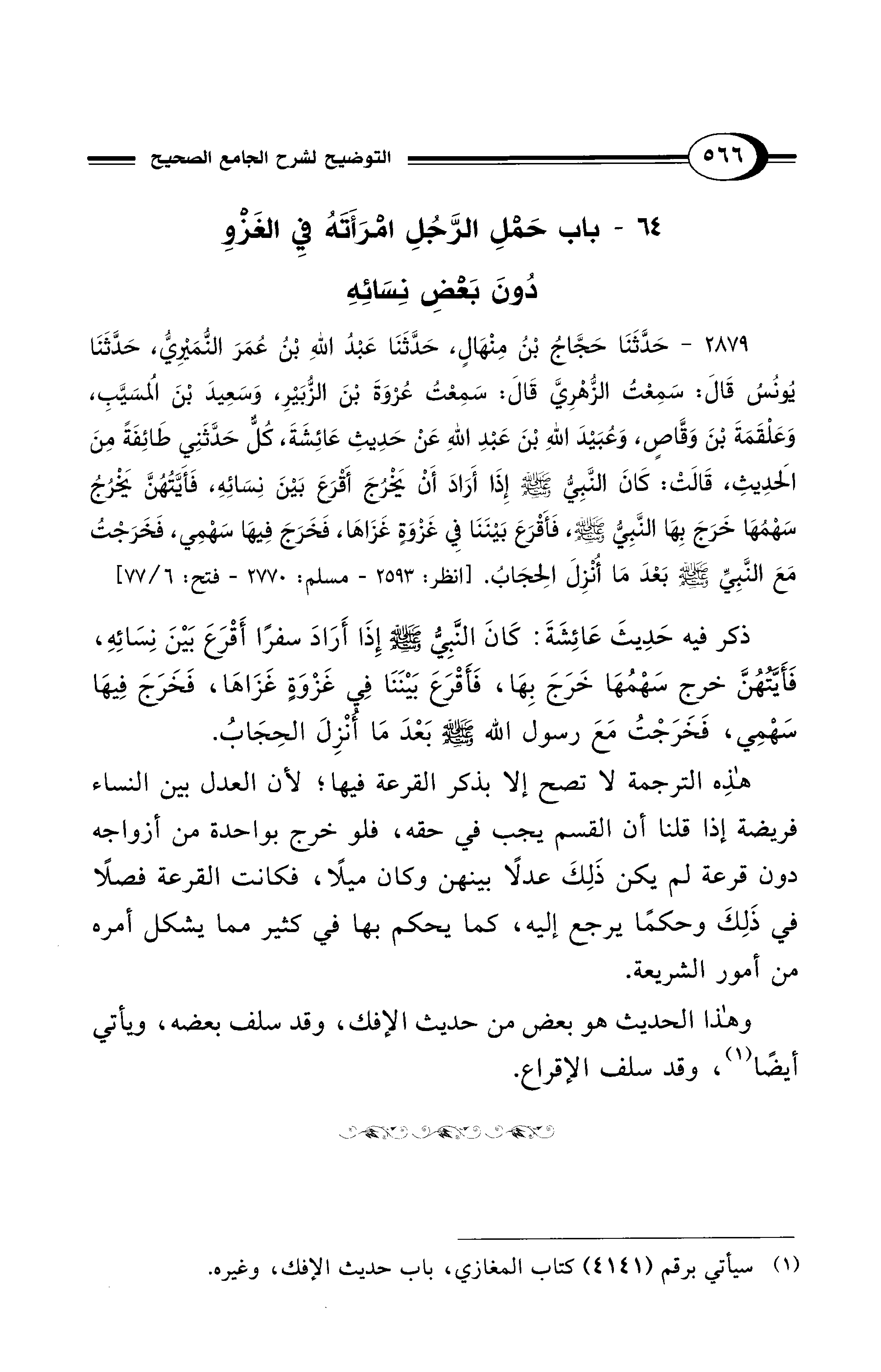 ذكر فيه حَدِيثَ عَائِشَةَ: كَانَ النَّبِيُّ - صلى الله عليه وسلم - إذاً أَرَادَ سفرًا أَقْرَعَ بَيْنَ نِسَائِهِ، فَأَيّتُهُنَّ خرج سَهْمُهَا خَرَجَ بِهَا، فَأَقْرَعَ بَيْنَنَا فِي غَزْوَةٍ غَزَاهَا، فَخَرَجَ فِيهَا سَهْمِي، فَخَرَجْتُ مَعَ رسول الله - صلى الله عليه وسلم - بَعْدَ مَا أُنْزِلَ الحِجَابُ.