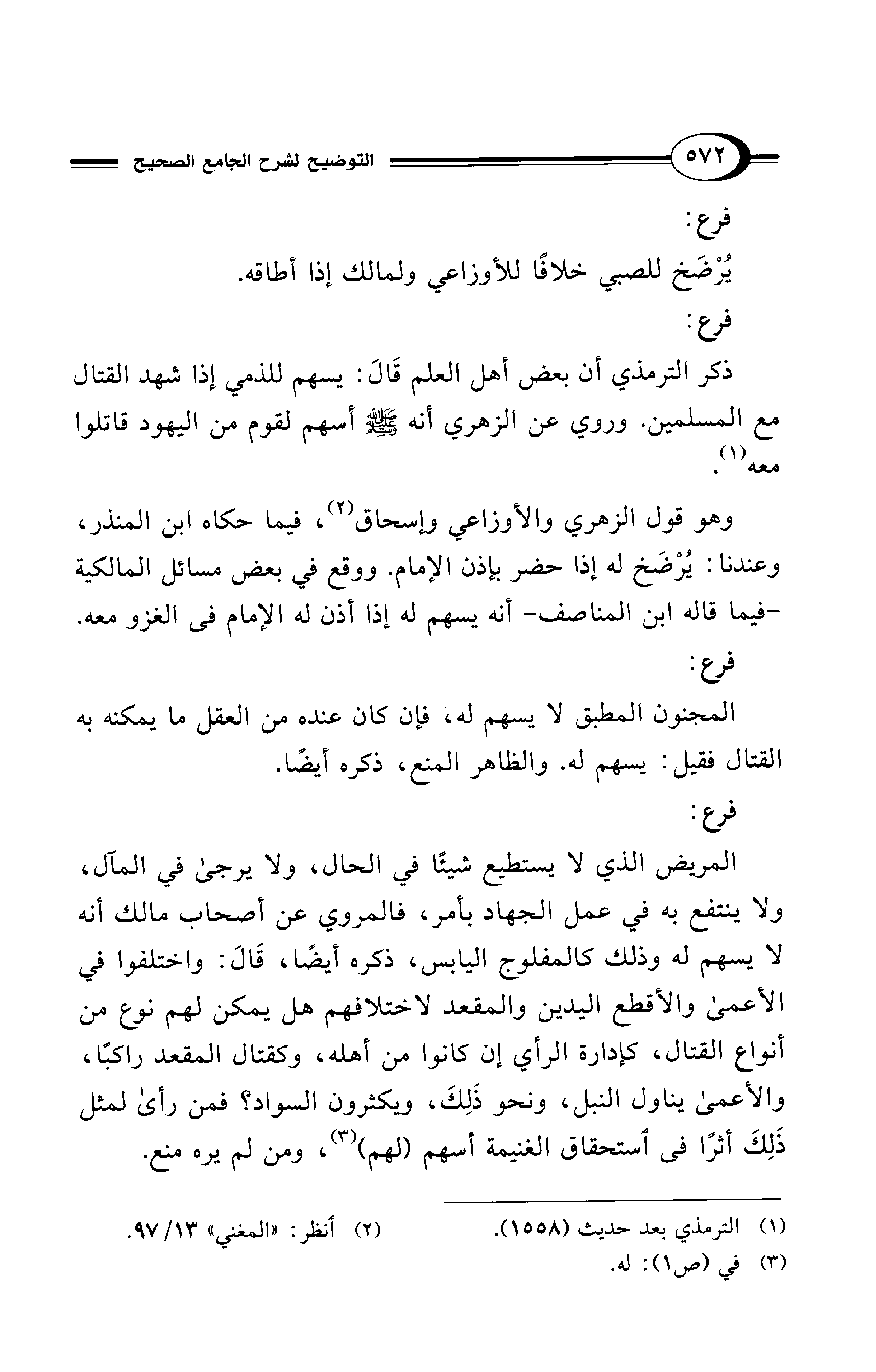 المريض الذي لا يستطيع شيئًا في الحال، ولا يرجى في المآل، ولا ينتفع به في عمل الجهاد بأمر، فالمروي عن أصحاب مالك أنه لا يسهم له وذلك كالمفلوج اليابس، ذكره أيضًا، قَالَ: واختلفوا في الأعمى والأقطع اليدين والمقعد لاختلافهم هل يمكن لهم نوع من أنواع القتال، كإدارة الرأي إن كانوا من أهله، وكقتال المقعد راكبًا، والأعمى يناول النبل، ونحو ذَلِكَ، ويكثرون السواد؟ فمن رأى لمثل ذَلِكَ أثرًا في استحقاق الغنيمة أسهم (لهم) (¬3)، ومن لم يره منع.