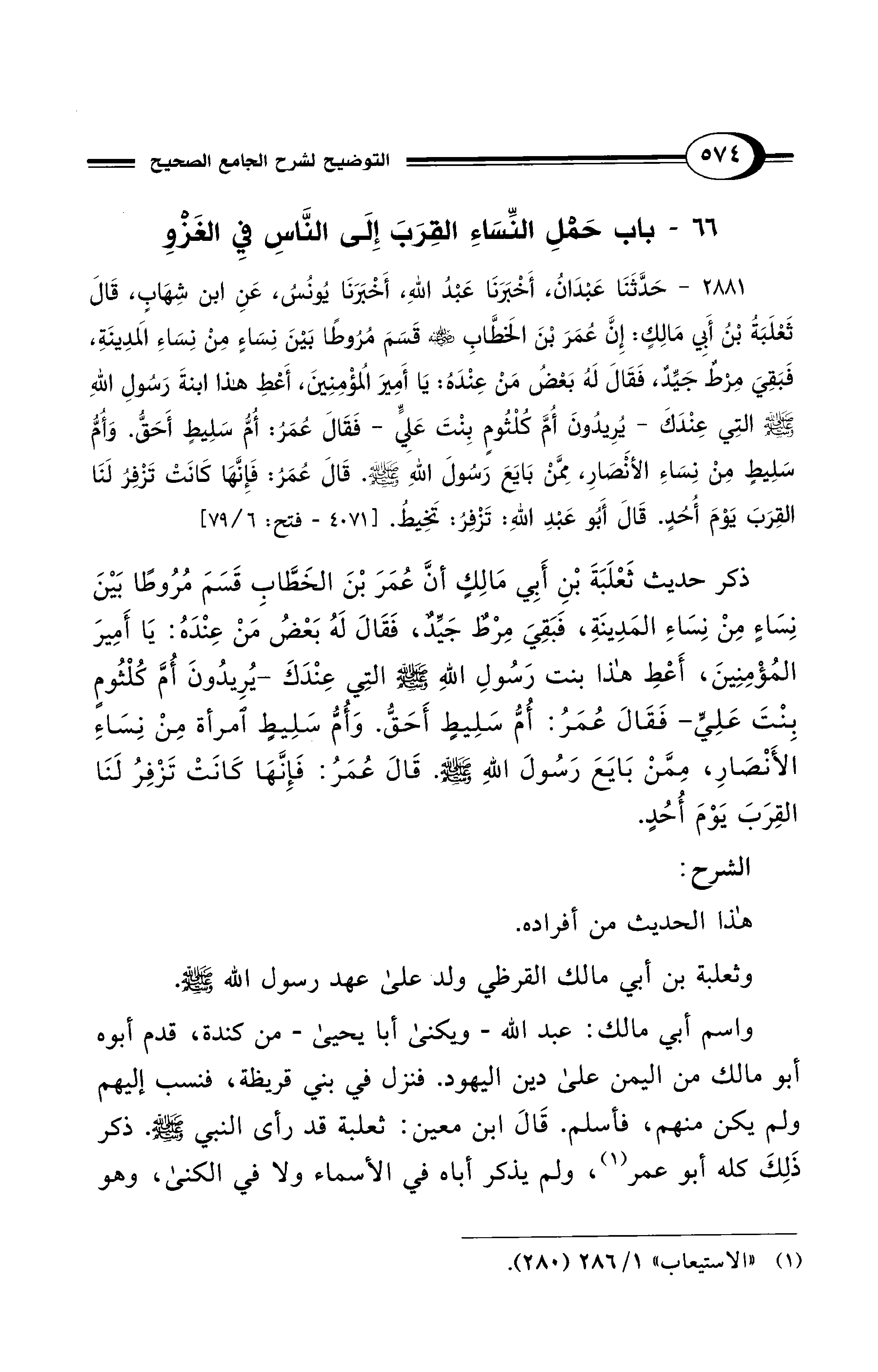 2881 - حَدَّثَنَا عَبْدَانُ، أَخْبَرَنَا عَبْدُ اللهِ، أَخْبَرَنَا يُونُسُ، عَنِ ابْنِ شِهَابٍ، قَالَ ثَعْلَبَةُ بْنُ أَبِي مَالِكٍ: إِنَّ عُمَرَ بْنَ الْخَطَّابِ - رضي الله عنه - قَسَمَ مُرُوطًا بَيْنَ نِسَاءٍ مِنْ نِسَاءِ الْمَدِينَةِ، فَبَقِىَ مِرْطٌ جَيِّدٌ فَقَالَ لَهُ بَعْضُ مَنْ عِنْدَهُ: يَا أَمِيرَ الْمُؤْمِنِينَ، أَعْطِ هَذَا ابْنَةَ رَسُولِ اللهِ - صلى الله عليه وسلم - التِي عِنْدَكَ. يُرِيدُونَ أُمَّ كُلْثُومٍ بِنْتَ عَلِيٍّ. فَقَالَ عُمَرُ: أُمُّ سَلِيطٍ أَحَقُّ. وَأُمُّ سَلِيطٍ مِنْ نِسَاءِ الأَنْصَارِ، مِمَّنْ بَايَعَ رَسُولَ اللهِ - صلى الله عليه وسلم -. قَالَ عُمَرُ: فَإِنَّهَا كَانَتْ تَزْفِرُ لَنَا الْقِرَبَ يَوْمَ أُحُدٍ. قَالَ أَبُو عَبْدِ اللهِ: تَزْفِرُ: تَخِيطُ. [4071 - فتح: 6/ 79]
