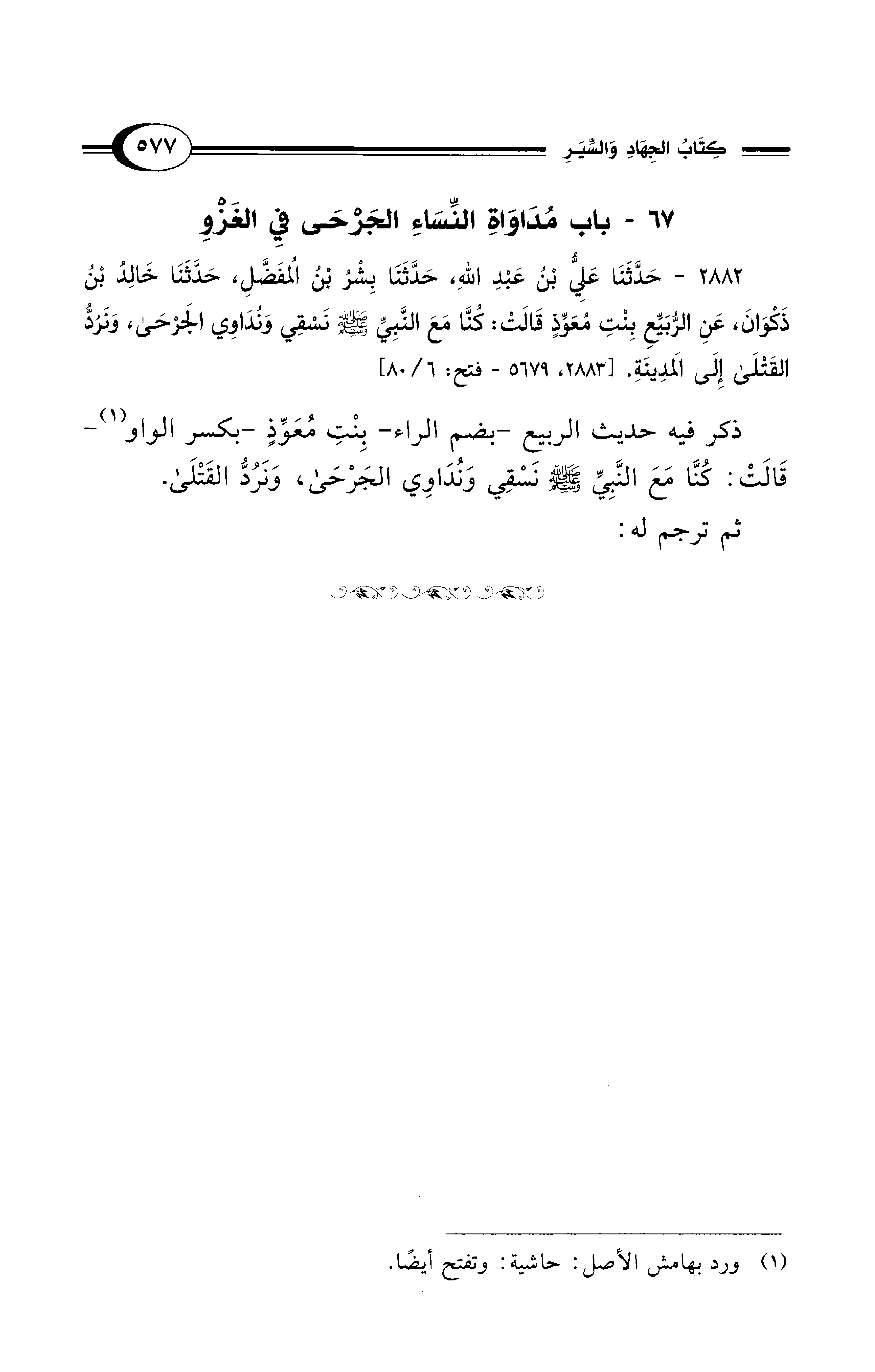 2882 - حَدَّثَنَا عَلِيُّ بْنُ عَبْدِ اللهِ، حَدَّثَنَا بِشْرُ بْنُ الْمُفَضَّلِ، حَدَّثَنَا خَالِدُ بْنُ ذَكْوَانَ، عَنِ الرُّبَيِّعِ بِنْتِ مُعَوِّذٍ قَالَتْ: كُنَّا مَعَ النَّبِيِّ - صلى الله عليه وسلم - نَسْقِي وَنُدَاوِي الجَرْحَى، وَنَرُدُّ القَتْلَى إِلَى المَدِينَةِ. [2883، 5679 - فتح: 6/ 80]