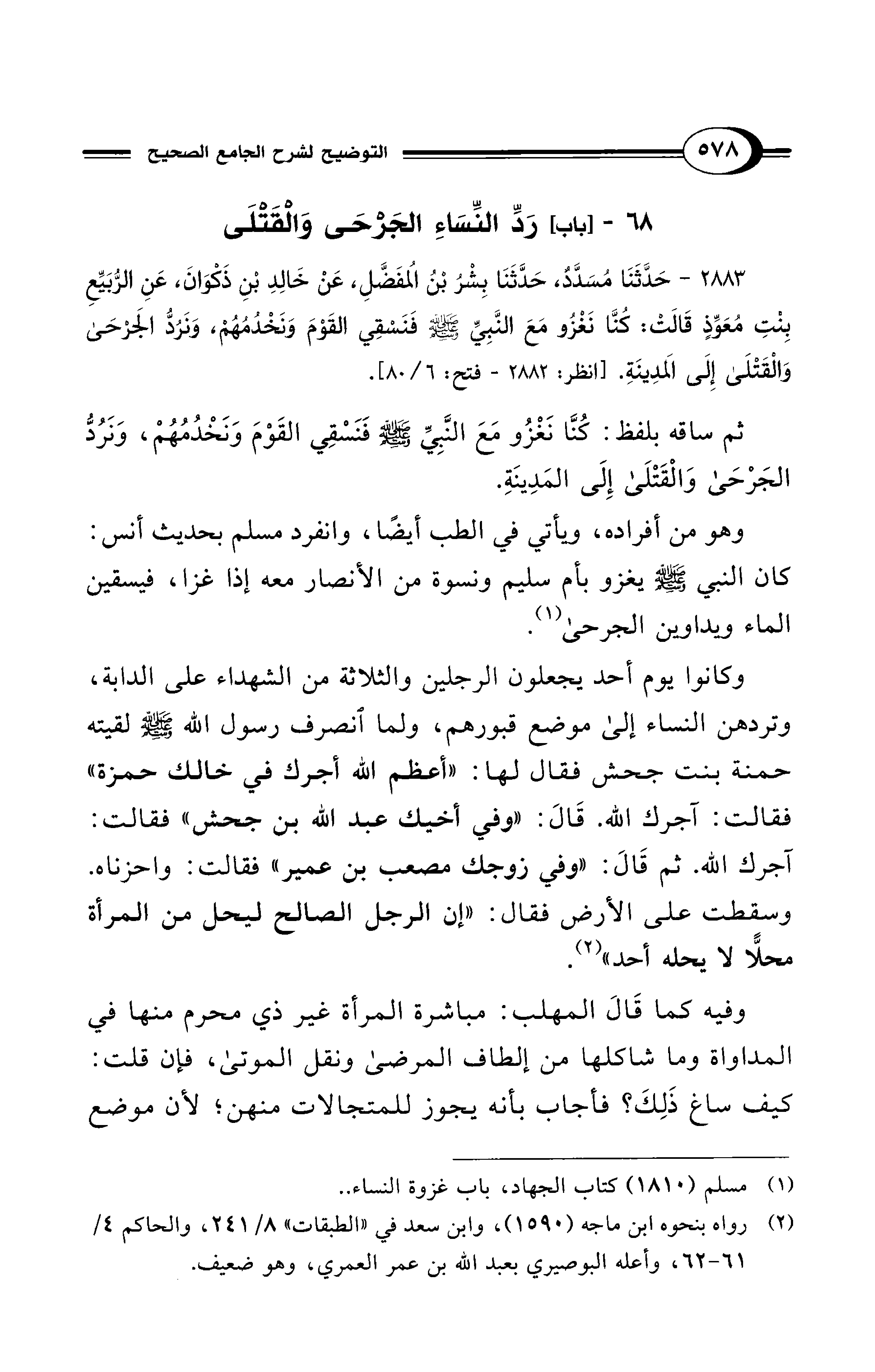 2883 - حَدَّثَنَا مُسَدَّدٌ، حَدَّثَنَا بِشْرُ بْنُ المُفَضَّلِ، عَنْ خَالِدِ بْنِ ذَكْوَانَ، عَنِ الرُّبَيِّعِ بِنْتِ مُعَوِّذٍ قَالَتْ: كُنَّا نَغْزُو مَعَ النَّبِيِّ - صلى الله عليه وسلم - فَنَسْقِي الْقَوْمَ وَنَخْدُمُهُمْ، وَنَرُدُّ الجَرْحَى وَالْقَتْلَى إِلَى المَدِينَةِ. [انظر: 2882 - فتح: 6/ 80].