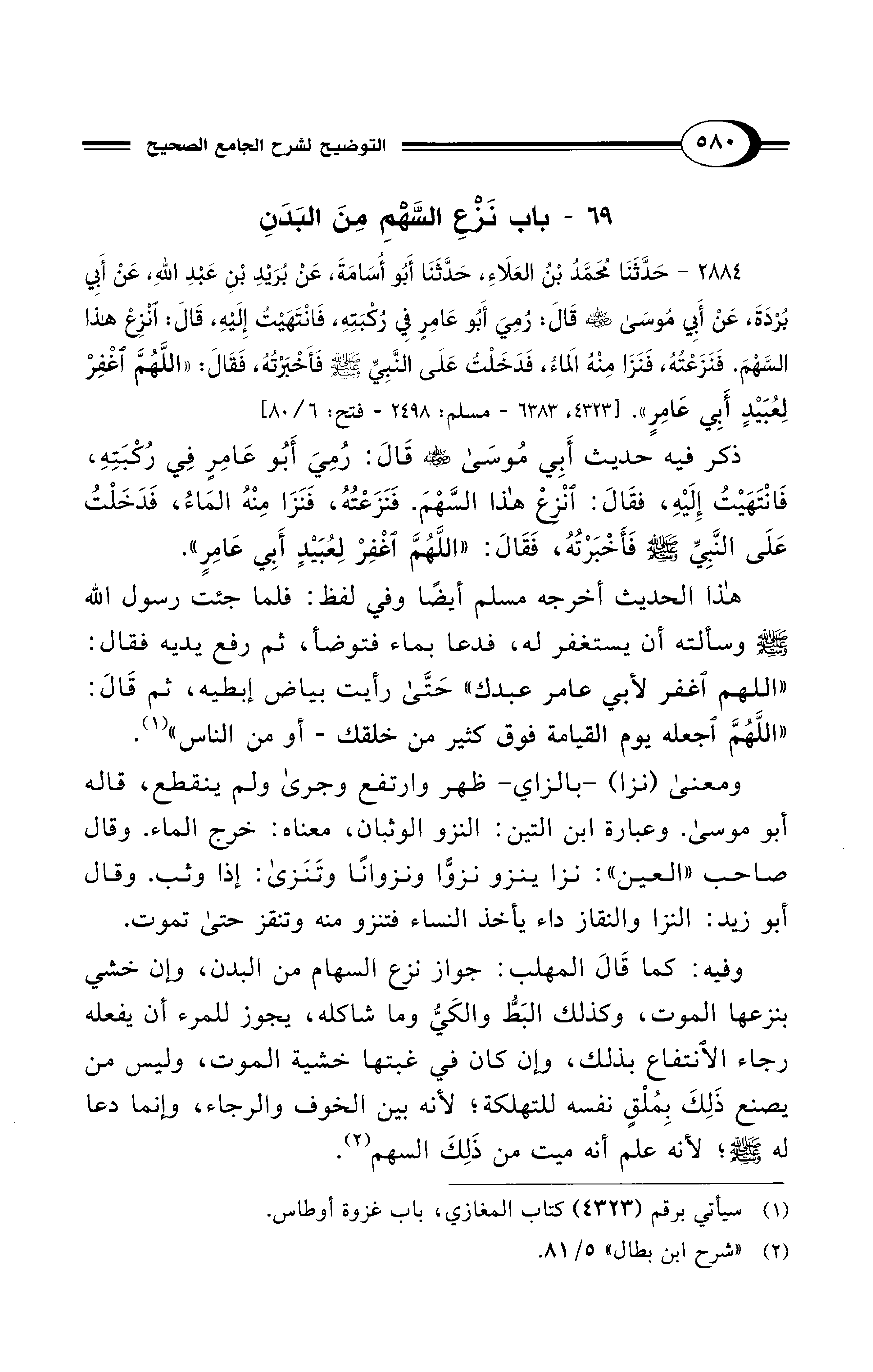 2884 - حَدَّثَنَا مُحَمَّدُ بْنُ العَلاَءِ، حَدَّثَنَا أَبُو أُسَامَةَ، عَنْ بُرَيْدِ بْنِ عَبْدِ اللهِ، عَنْ أَبِي بُرْدَةَ، عَنْ أَبِي مُوسَى - رضي الله عنه - قَالَ: رُمِىَ أَبُو عَامِرٍ في رُكْبَتِهِ، فَانْتَهَيْتُ إِلَيْهِ، قَالَ: انْزِعْ هَذَا السَّهْمَ. فَنَزَعْتُهُ، فَنَزَا مِنْهُ الْمَاءُ، فَدَخَلْتُ عَلَى النَّبِيِّ - صلى الله عليه وسلم - فَأَخْبَرْتُهُ، فَقَالَ: "اللَّهُمَّ اغْفِرْ لِعُبَيْدٍ أَبِي عَامِرٍ". [4323، 6383 - مسلم: 2498 - فتح: 6/ 80]