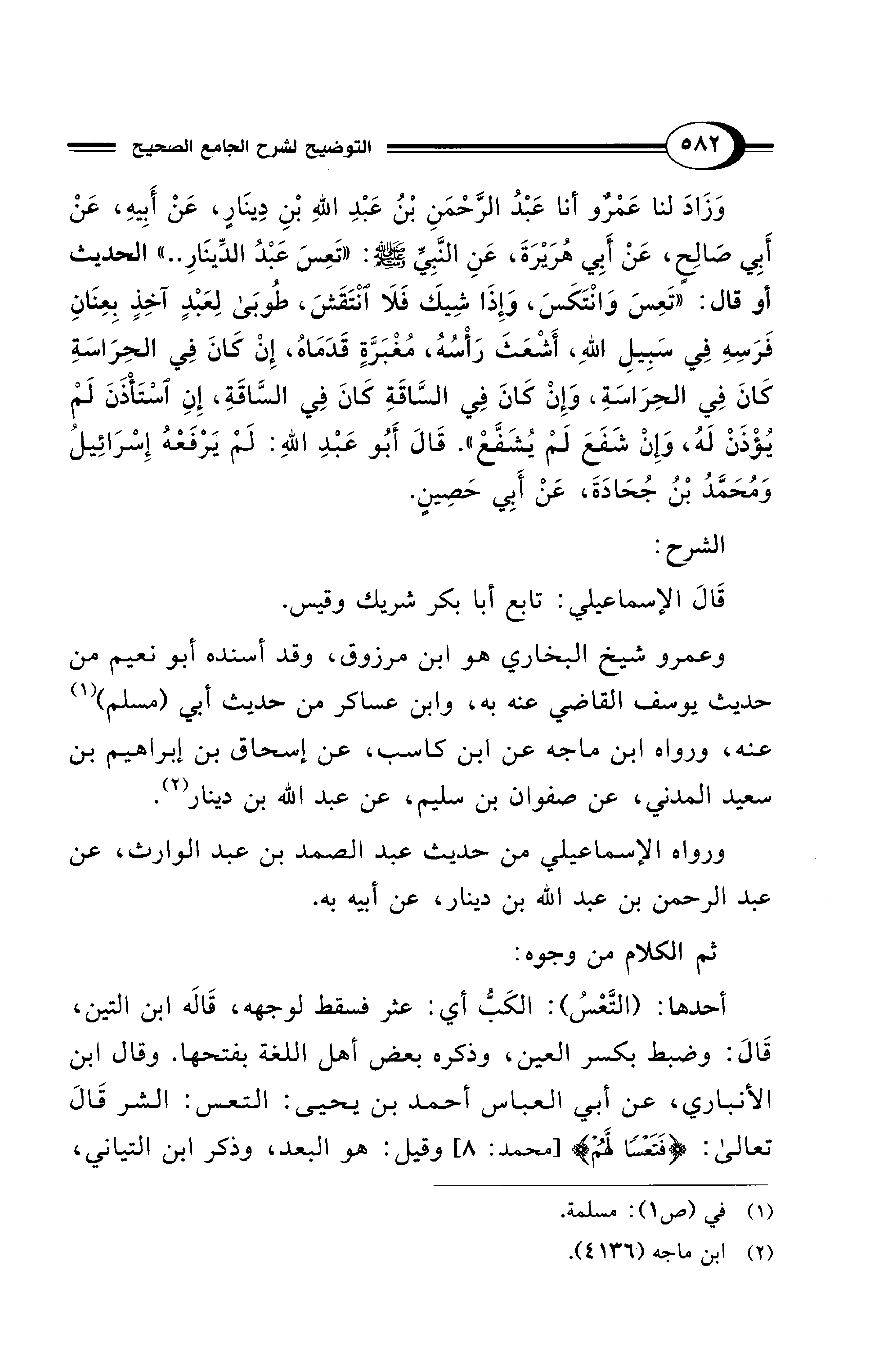 وَزَادَ لنا عَمْرٌو أنا عَبْدُ الرَّحْمَنِ بْنُ عَبْدِ اللهِ بْنِ دِينَارٍ، عَنْ أَبِيهِ، عَنْ أَبِي صَالِحٍ، عَنْ أَبِي هُرَيْرَةَ، عَنِ النَّبِيِّ - صلى الله عليه وسلم -: "تَعِسَ عَبْدُ الدِّينَارِ .. " الحديث أو قال: "تَعِسَ وَانْتَكَسَ، وَإِذَا شِيكَ فَلَا انْتَقَشَ، طُوبَى لِعَبْدٍ آخِذٍ بِعِنَانِ فَرَسِهِ فِي سَبِيلِ اللهِ، أَشْعَثَ رَأْسُهُ، مُغْبَرَّةٍ قَدَمَاهُ، إِنْ كَانَ فِي الحِرَاسَةِ كَانَ فِي الحِرَاسَةِ، وَإِنْ كَانَ فِي السَّاقَةِ كَانَ فِي السَّاقَةِ، إِنِ اسْتَأْذَنَ لَمْ يُؤْذَنْ لَهُ، وَإِنْ شَفَعَ لَمْ يُشَفَّعْ". قَالَ أَبُو عَبْدِ اللهِ: لَمْ يَرْفَعْهُ إِسْرَائِيلُ وَمُحَمَّدُ بْنُ جُحَادَةَ، عَنْ أَبِي حَصينٍ.